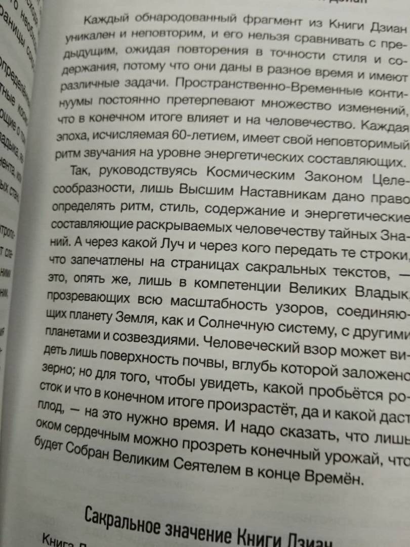 ОписаниеВ эти трудные времена задаётесь ли вы вопросом, что ожидает человечество в будущем? Хотите ли вы узнать о вашем истинном предназначении как на Земле, так и во всей Вселенной?Древнейший манускрипт в мире, известный как сокровенная Книга Дзиан, содержит ответы на все ваши глубинные вопросы. Написанная на мистическом языке Богов, Сензаре, она тайно хранится в самом сердце неприступных Гималаев и раскрывает свои страницы лишь единицам избранных в тот момент, когда человечество стоит на грани наиважнейшего выбора в своей истории.Впервые вашему вниманию представлен новый фрагмент из таинственной Книги Дзиан, который разворачивает картины не только нашего прошлого и настоящего, но и будущего. Чтобы облегчить ваше понимание этого простого, но в то же время удивительно глубокого текста, был составлен Глоссарий, тщательно собранный из источников высшей мудрости.Читая эту книгу, вы сможете постичь как свой собственный путь во Вселенной, так и духовную эволюцию всего человечества вне времени и пространства, а также:- понять все процессы, происходящие сейчас в мире: от стихийных бедствий и глобального потепления до военных конфликтов и эпидемий;- узнать, что на самом деле произошло в 1999 и 2012 годах и какое великое событие незаметно свершилось в 2017 году;- раскрыть тайны Страшного суда, Второго Пришествия Христа, Армагеддона, силы Любви, сердца, мысли, философского камня, бессмертия и многого другого.Когда-то всеобъемлющая и неискажённая Истина, представленная здесь, была доступна лишь Посвящённым древних цивилизаций, которые жертвовали своими жизнями ради неё. Однако теперь она доступна каждому искателю на страницах "Книги Тайной Мудрости".СвернутьВ эти трудные времена задаётесь ли вы вопросом, что ожидает человечество в будущем? Хотите ли вы узнать о вашем истинном предназначении как на Земле, так и во всей Вселенной?Древнейший манускрипт в мире, известный как сокровенная Книга Дзиан, содержит ответы на все ваши глубинные вопросы. Написанная на мистическом языке Богов, Сензаре, она тайно хранится в самом сердце неприступных Гималаев и раскрывает свои страницы лишь единицам избранных в тот момент, когда человечество стоит на грани наиважнейшего выбора в своей истории.Впервые вашему вниманию представлен новый фрагмент из таинственной Книги Дзиан, который разворачивает картины не только нашего прошлого и настоящего, но и будущего. Чтобы облегчить ваше понимание этого простого, но в то же время удивительно глубокого текста, был составлен Глоссарий, тщательно собранный из источников высшей мудрости.Читая эту книгу, вы сможете постичь как свой собственный путь во Вселенной, так и духовную эволюцию всего человечества вне времени и пространства, а также:- понять все процессы, происходящие сейчас в мире: от стихийных бедствий и глобального потепления до военных конфликтов и эпидемий;- узнать, что на самом деле произошло в 1999 и 2012 годах и какое великое событие незаметно свершилось в 2017 году;- раскрыть тайны Страшного суда, Второго Пришествия Христа, Армагеддона, силы Любви, сердца, мысли, философского камня, бессмертия и многого другого.Когда-то всеобъемлющая и неискажённая Истина, представленная здесь, была доступна лишь Посвящённым древних цивилизаций, которые жертвовали своими жизнями ради неё. Однако теперь она доступна ка