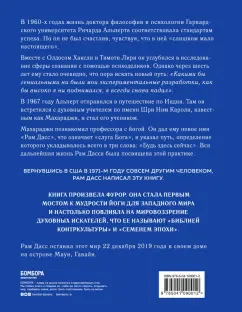 ОписаниеВ 1960-х годах жизнь доктора философии и психологии Гарвардского университета Ричарда Альперта соответствовала всем стандартам успеха. Но он не был счастлив, чувствуя, что в ней "слишком мало настоящего". Вместе с Олдосом Хаксли и Тимоти Лири он углубился в исследование сферы сознания с помощью психоделиков. Однако через шесть лет понял, что нужно искать другой путь: "какими бы гениальными ни были мои экспериментальные разработки, как бы высоко я ни поднимался, я всегда снова падал". В 1967-м году Альперт уволился из университета и отправился в путешествие по Индии. Там он встретил духовного учителя по имени Шри Ним Кароли Баба, известного как Махараджи, и стал его учеником. Махараджи познакомил профессора с йогой. Он дал ему новое имя "Рам Дасс", что означает "слуга Бога", и указал путь, определение которого укладывалось всего в три слова: "Будь здесь сейчас". Вся дальнейшая жизнь Рам Дасса была посвящена этой практике.Вернувшись в США в 1971-м году совсем другим человеком, Рам Дасс написал эту книгу.Книга произвела фурор. Она стала первым мостом к мудрости йоги для западного мира и настолько повлияла на мировоззрение духовных искателей, что ее называют "Библией контркультуры" и "семенем эпохи".Рам Дасс оставил этот мир 22 декабря 2019 года в своем доме на острове Мауи, Гавайи.СвернутьВ 1960-х годах жизнь доктора философии и психологии Гарвардского университета Ричарда Альперта соответствовала всем стандартам успеха. Но он не был счастлив, чувствуя, что в ней "слишком мало настоящего". Вместе с Олдосом Хаксли и Тимоти Лири он углубился в исследование сферы сознания с помощью психоделиков. Однако через шесть лет понял, что нужно искать другой путь: "какими бы гениальными ни были мои экспериментальные разработки, как бы высоко я ни поднимался, я всегда снова падал". В 1967-м году Альперт уволился из университета и отправился в путешествие по Индии. Там он встретил духовного учителя по имени Шри Ним Кароли Баба, известного как Махараджи, и стал его учеником. Махараджи познакомил профессора с йогой. Он дал ему новое имя "Рам Дасс", что означает "слуга Бога", и указал путь, определение которого укладывалось всего в три слова: "Будь здесь сейчас". Вся дальнейшая жизнь Рам Дасса была посвящена этой практике.Вернувшись в США в 1971-м году совсем другим человеком, Рам Дасс написал эту книгу.Книга произвела фурор. Она стала первым мостом к мудрости йоги для западного мира и настолько повлияла на мировоззрение духовных искателей, что ее называют "Библией контркультуры" и "семенем эпохи".Рам Дасс оставил этот мир 22 декабря 2019 года в своем доме на острове Мауи, Гавайи.СвернутьСвернуть