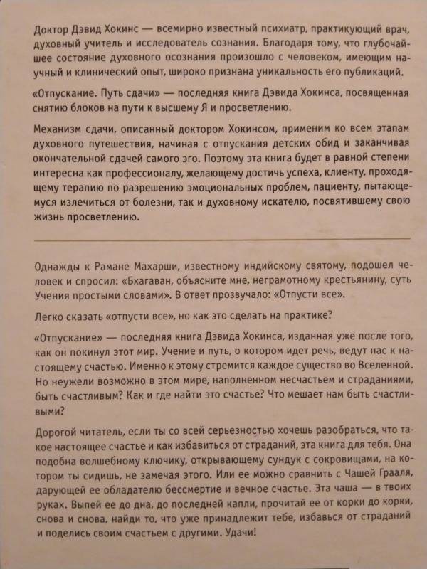 ОписаниеДоктор Дэвид Хокинс - всемирно известный психиатр, практикующий врач, духовный учитель и исследователь сознания. Благодаря тому, что глубочайшее состояние духовного осознания произошло с человеком, имеющим научный и клинический опыт, широко признана уникальность его публикаций."Отпускание. Путь сдачи" - последняя книга Дэвида Хокинса, посвященная снятию блоков на пути к высшему Я и просветлению.Механизм сдачи, описанный доктором Хокинсом, применим ко всем этапам духовного путешествия, начиная с отпускания детских обид и заканчивая окончательной сдачей самого эго. Поэтому эта книга будет в равной степени интересна как профессионалу, желающему достичь успеха, клиенту, проходящему терапию по разрешению эмоциональных проблем, пациенту, пытающемуся излечиться от болезни, так и духовному искателю, посвятившему свою жизнь просветлению.Доктор Дэвид Хокинс - всемирно известный психиатр, практикующий врач, духовный учитель и исследователь сознания. Благодаря тому, что глубочайшее состояние духовного осознания произошло с человеком, имеющим научный и клинический опыт, широко признана уникальность его публикаций."Отпускание. Путь сдачи" - последняя книга Дэвида Хокинса, посвященная снятию блоков на пути к высшему Я и просветлению.Механизм сдачи, описанный доктором Хокинсом, применим ко всем этапам духовного путешествия, начиная с отпускания детских обид и заканчивая окончательной сдачей самого эго. Поэтому эта книга будет в равной степени интересна как профессионалу, желающему достичь успеха, клиенту, проходящему терапию по разрешению эмоциональных проблем, пациенту, пытающемуся излечиться от болезни, так и духовному искателю, посвятившему свою жизнь просветлению.