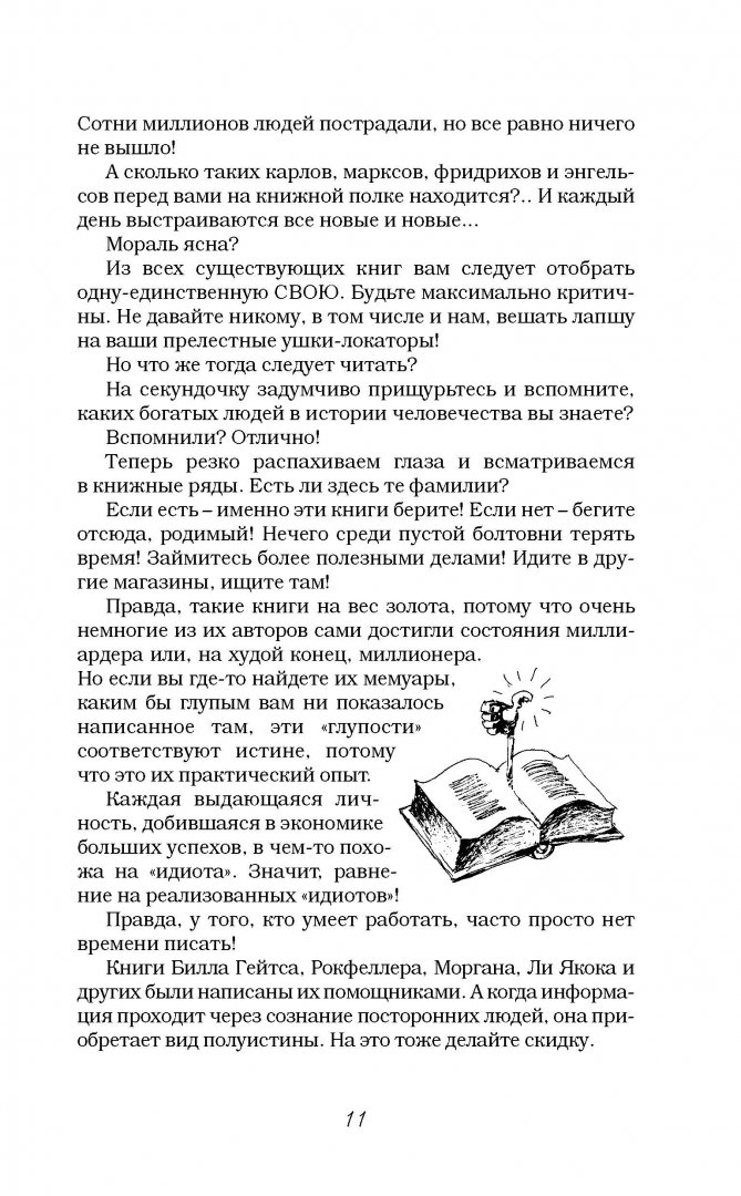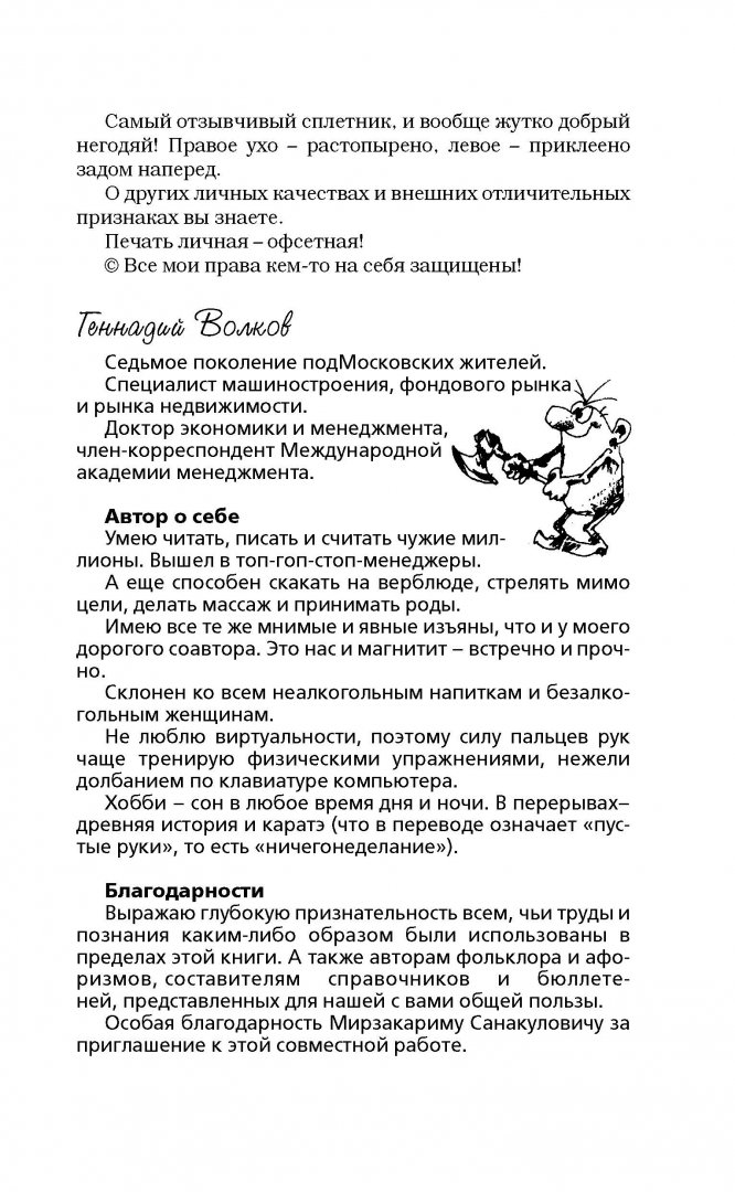 ОписаниеОб успехе, удаче, богатстве написано много книг, снято много фильмов, прочитав и посмотрев которые хочется преобразиться и горы свернуть… наверно. Если бы не было так лень, не было возможности, некогда, не могу решиться, вроде мне это и не нужно, меня моя жизнь вполне устраивает - верный ответ подчеркните сами. На нашем пути к успеху всегда есть препятствия - а вот о том, как найти в себе силы и обойти все булыжники на вашей дороге жизни (в том числе и камушки пресловутой Лени) как раз пишут в этой книге Мирзакарим Норбеков и Геннадий Волков. Из этой книги-беседы Брюзги и Умника вы и почерпнете много полезной информации, и словите несколько полновесных, но полезных тумаков. Как найти дело своей мечты; где и как искать самых лучших и преданных сотрудников; почему нельзя работать с друзьями, женами и любовницами; какова сила денег и на что ее направить; как сэкономить свою жизнь и повысить ее КПД; и, наконец, как перейти от слов к делу - обо всем написано в этой полезной книге!Об успехе, удаче, богатстве написано много книг, снято много фильмов, прочитав и посмотрев которые хочется преобразиться и горы свернуть… наверно. Если бы не было так лень, не было возможности, некогда, не могу решиться, вроде мне это и не нужно, меня моя жизнь вполне устраивает - верный ответ подчеркните сами. На нашем пути к успеху всегда есть препятствия - а вот о том, как найти в себе силы и обойти все булыжники на вашей дороге жизни (в том числе и камушки пресловутой Лени) как раз пишут в этой книге Мирзакарим Норбеков и Геннадий Волков. Из этой книги-беседы Брюзги и Умника вы и почерпнете много полезной информации, и словите несколько полновесных, но полезных тумаков. Как найти дело своей мечты; где и как искать самых лучших и преданных сотрудников; почему нельзя работать с друзьями, женами и любовницами; какова сила денег и на что ее направить; как сэкономить свою жизнь и повысить ее КПД; и, наконец, как перейти от слов к делу - обо всем написано в этой полезной книге!