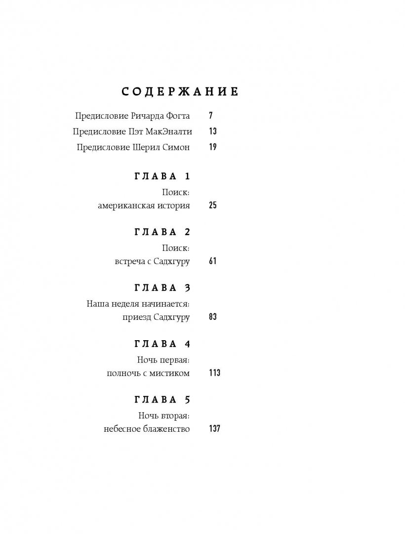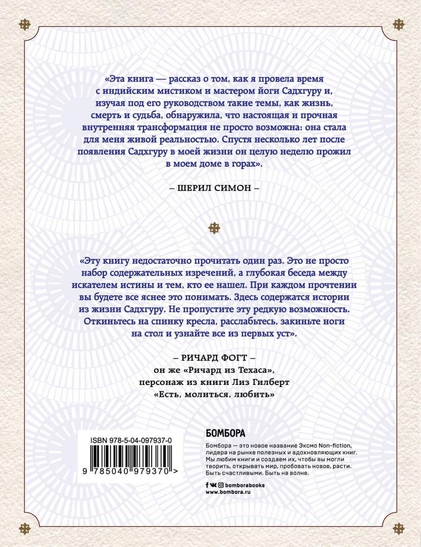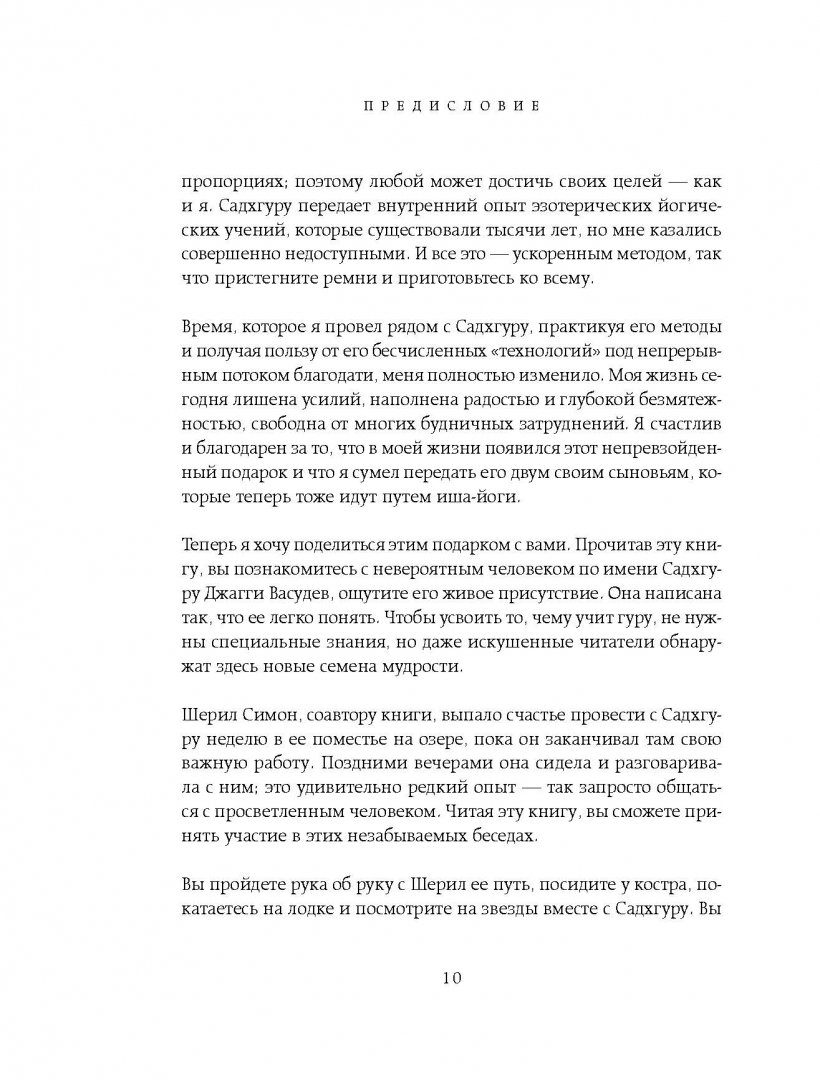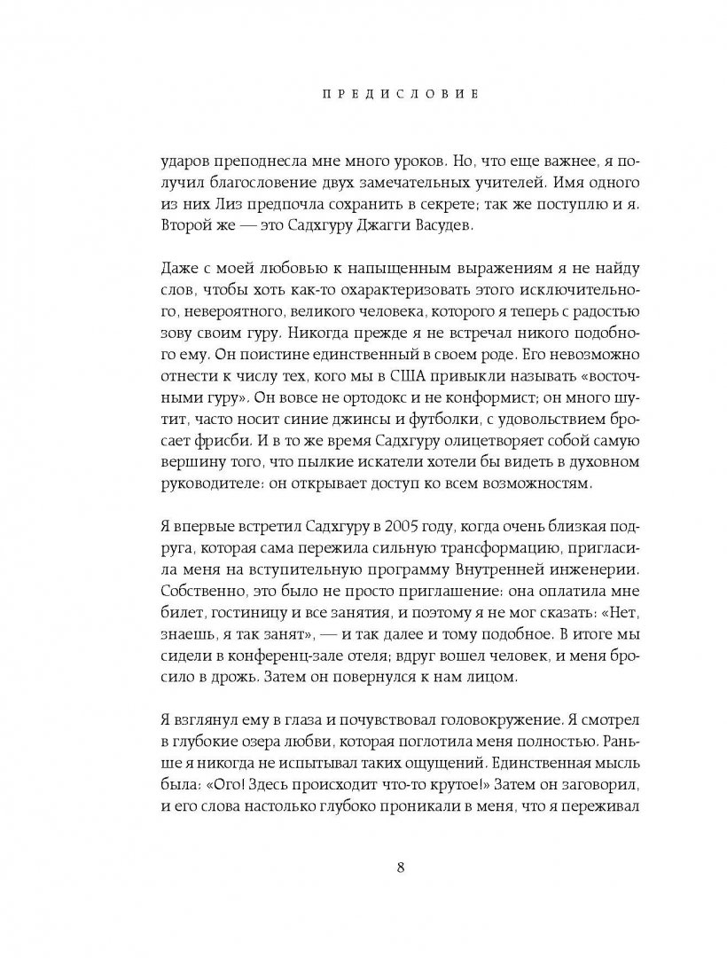 ОписаниеЭта книга - проводник к невероятному учителю и человеку по имени Садхгуру.Основой книги послужили личные вопросы ученицы Садхгуру Шерил Симон, которые она задавала ему по вечерам, когда он гостил в ее поместье. Вы узнаете, чем Садхгуру отличается от стереотипного восточного гуру, и найдете здесь много драгоценных мудростей, полезных для обычной жизни. Чтобы усвоить их, не нужны специальные знания. При этом даже искушенные читатели обнаружат здесь новые семена мудрости. Это не просто набор содержательных изречений, а глубокая беседа между искателем истины и тем, кто ее нашел.Как духовный учитель и коуч, Садхгуру успешно выступал с лекциями в самых авторитетных учреждениях и университетах по всему миру, включая ООН, Google, General Electic, Сбербанк, а также Оксфорд, Стэнфорд, Гарвард, Йельский университет, Уортонскую школу бизнеса, Массачусетский технологический институт и так далее.Эта книга - проводник к невероятному учителю и человеку по имени Садхгуру.Основой книги послужили личные вопросы ученицы Садхгуру Шерил Симон, которые она задавала ему по вечерам, когда он гостил в ее поместье. Вы узнаете, чем Садхгуру отличается от стереотипного восточного гуру, и найдете здесь много драгоценных мудростей, полезных для обычной жизни. Чтобы усвоить их, не нужны специальные знания. При этом даже искушенные читатели обнаружат здесь новые семена мудрости. Это не просто набор содержательных изречений, а глубокая беседа между искателем истины и тем, кто ее нашел.Как духовный учитель и коуч, Садхгуру успешно выступал с лекциями в самых авторитетных учреждениях и университетах по всему миру, включая ООН, Google, General Electic, Сбербанк, а также Оксфорд, Стэнфорд, Гарвард, Йельский университет, Уортонскую школу бизнеса, Массачусетский технологический институт и так далее.