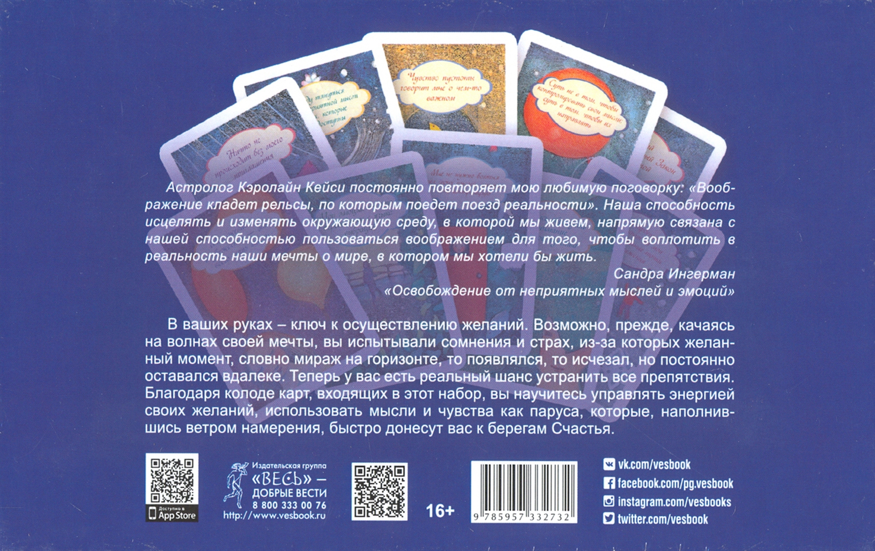 ОписаниеВ ваших руках - ключ к осуществлению желаний. Возможно, прежде, качаясь на волнах своей мечты, вы испытывали сомнения и страх, из-за которых желанный момент, словно мираж на горизонте, то появлялся, то исчезал, но постоянно оставался вдалеке. Теперь у вас есть реальный шанс устранить все препятствия. Благодаря колоде карт, входящих в этот набор, вы научитесь управлять энергией своих желаний, использовать мысли и чувства как паруса, которые, наполнившись ветром намерения, быстро донесут вас к берегам Счастья.В ваших руках - ключ к осуществлению желаний. Возможно, прежде, качаясь на волнах своей мечты, вы испытывали сомнения и страх, из-за которых желанный момент, словно мираж на горизонте, то появлялся, то исчезал, но постоянно оставался вдалеке. Теперь у вас есть реальный шанс устранить все препятствия. Благодаря колоде карт, входящих в этот набор, вы научитесь управлять энергией своих желаний, использовать мысли и чувства как паруса, которые, наполнившись ветром намерения, быстро донесут вас к берегам Счастья.