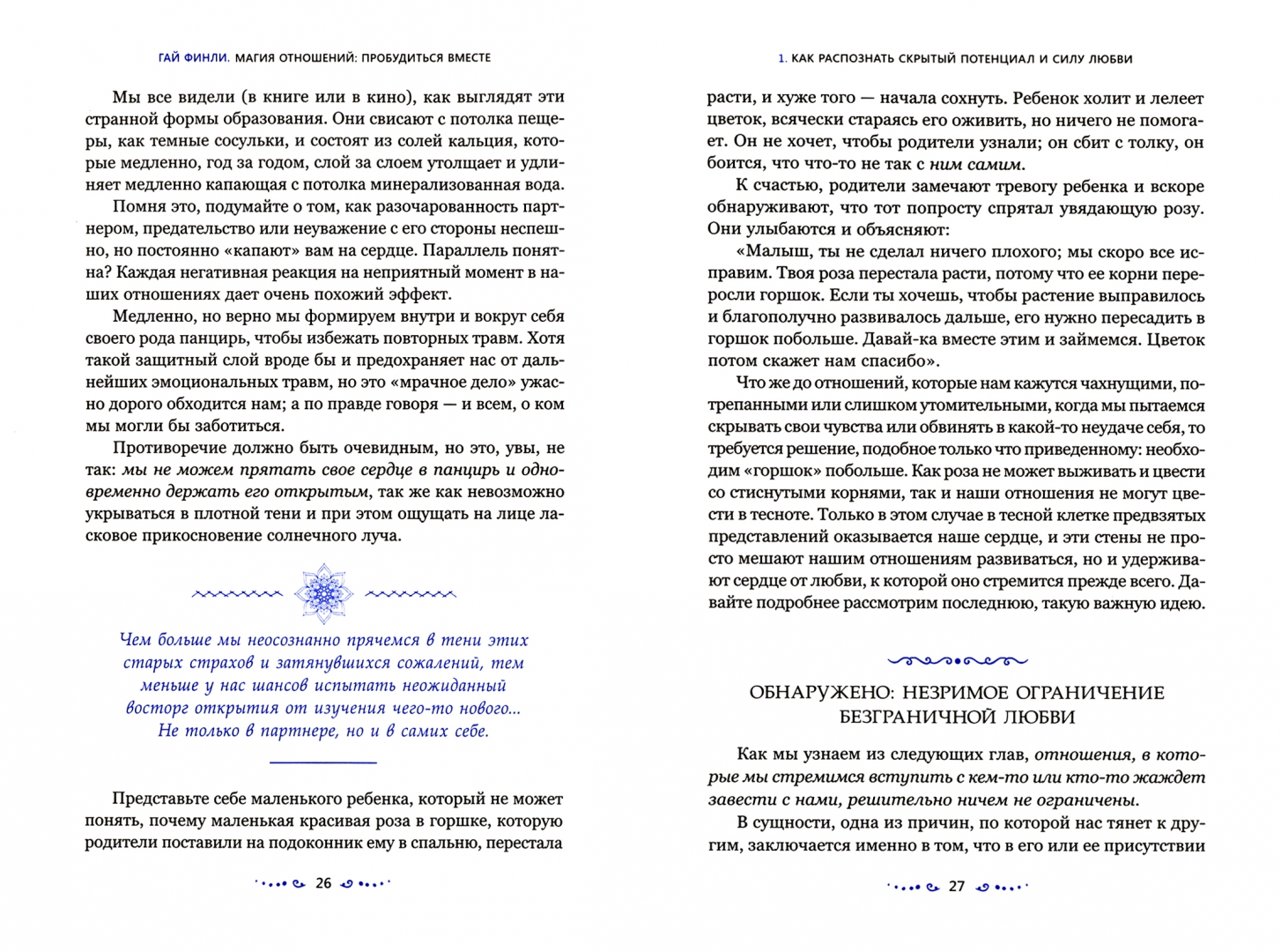 ОписаниеЧасто, находясь в паре, человек оказывается перед выбором - "воевать", чтобы удовлетворить свои потребности, или "терпеть", накапливая невысказанные обиды. Но обе эти стратегии ведут к разрушению любви.Гай Финли показывает, что наша борьба является выражением боли, которую каждый из нас хранит в себе и привносит в отношения. И предлагает инструменты, чтобы устранить боль, разделяющую вас с партнером, и укрепить связь со всеми, кого вы любите. Вы узнаете, как с помощью силы любви разрешать периодически вспыхивающие конфликты и останавливать любое "сражение" еще до его начала. А также - как поддержать или возобновить отношения, отказавшись от застарелых обид и подогрев страсть. Для того чтобы любовь жила, ее нужно постоянно обновлять, и вы поймете, как это делать.Какой бы выбор перед нами не стоял, мы всегда выбираем между любовью и страхом. Прочитав книгу, вы будете знать, как предпочитать любовь даже в тяжелые моменты и использовать ее силу, чтобы стать лучше и создать именно те отношения, которых вы жаждете.О чем книгаВначале Гай Финли рассказывает об общих вселенских законах, которые регулируют отношения, и объясняет, почему вы притягиваете определенных людей. Затем автор на примерах показывает, как разногласия с партнером можно использовать для укрепления отношений. Вы увидите, почему компромисс с собой ради временного мира никогда не срабатывает, и узнаете, как вам перестать ходить по кругу, без конца повторяя болезненные шаблоны поведения. И самое главное - вы познакомитесь с пятью мощными фразами, которые в любой момент конфликта мгновенно приведут к его положительному разрешению.Вы осознаете реальную причину как мелких, так и серьезных размолвок и освоите двухэтапный процесс преобразования нежелательных событий в мощную целительную практику для вас обоих. И поднимитесь на более высокий уровень сострадания, способный сократить любое расстояние и исцелить любую боль, которая отталкивает нас от любимых.И наконец, вы поймете, что единственный способ усовершенствовать любовь состоит в том, чтобы практиковать эту любовь, пока она не усовершенствует вас.Почему книгу стоит прочитать- Почему я постоянно формирую определенный тип отношений, ведь он меня совсем не устраивает?- Правда, что мы привлекаем к себе свои противоположности? Существуют ли родственные души, и можно ли узнать, обрел/обрела ли я свою?- Почему почти все мои отношения заканчиваются полной неразберихой, и что я могу сделать, чтобы со мной и моим нынешним партнером этого не случилось?- Способен/способна ли я изменить партнера? Помочь перерасти неприятные черты характера, которые меня постоянно раздражают?Если вы задаетесь подобными вопросами, то получите на них ответы.Гай Финли научит вас конкретным действиям, необходимым для построения ярких отношений, доступных очень немногим. Отношений, которые никогда не испортятся, всегда будут отличаться новизной, останутся непринужденно веселыми, глубоко нежными и прежде всего по-настоящему любящими.Для кого эта книгаДля тех, кто хочет создать и сохранить гармоничные отношения с партнером. Такие отношения, которые будут не просто радовать, но и способствовать личностному и духовному росту.Почему решили издатьСемь лет назад мы издали знаменитую книгу Гая Финли "Чудо освобождения", ставшую международным бе
