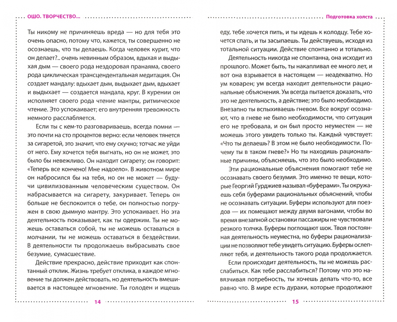 ОписаниеТворчество — это уникальная возможность развить собственную индивидуальность, обрести свободу и стать личностью. Но… не каждый из нас такой возможностью пользуется.В этой книге Ошо говорит, что творческое мышление очень важно для того, чтобы стать осознаннее и почувствовать силу своего «Я». Великий мистик утверждает, что если мы хотим быть творческими, то нам придется избавиться от всей обусловленности; иначе творчество будет просто копированием — копией под копирку. «Творец не может следовать по проторенному пути. Он должен найти свой собственный путь, прорубаясь сквозь джунгли жизни», — говорит Ошо. Скорее всего, мы не станем известными музыкантами, певцами или танцорами и не обретем славу; но в своем творчестве мы найдем намного больше — мы найдем себя.«Творчество» — это настольная книга для тех, кто понимает необходимость привнести больше творчества, игры и гибкости в свою жизнь. Это учебник, который поможет вам мысленно «выйти за пределы» сознания.О чем книгаОшо говорит, что настоящему творчеству нельзя научиться: здесь нет явных рецептов или конкретных упражнений. Творчество — это то, что никто раньше до тебя не делал. Это твоя собственная индивидуальность. Но… если творчеству нельзя научиться, как тогда быть? Ошо утверждает, что творческие способности заложены в каждом человеке. И ключ к открытию этих способностей — дать своей душе творить через тебя, минуя логику ума.Осваивай технику игры на фортепьяно, учи ноты, набирайся опыта, анализируй, «переваривай» его, а потом… порви все это на мелкие кусочки и выбрось из головы. В один прекрасный момент произойдет перелом и наступит озарение — ты поймешь, что значит Творить.Почему книгу стоит прочитатьВ этой книге Ошо предлагает необычный подход к развитию творческих способностей. Он советует какое-то время посвятить тому или иному виду творчества, потом сделать перерыв и через несколько месяцев снова начать заниматься выбранным вами видом творческой деятельности — так, как будто вы делаете это впервые. Ошо предлагает много полезных рекомендаций, выбирайте свою — и начинайте творить!Для кого эта книга? для тех, кто хочет научиться мыслить творчески;? для тех, кто хочет изменить отношение к себе и своим способностям;? для тех, кто стремиться стать свободнее и освободиться от гнета «коллективного ума»;? для тех, кто любит книги Ошо.Почему решили издатьГлубина мудрости Ошо — в простоте. В книге о творчестве автор предлагает идеи очень простые и одновременно очень мощные. Они выбивают опору из-под ваших ног — да так, что после обретения равновесия вы посмотрите на мир другими глазами.Информация об автореЧандра Мохан Джан (он же Ашария Раджниш, он же Бхагван Шри Раджниш, он же Ошо) – индусский мистик и духовный учитель, собравший миллионы последователей по всему миру. Родился Чандра Мохан Джайн в доме родителей его матери в Кучаваде, маленькой деревушке в округе Райсе в индийском штате Мадхья Прадеш. Чандра был старшим из одиннадцати детей торговца тканью. Родители до семи лет оставили ребенка на попечение бабушки и дедушки; по рассказам самого Ошо, это оказало немалое влияние на его становление – бабушка давала ему практически неограниченную свободу, никак не пытаясь его контролировать нормами, запретами или попытками дать образование.В семь лет Ошо пережи