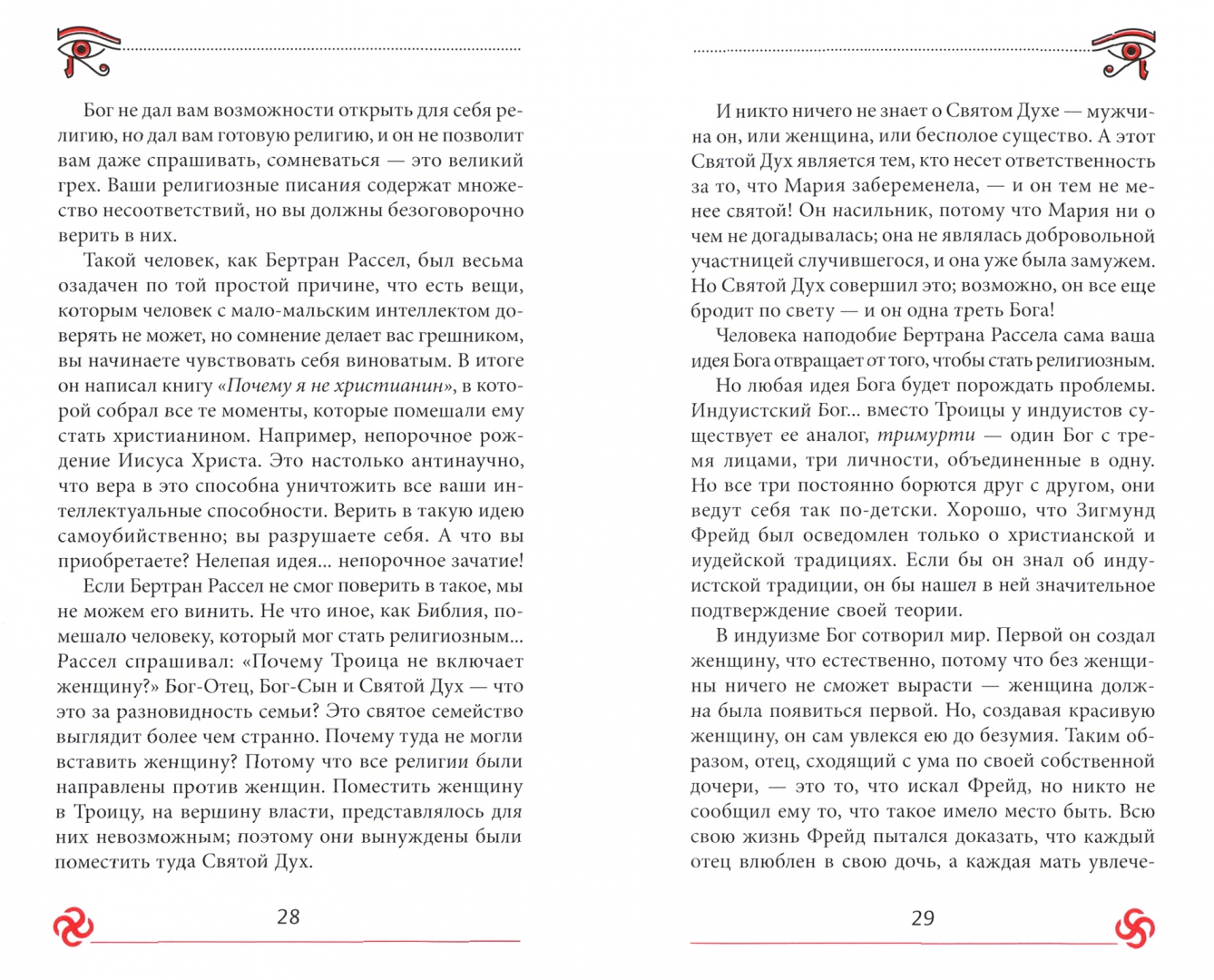ОписаниеПеред вами, пожалуй, самая шокирующая книга Ошо - та, что наделала много шума в западном мире. Идеи, которые в ней поднимаются, спорные - но интересные, возмутительные - но любопытные… В этой книге Ошо открыто рассуждает о религии и том негативном эффекте, который она зачастую оказывает. Он говорит, что каждому нужно иметь смысл жизни - это естественно. Иначе зачем продолжать дышать? Зачем завтра утром опять вставать и делать все то же, что и вчера, - чай, завтрак, те же дети, тот же поцелуй жене. Потом тот же офис, та же работа, и снова приходит вечер - зачем все это? Есть здесь хоть капля смысла?..Ошо говорит, что человек создал Бога, только чтобы удовлетворить свою потребность в смысле. Но смысл гораздо ближе, чем кажется, - он в вас самих. Просто углубитесь в ваше собственное существо до такой точки понимания, где сомнение остается далеко на периферии. И религия больше не будет вам нужна.О чем книгаВ этой книге Ошо отвечает на волнующие многих искателей вопросы: что дает верующим религия и так ли она необходима? Ошо говорит о том, как люди становятся фанатиками, почему решают придерживаться определенной системы верований - и приходит к выводу, что по-настоящему уверенному человеку нет необходимости опираться на веру: он просто доверяет жизни. Если человек пришел к пониманию, что настоящее царство - внутри него, и принимает это без всякого сомнения, то никакая религия ему не потребуется. И самое удивительное - подчеркивает Ошо, - что вы продолжаете носить настоящее царство внутри себя совершенно неосознанно, не догадываясь, каким сокровищем обладаете и как легко его достать - нужно только заглянуть в себя…Почему книгу стоит прочитатьВ этой книге Ошо объясняет причину человеческой потребности принадлежать к какой-то группе и иметь что-то, во что можно верить. Вы поймете, какую роль играет религия и вера в вашей жизни, и задумаетесь, так ли вам нужна религия на самом деле. Если с помощью религии вы стремитесь встать на путь истинный и найти свое предназначение, но до сих пор этого не сделали, то, возможно, вы просто ищете не там?..Для кого эта книгаЭта книга адресована широкому кругу читателей, но особенно она будет полезна тем, кто придерживается религиозных канонов. Также она понравится всем, кто занимается духовными практиками, находится в поисках смысла своей жизни, практикует техники саморазвития и увлекается эзотерикой.Почему решили издатьВ этой книге Ошо бросает вызов традиционной духовной культуре. Возможно, с чем-то вы не согласитесь, что-то вас шокирует, а что-то - даже возмутит, но то, что идеи Ошо заставят вас задуматься о том, правильный ли путь вы избрали для собственного роста и духовного развития, - это абсолютно точно.Информация об автореОшо - мистик XX века, основатель эзотерического учения, составленного из элементов различных духовных систем: дзен, суфизма, даосизма, тантризма и т. д. Он критиковал традиционные религии, что сделало его противоречивой фигурой еще при жизни, но, тем не менее, его учению следовали тысячи людей по всему миру. В ряде стран (в том числе и в СССР) организация Ошо причислялась некоторыми государственными организациями, учеными и религиозными деятелями к деструктивным сектам и культам и его учение было запрещено.Беседы Ошо, записанные в период с 1969 по 1989 год, собраны и изданы последователями в ви