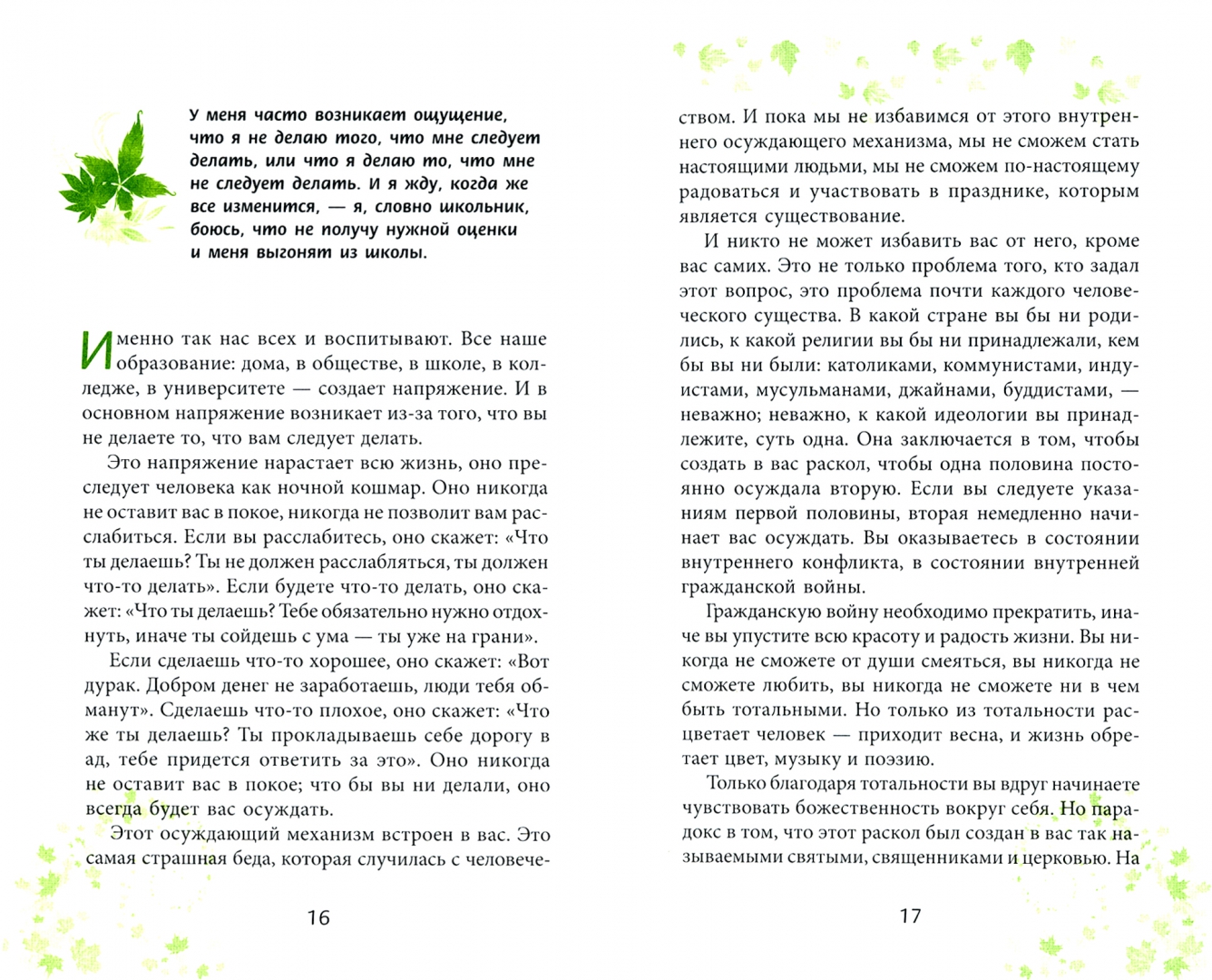 ОписаниеВ этой книге Ошо, великий мистик прошлого столетия, рассуждает о судьбе, кармических связях и предназначении. Он уверен, что яркими индивидуальностями становятся те, кто не является фаталистом: кто не считает, что его жизнь предопределена, а борется за свое место в жизни и стремится к совершенствованию. «Карма есть, но вы всегда можете вмешаться», — говорит Ошо.На достаточно сложный вопрос «в чем смысл жизни?» он отвечает просто: «Смысла нет». Все, что бессмысленно, то и дарит нам истинную радость. Не высокая должность, не миллион на счету в банке — нет, Ошо учит, что жизнь нужна ради самой себя, как поэзия ради поэзии, а живопись ради живописи… Эта книга вдохновляет на то, чтобы пересмотреть свои жизненные ценности и научиться излучать радость, неведомую ни одному миллиардеру, и получать удовольствие от жизни, неведомое ни одному политику.О чем книгаПредопределена ли наша судьба от рождения? «И да, и нет», — говорит Ошо. Черты лица, строение тела — это частично заложено в нас генами, а частично мы получаем благодаря кармическим связям. А в остальном — жизнь производит нас на свет как чистый лист бумаги, на котором ничего не начертано. А значит, нет какого-либо предопределения, которое, что бы мы ни делали, должно свершиться. Ошо убежден, что такого понятия, как карма, не существует. Строить свою судьбу самим — это рискованно, поэтому всегда легче списать все на карму. Ведь кто знает, что произойдет? Это риск, нет никакой гарантии. Но это и делает жизнь интересной!Почему книгу стоит прочитатьЭта книга, наполненная любовью и теплотой, дает возможность не только прикоснуться к уникальной атмосфере личного общения мастера и ученика, но и возвыситься над суетой обыденности. Прочитав ее, вы наверняка пересмотрите свои взгляды на жизнь, увидите несметное количество новых возможностей и будете просто гореть желанием скорее начать претворять их в жизнь.Для кого эта книгаДля тех, кто ищет ответ на вопросы: «В чем смысл жизни?», «Предопределена ли моя судьба?», «Почему истина открывается индивидуальностям, а не толпе?» книга станет настоящим откровением. Также она будет интересна тем, кто любит книги о саморазвитии и становлении личности.Почему решили издатьЭта одна из самых «легких» книг Ошо. Индийский гуру мастерски справляется с таким сложными философским понятием, как «смысл жизни»: он говорит об этом просто, с легкостью и тонким пониманием сути жизни.Информация об автореОшо — мистик XX века, основатель эзотерического учения, составленного из элементов различных духовных систем: дзен, суфизма, даосизма, тантризма и т. д. Он критиковал традиционные религии, что сделало его противоречивой фигурой еще при жизни, но, тем не менее, его учению следовали тысячи людей по всему миру. В ряде стран (в том числе и в СССР) организация Ошо причислялась некоторыми государственными организациями, учеными и религиозными деятелями к деструктивным сектам и культам и его учение было запрещено.Беседы Ошо, записанные в период с 1969 по 1989 год, собраны и изданы последователями в виде нескольких сотен (более 600) книг.СвернутьВ этой книге Ошо, великий мистик прошлого столетия, рассуждает о судьбе, кармических связях и предназначении. Он уверен, что яркими индивидуальностями становятся те, кто не является фаталистом: кто не считает, что его жизнь предопредел