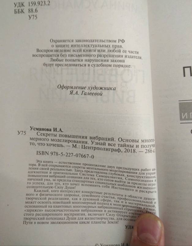 Описание"Секреты повышения вибраций. Основы многомерного моделирования. Узнай все тайны и получи то, что хочешь".Эта книга - естественное продолжение двух предыдущих работ автора. В ней открываются секреты ментального моделирования для управления своей реальностью. Здесь представлена глубокая, конструктивная, адекватная и оригинальная Система Саморазвития, Самопознания и повышения вибраций сознания для тех, кто готов выйти за пределы ограничений ума, за пределы стандартных социальных шаблонов жизненного успеха, для тех, кто хочет вспомнить себя Настоящего и раскрыть созидательную Силу Души! Каждый, кого интересуют конкретные результаты в области душевного и физического здоровья, семейного счастья, профессиональной и творческой реализации, как в духовной сфере, так и в материальной, может освоить новейший многомерный подход к моделированию жизни, основанный на квантовых многомерных вибрационных стратегиях. Текст "заряжен" высокочастотными вибрациями и активирует состояния чистого расширенного восприятия, включает Силу Открытого Сердца и творческий потенциал Души для жизнетворчества, для осознания своего Пути в новом эволюционном цикле планеты Земля!Свернуть"Секреты повышения вибраций. Основы многомерного моделирования. Узнай все тайны и получи то, что хочешь".Эта книга - естественное продолжение двух предыдущих работ автора. В ней открываются секреты ментального моделирования для управления своей реальностью. Здесь представлена глубокая, конструктивная, адекватная и оригинальная Система Саморазвития, Самопознания и повышения вибраций сознания для тех, кто готов выйти за пределы ограничений ума, за пределы стандартных социальных шаблонов жизненного успеха, для тех, кто хочет вспомнить себя Настоящего и раскрыть созидательную Силу Души! Каждый, кого интересуют конкретные результаты в области душевного и физического здоровья, семейного счастья, профессиональной и творческой реализации, как в духовной сфере, так и в материальной, может освоить новейший многомерный подход к моделированию жизни, основанный на квантовых многомерных вибрационных стратегиях. Текст "заряжен" высокочастотными вибрациями и активирует состояния чистого расширенного восприятия, включает Силу Открытого Сердца и творческий потенциал Души для жизнетворчества, для осознания своего Пути в новом эволюционном цикле планеты Земля!СвернутьСвернуть