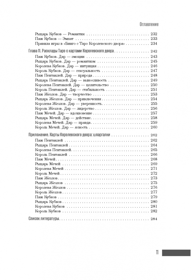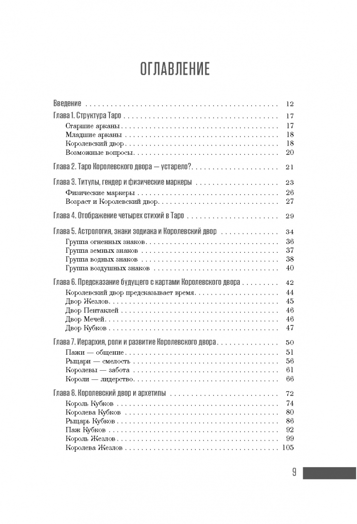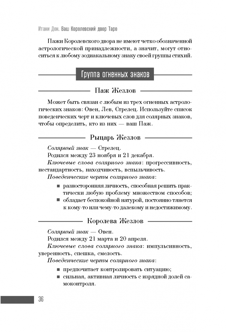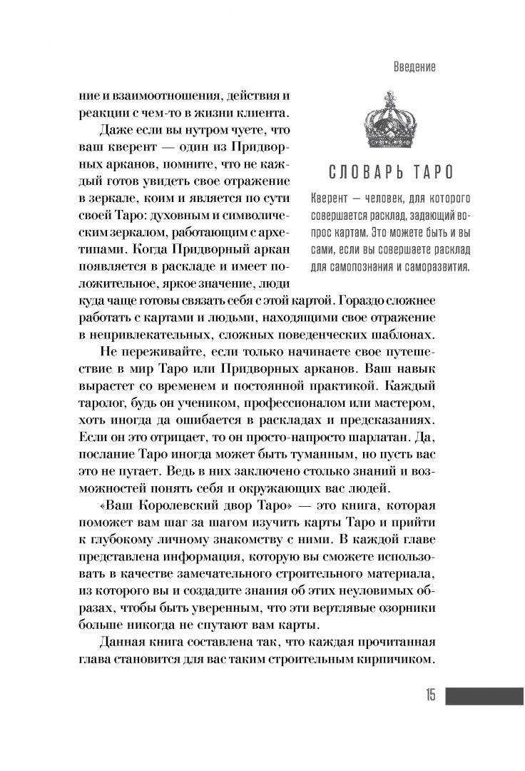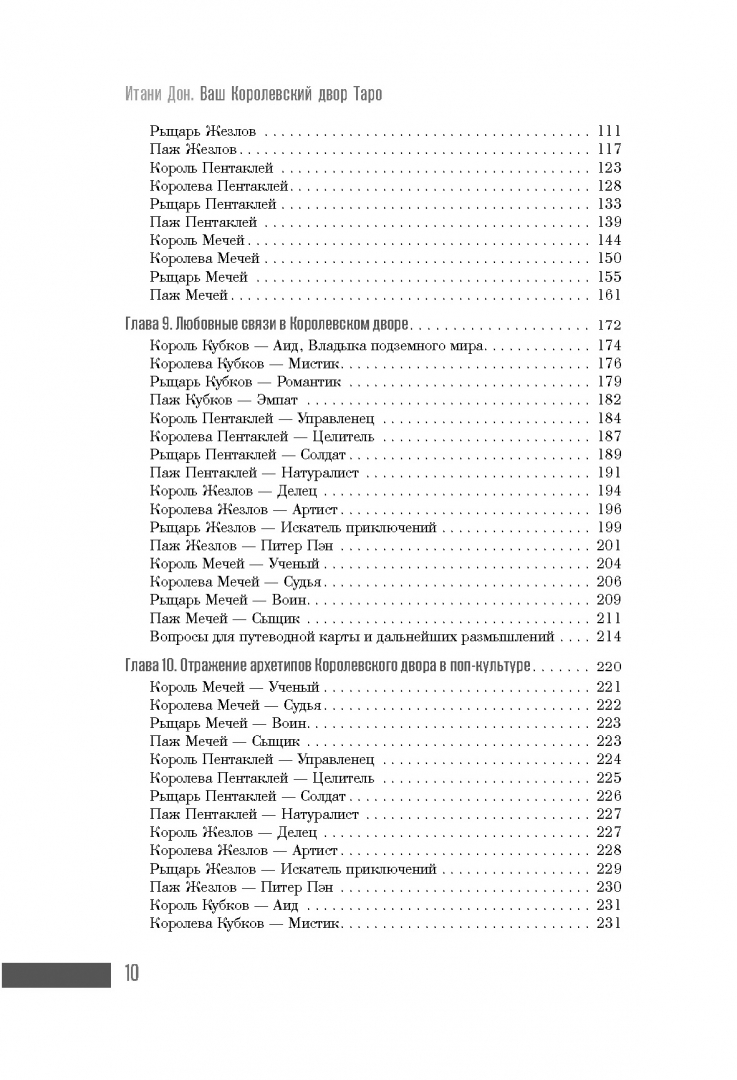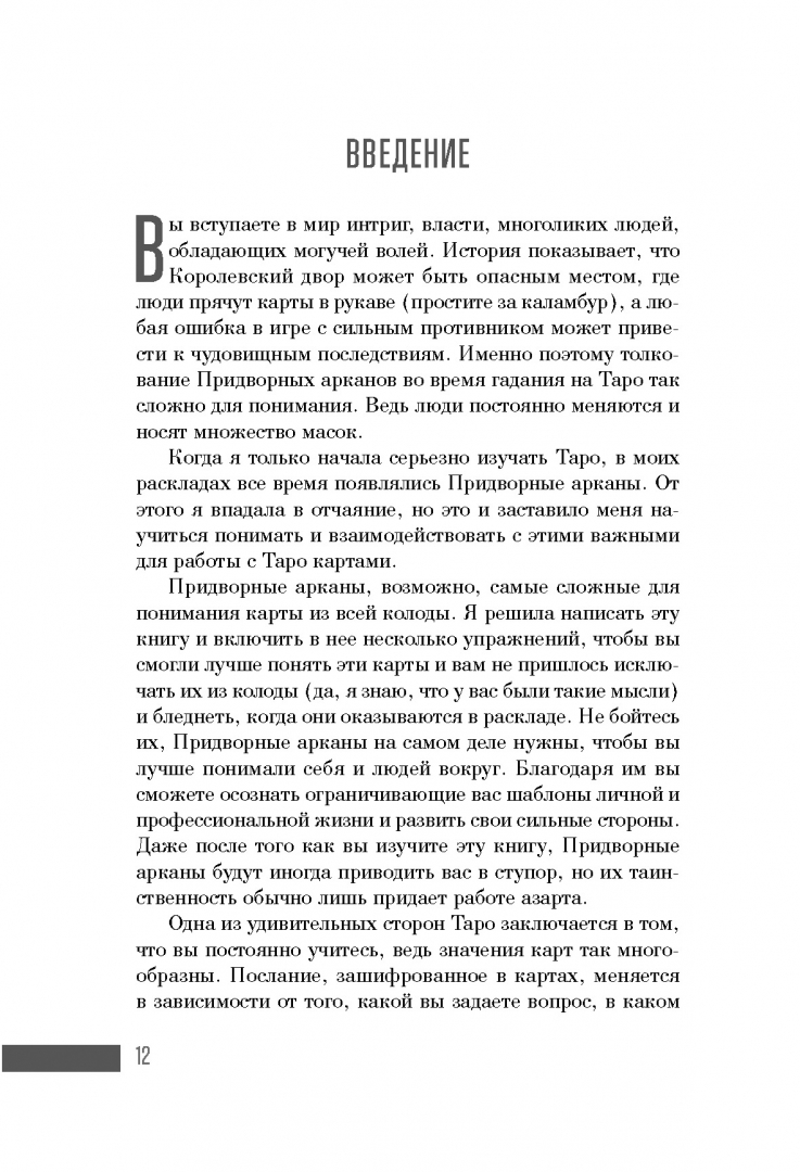ОписаниеДаже самые опытные тарологи испытывают трудности, когда в дело вступают арканы Королевского двора. О чем говорят Короли и Королевы, Рыцари и Пажи - персонажи, которые кажутся принадлежащими истории прошлых веков? Эта книга поможет вам по-новому взглянуть на Придворные арканы и превратить их в могущественных друзей и благородных наставников.У каждой карты Королевского двора есть особый дар. Кто вам ближе - романтичный и страстный Рыцарь Кубков, или практичный и дисциплинированный Король Пентаклей? Справедливая и рассудительная Королева Мечей, или озорной и творческий Паж Жезлов? Каковы бы ни были ваши намерения, книга поможет вам установить глубокие отношения с энергией карт: даже самый сложный расклад больше не будет вызывать у вас затруднений.Профессиональный таролог Итани Дон расскажет, как с помощью Придворных арканов проработать свои сильные стороны и теневые аспекты, улучшить отношения с окружающими, стать успешнее в работе и избавиться от ненужных привычек. Простые упражнения и нестандартные толкования ярко и доступно раскрывают смыслы, которые стоят за каждой фигурой Королевского двора. Эти таинственные образы перестанут быть для вас неразрешимой загадкой и превратятся в надежный источник вдохновения и поддержки.СвернутьДаже самые опытные тарологи испытывают трудности, когда в дело вступают арканы Королевского двора. О чем говорят Короли и Королевы, Рыцари и Пажи - персонажи, которые кажутся принадлежащими истории прошлых веков? Эта книга поможет вам по-новому взглянуть на Придворные арканы и превратить их в могущественных друзей и благородных наставников.У каждой карты Королевского двора есть особый дар. Кто вам ближе - романтичный и страстный Рыцарь Кубков, или практичный и дисциплинированный Король Пентаклей? Справедливая и рассудительная Королева Мечей, или озорной и творческий Паж Жезлов? Каковы бы ни были ваши намерения, книга поможет вам установить глубокие отношения с энергией карт: даже самый сложный расклад больше не будет вызывать у вас затруднений.Профессиональный таролог Итани Дон расскажет, как с помощью Придворных арканов проработать свои сильные стороны и теневые аспекты, улучшить отношения с окружающими, стать успешнее в работе и избавиться от ненужных привычек. Простые упражнения и нестандартные толкования ярко и доступно раскрывают смыслы, которые стоят за каждой фигурой Королевского двора. Эти таинственные образы перестанут быть для вас неразрешимой загадкой и превратятся в надежный источник вдохновения и поддержки.СвернутьСвернуть