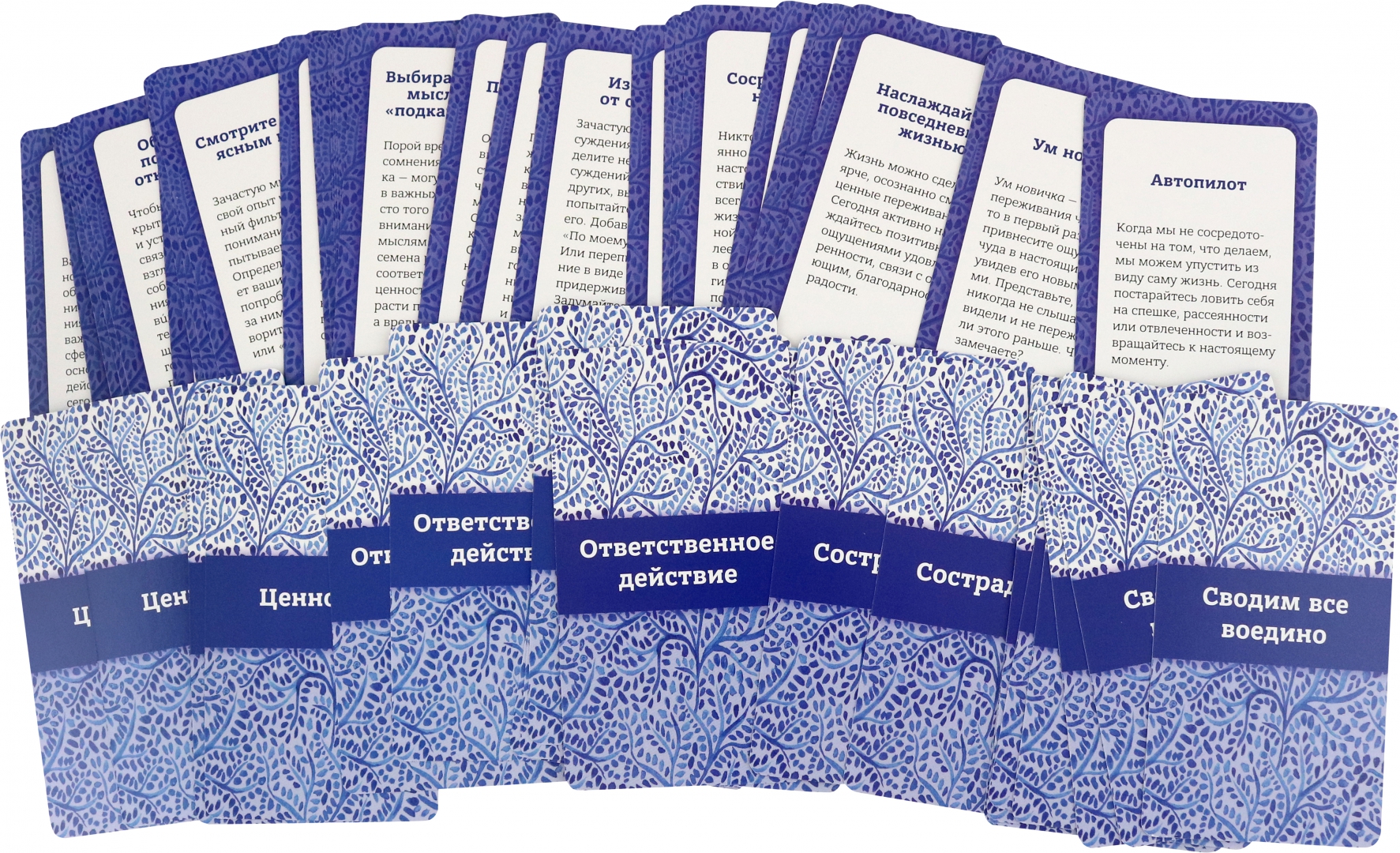 ОписаниеВ череде мелких трудностей нас часто захлестывают негативные мысли и эмоции, мешающие двигаться к истинным целям, наслаждаться жизнью. Современная психология предлагает простые инструменты, которые помогут снизить стресс и беспокойство.Колода "Действуйте ежедневно" познакомит вас с основными тезисами терапии принятия и ответственности (ТПО). Каждая карта описывает разные навыки, например внимательность, принятие или сострадание к себе. Это не сложно и не требует специального места и времени для практики. С помощью карт вы сможете поддержать себя в тот самый момент, когда нахлынут тревога и сомнения, вы перестанете верить в свои силы, вас одолеет прокрастинация. Вы научитесь справляться с трудностями и присутствовать в настоящем моменте, не тревожась о прошлом или будущем. Самое главное, вы узнаете, как действовать, опираясь на собственные ценности, стать более устойчивыми и в то же время гибкими. А значит, сможете двигаться вперед.ТПО - это больше, чем просто терапия. Это основа хорошей жизни. И лучше всего она работает, когда практикуется ежедневно - дома, на работе, на отдыхе или в дороге. Возьмите с собой эти удобные и практичные карты и позвольте им вести вас к той жизни, которую вы действительно хотите!СвернутьВ череде мелких трудностей нас часто захлестывают негативные мысли и эмоции, мешающие двигаться к истинным целям, наслаждаться жизнью. Современная психология предлагает простые инструменты, которые помогут снизить стресс и беспокойство.Колода "Действуйте ежедневно" познакомит вас с основными тезисами терапии принятия и ответственности (ТПО). Каждая карта описывает разные навыки, например внимательность, принятие или сострадание к себе. Это не сложно и не требует специального места и времени для практики. С помощью карт вы сможете поддержать себя в тот самый момент, когда нахлынут тревога и сомнения, вы перестанете верить в свои силы, вас одолеет прокрастинация. Вы научитесь справляться с трудностями и присутствовать в настоящем моменте, не тревожась о прошлом или будущем. Самое главное, вы узнаете, как действовать, опираясь на собственные ценности, стать более устойчивыми и в то же время гибкими. А значит, сможете двигаться вперед.ТПО - это больше, чем просто терапия. Это основа хорошей жизни. И лучше всего она работает, когда практикуется ежедневно - дома, на работе, на отдыхе или в дороге. Возьмите с собой эти удобные и практичные карты и позвольте им вести вас к той жизни, которую вы действительно хотите!СвернутьСвернуть