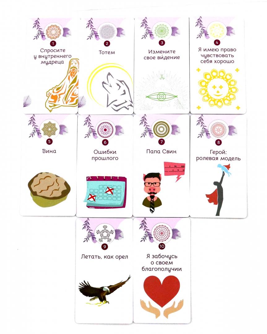 ОписаниеЗдоровая самооценка полностью меняет жизнь, положительно влияет на принятие решений, позволяет чувствовать себя счастливым и полным энергии. Уверенность в себе придает смелости для того, чтобы встречать любые вызовы с высоко поднятой головой.Красивые, яркие карты в формате размышлений-упражнений помогут вам разобраться в собственных желаниях и страхах, распутать клубок внутренних противоречий. На каждой карте - необычные авторские рисунки, мандалы, мини-предсказания и полные глубокого смысла цитаты из самых разных источников. Оракул удивит вас тем, что чудесным образом будет угадывать ваши тайные мысли и отвечать на еще не озвученные вопросы.Эти карты привнесут нотку волшебства в каждый ваш день и подарят заряд мотивации, чтобы вы могли сворачивать горы!Комплектность: 52 карты.Здоровая самооценка полностью меняет жизнь, положительно влияет на принятие решений, позволяет чувствовать себя счастливым и полным энергии. Уверенность в себе придает смелости для того, чтобы встречать любые вызовы с высоко поднятой головой.Красивые, яркие карты в формате размышлений-упражнений помогут вам разобраться в собственных желаниях и страхах, распутать клубок внутренних противоречий. На каждой карте - необычные авторские рисунки, мандалы, мини-предсказания и полные глубокого смысла цитаты из самых разных источников. Оракул удивит вас тем, что чудесным образом будет угадывать ваши тайные мысли и отвечать на еще не озвученные вопросы.Эти карты привнесут нотку волшебства в каждый ваш день и подарят заряд мотивации, чтобы вы могли сворачивать горы!Комплектность: 52 карты.