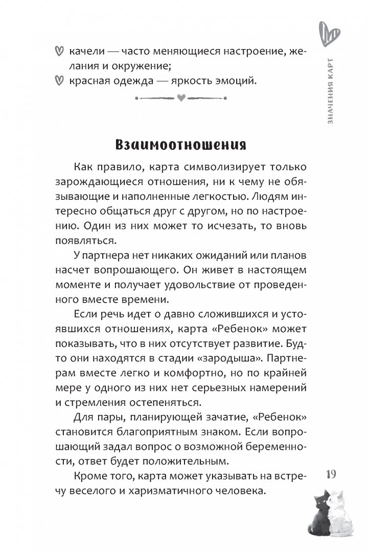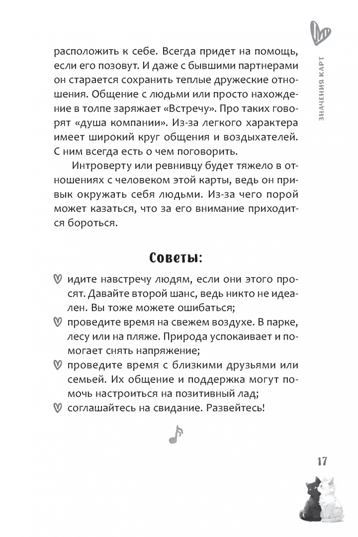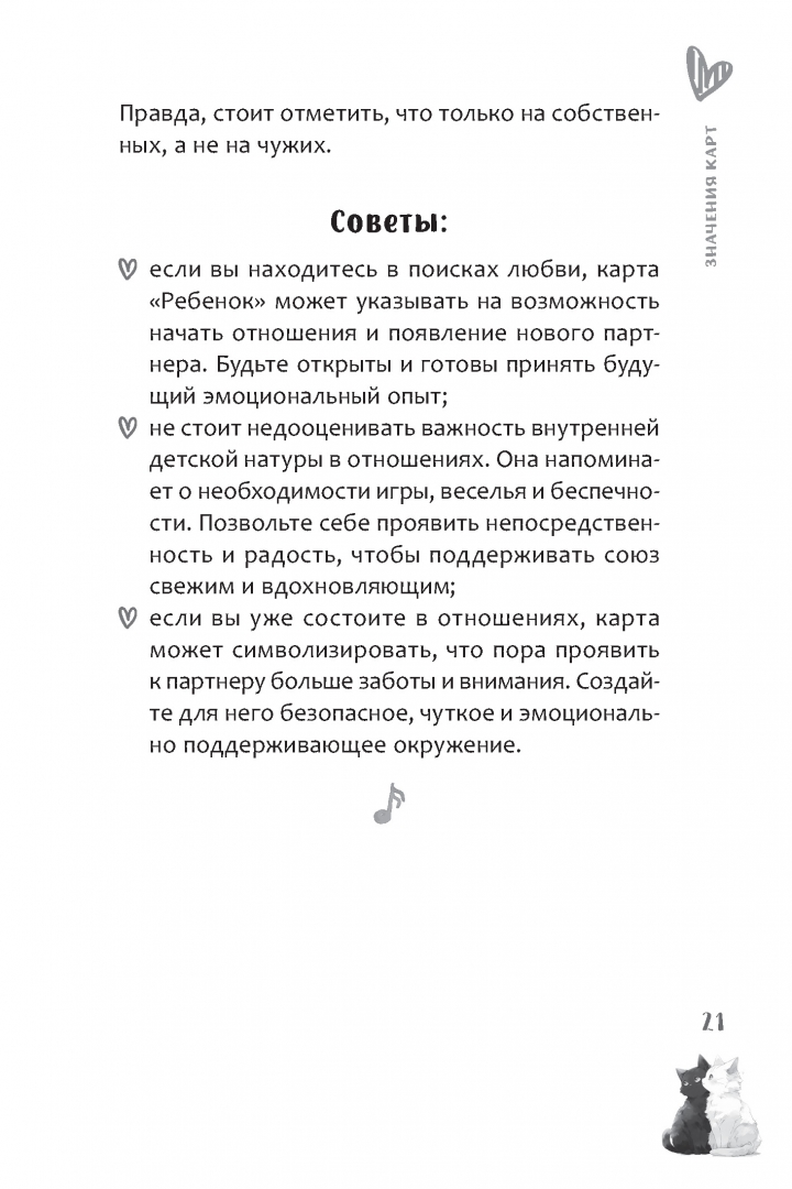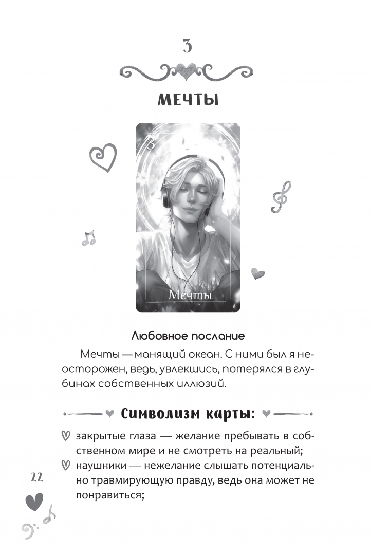 ОписаниеОракул "Мелодия любви" создан для исследования любовных отношений. Во время работы с ним вы сформируете гармоничные отношения с партнером и поймете ваши истинные желания и потребности Оракул предназначен как для пар, которые хотят углубить свою эмоциональную связь, так и для тех людей, которые ищут романтические отношения или переживают расставание.Колода состоит из метких образов, каждый из которых станет ключом к пониманию ваших чувств и эмоций. Яркие и при этом понятные символы, брошюра с интерпретациями карт и авторскими раскладами делают колоду подходящим инструментом и для искушенных практиков, и для тех, кто только открывает мир карт.Пять основных раскладов, предложенные Евгенией Дени, помогут предсказать, как то или иное решение отразится на ваших отношениях с партнером. Вы обратитесь к характеру партнера, обнаружите аспекты его/её личности и поймете, как они сочетаются с вашими собственными стремлениями и ценностями. Расклады помогут не только четче увидеть текущую ситуацию, но и заглянуть в будущее ваших отношений, чтобы сделать более осознанный выбор.Используйте Оракул "Мелодия любви" как инструмент для глубокого самопознания и гармонизации романтических отношений - он станет вашим верным помощником на пути к счастью и любви.СвернутьОракул "Мелодия любви" создан для исследования любовных отношений. Во время работы с ним вы сформируете гармоничные отношения с партнером и поймете ваши истинные желания и потребности Оракул предназначен как для пар, которые хотят углубить свою эмоциональную связь, так и для тех людей, которые ищут романтические отношения или переживают расставание.Колода состоит из метких образов, каждый из которых станет ключом к пониманию ваших чувств и эмоций. Яркие и при этом понятные символы, брошюра с интерпретациями карт и авторскими раскладами делают колоду подходящим инструментом и для искушенных практиков, и для тех, кто только открывает мир карт.Пять основных раскладов, предложенные Евгенией Дени, помогут предсказать, как то или иное решение отразится на ваших отношениях с партнером. Вы обратитесь к характеру партнера, обнаружите аспекты его/её личности и поймете, как они сочетаются с вашими собственными стремлениями и ценностями. Расклады помогут не только четче увидеть текущую ситуацию, но и заглянуть в будущее ваших отношений, чтобы сделать более осознанный выбор.Используйте Оракул "Мелодия любви" как инструмент для глубокого самопознания и гармонизации романтических отношений - он станет вашим верным помощником на пути к счастью и любви.СвернутьСвернуть