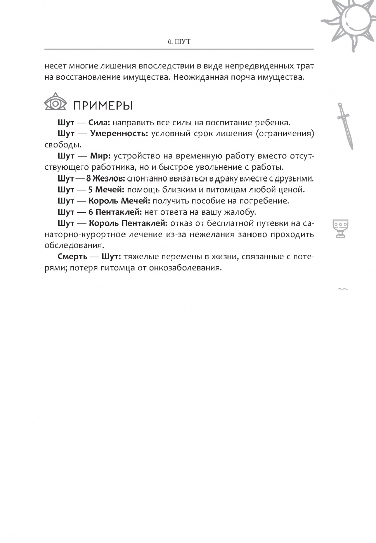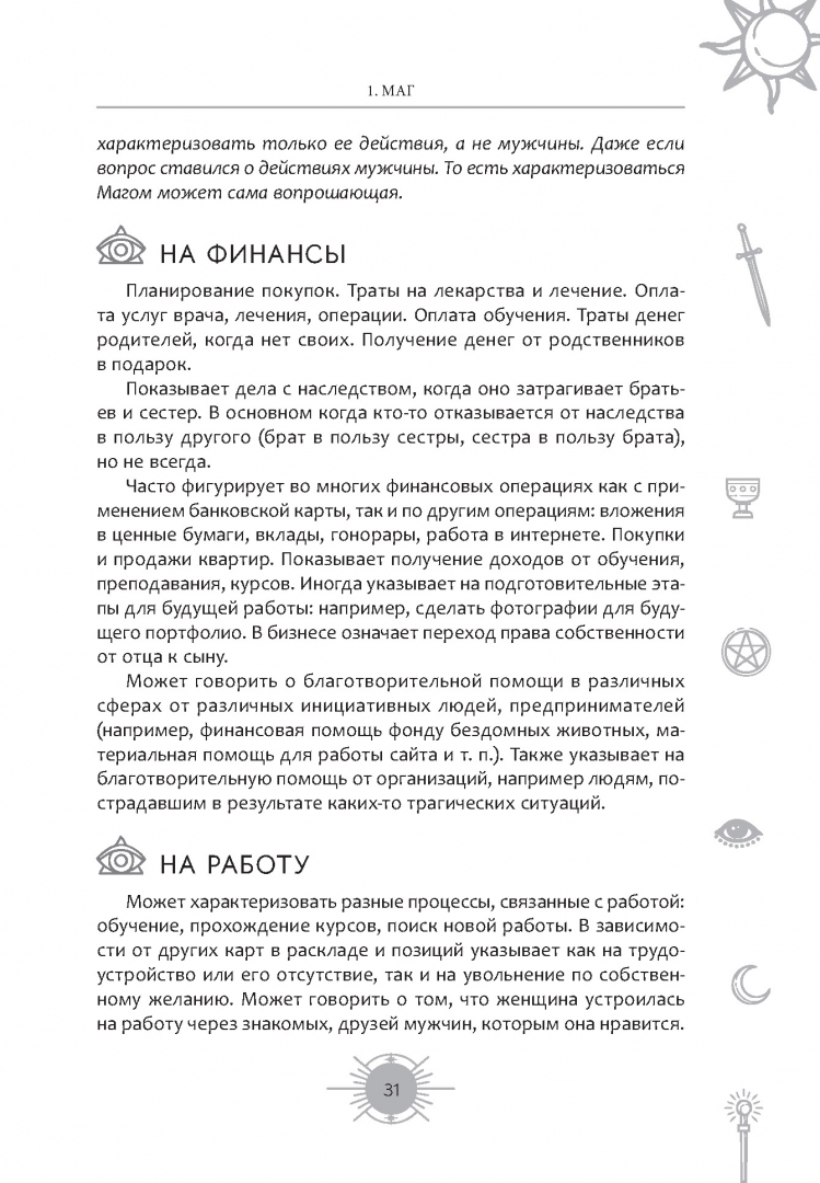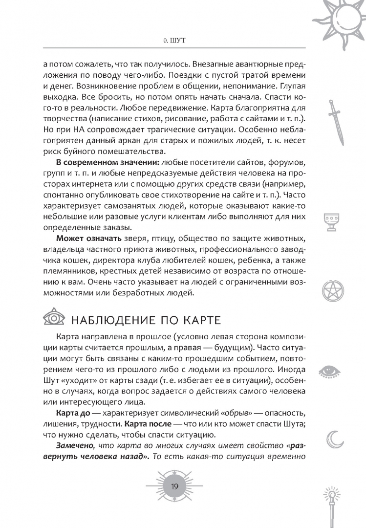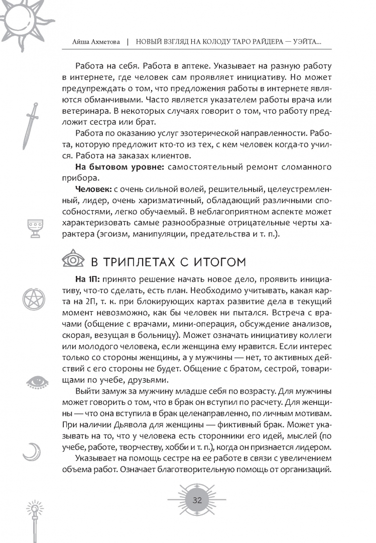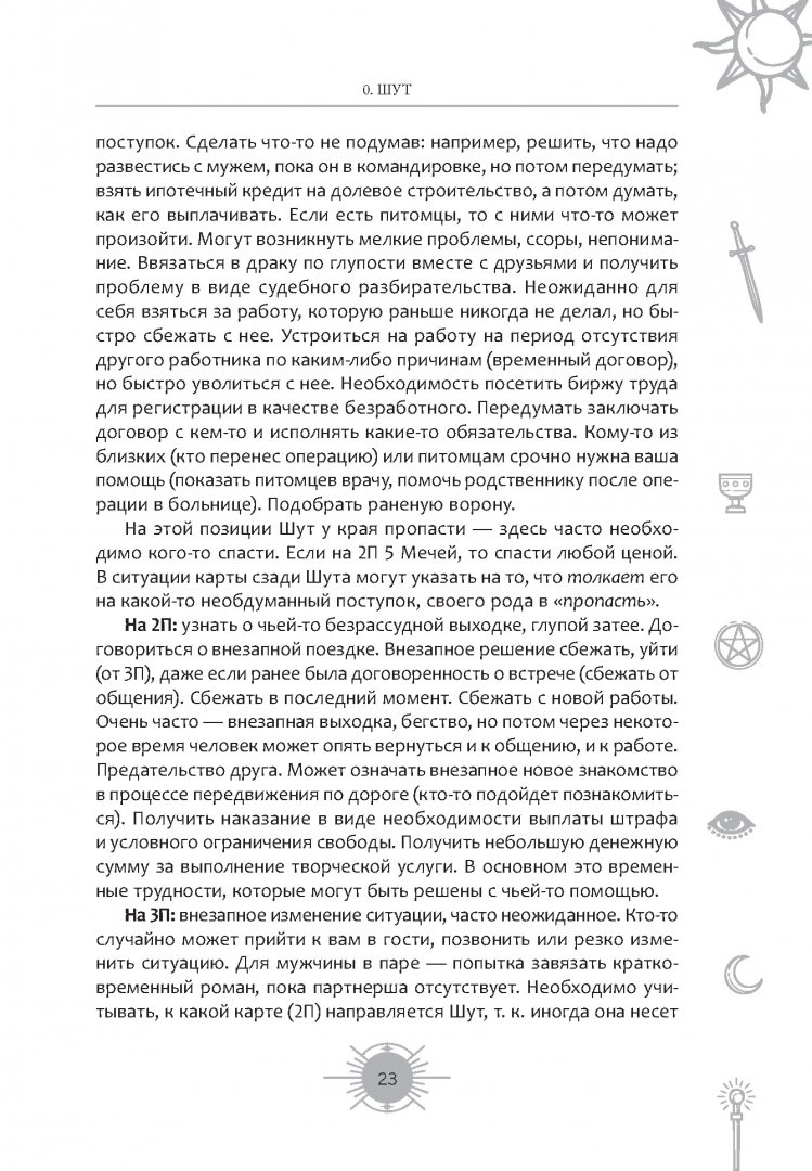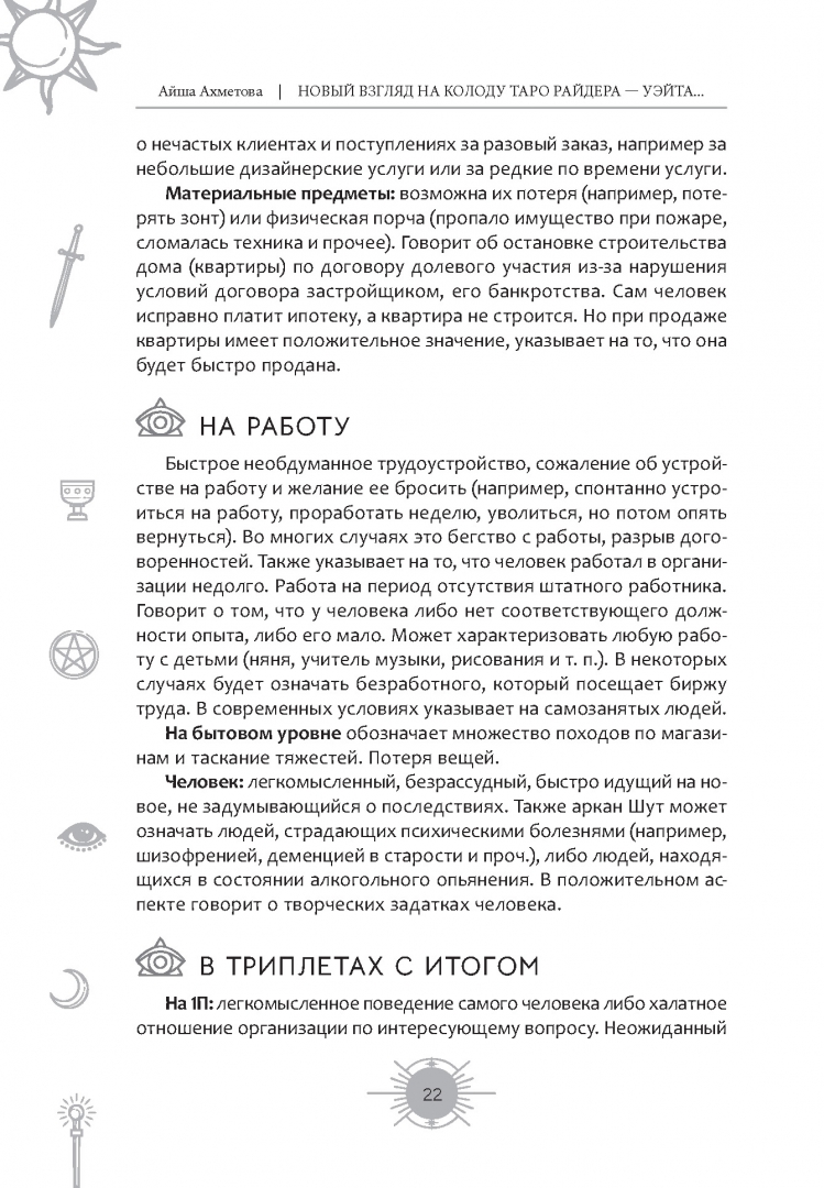 ОписаниеКнига представляет собой уникальное руководство по работе с классической колодой Райдера-Уэйта, предлагая новый взгляд на значения карт и их интерпретацию в современных реалиях.Каждый из 22 старших арканов рассматривается через призму различных жизненных ситуаций: отношения, работа, финансы и др. Приведены конкретные примеры из раскладов, включая трехкарточные расклады с итогом, что позволит читателю лучше понять, как именно общие смыслы могут раскрываться в контексте личных обстоятельств.Автор не делит карты на "положительные" и "отрицательные", считая, что каждая имеет как светлые, так и темные стороны. Например, на позиции "итог" такие карты, как "Дьявол" или "Колесо Фортуны", могут предсказывать и негативные, и позитивные исходы, в зависимости от ситуации клиента.Книга предназначена как для новичков в Таро, так и для профессионалов, ищущих новые подходы к трактовке карт. В ней предлагаются практические рекомендации для работы с раскладами, что делает ее незаменимым пособием для самостоятельного обучения.СвернутьКнига представляет собой уникальное руководство по работе с классической колодой Райдера-Уэйта, предлагая новый взгляд на значения карт и их интерпретацию в современных реалиях.Каждый из 22 старших арканов рассматривается через призму различных жизненных ситуаций: отношения, работа, финансы и др. Приведены конкретные примеры из раскладов, включая трехкарточные расклады с итогом, что позволит читателю лучше понять, как именно общие смыслы могут раскрываться в контексте личных обстоятельств.Автор не делит карты на "положительные" и "отрицательные", считая, что каждая имеет как светлые, так и темные стороны. Например, на позиции "итог" такие карты, как "Дьявол" или "Колесо Фортуны", могут предсказывать и негативные, и позитивные исходы, в зависимости от ситуации клиента.Книга предназначена как для новичков в Таро, так и для профессионалов, ищущих новые подходы к трактовке карт. В ней предлагаются практические рекомендации для работы с раскладами, что делает ее незаменимым пособием для самостоятельного обучения.СвернутьСвернуть