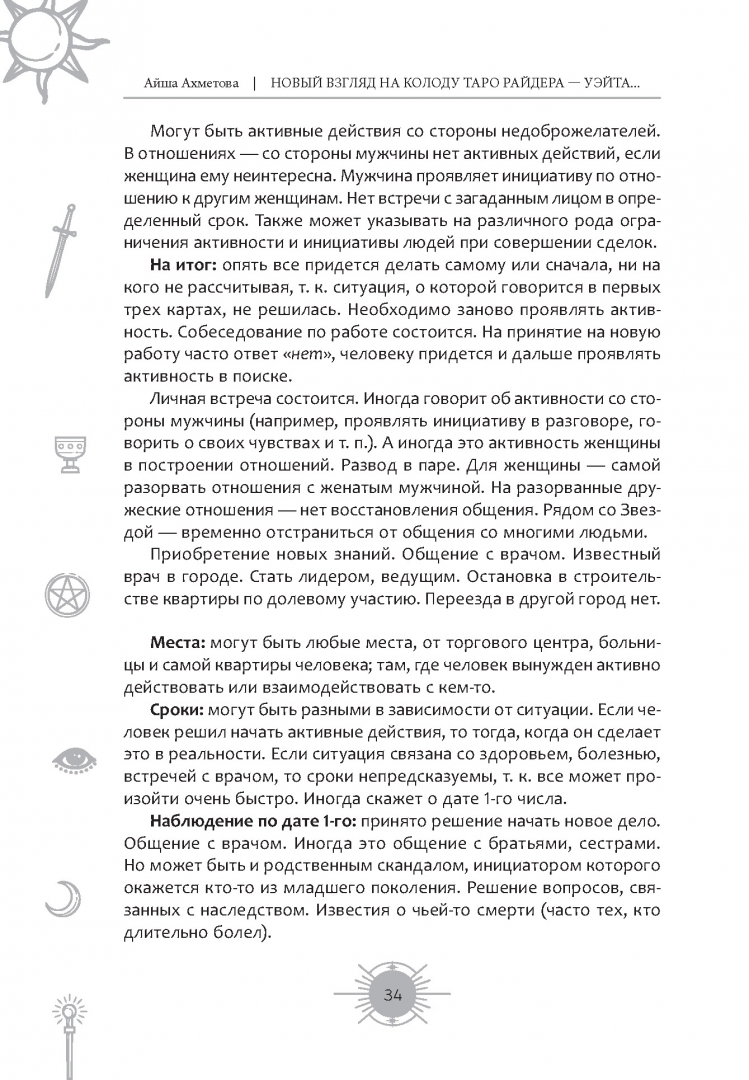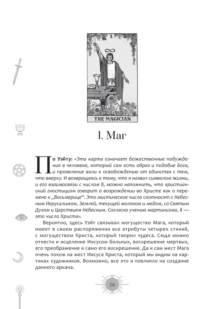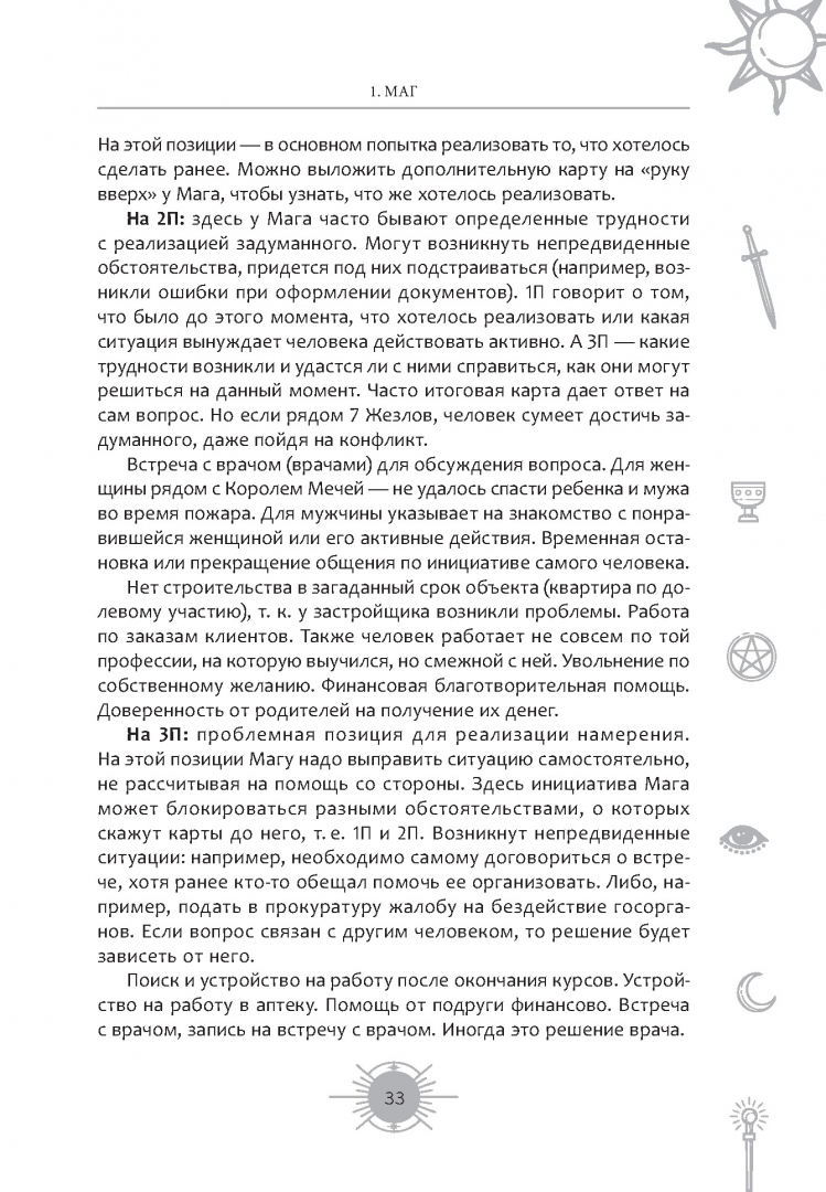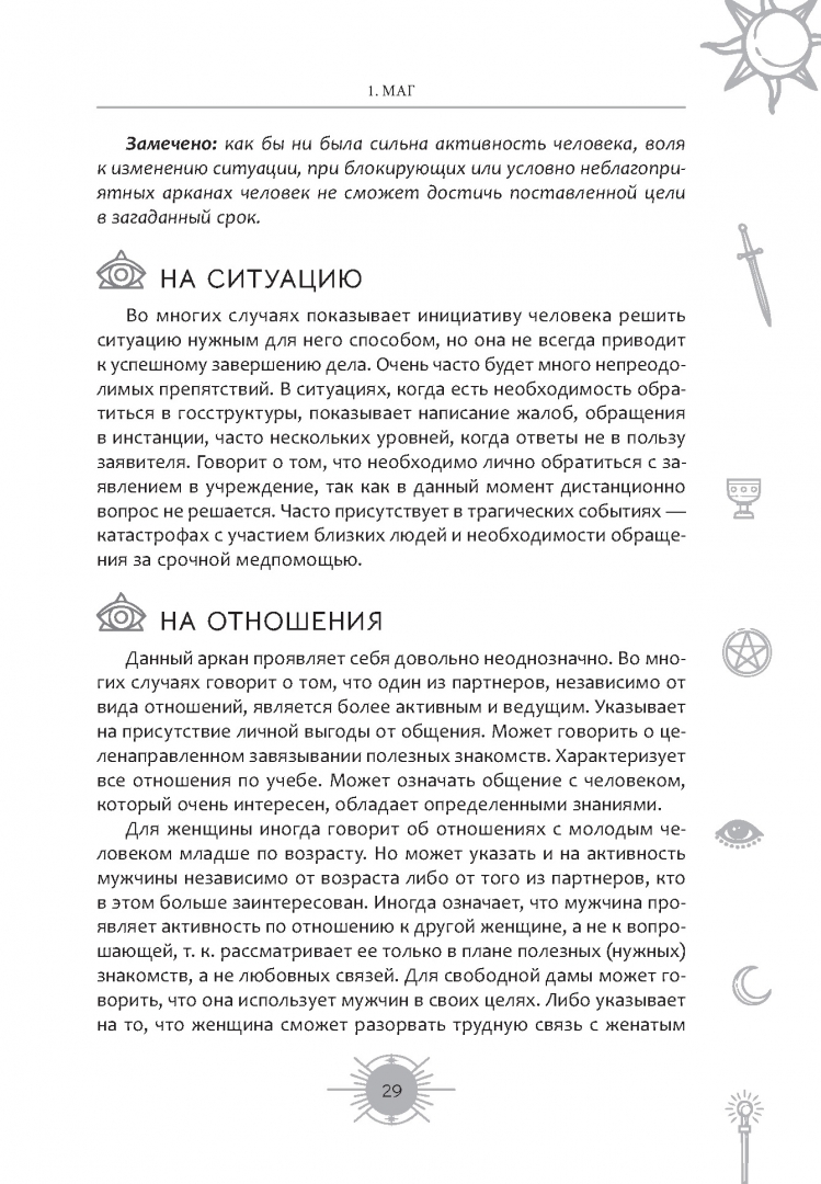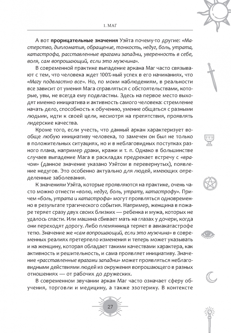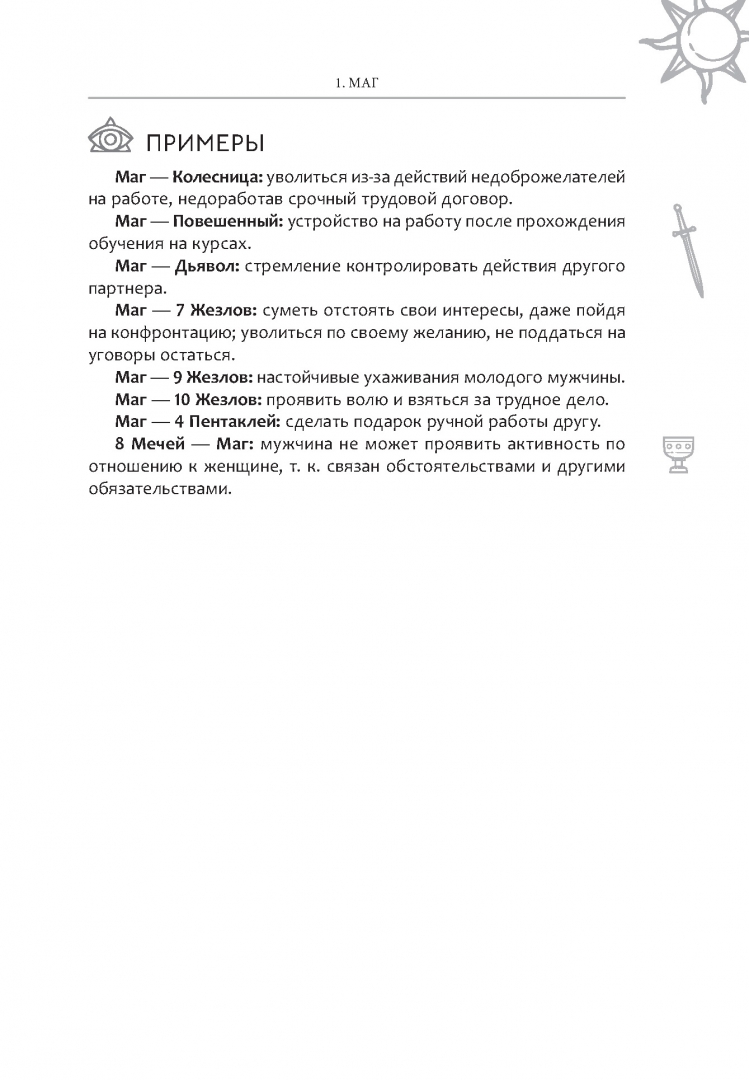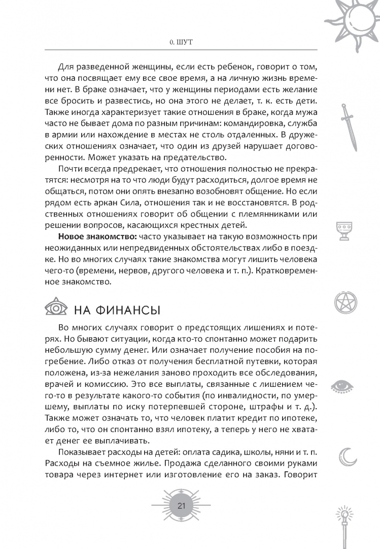 ОписаниеКнига представляет собой уникальное руководство по работе с классической колодой Райдера-Уэйта, предлагая новый взгляд на значения карт и их интерпретацию в современных реалиях.Каждый из 22 старших арканов рассматривается через призму различных жизненных ситуаций: отношения, работа, финансы и др. Приведены конкретные примеры из раскладов, включая трехкарточные расклады с итогом, что позволит читателю лучше понять, как именно общие смыслы могут раскрываться в контексте личных обстоятельств.Автор не делит карты на "положительные" и "отрицательные", считая, что каждая имеет как светлые, так и темные стороны. Например, на позиции "итог" такие карты, как "Дьявол" или "Колесо Фортуны", могут предсказывать и негативные, и позитивные исходы, в зависимости от ситуации клиента.Книга предназначена как для новичков в Таро, так и для профессионалов, ищущих новые подходы к трактовке карт. В ней предлагаются практические рекомендации для работы с раскладами, что делает ее незаменимым пособием для самостоятельного обучения.СвернутьКнига представляет собой уникальное руководство по работе с классической колодой Райдера-Уэйта, предлагая новый взгляд на значения карт и их интерпретацию в современных реалиях.Каждый из 22 старших арканов рассматривается через призму различных жизненных ситуаций: отношения, работа, финансы и др. Приведены конкретные примеры из раскладов, включая трехкарточные расклады с итогом, что позволит читателю лучше понять, как именно общие смыслы могут раскрываться в контексте личных обстоятельств.Автор не делит карты на "положительные" и "отрицательные", считая, что каждая имеет как светлые, так и темные стороны. Например, на позиции "итог" такие карты, как "Дьявол" или "Колесо Фортуны", могут предсказывать и негативные, и позитивные исходы, в зависимости от ситуации клиента.Книга предназначена как для новичков в Таро, так и для профессионалов, ищущих новые подходы к трактовке карт. В ней предлагаются практические рекомендации для работы с раскладами, что делает ее незаменимым пособием для самостоятельного обучения.СвернутьСвернуть
