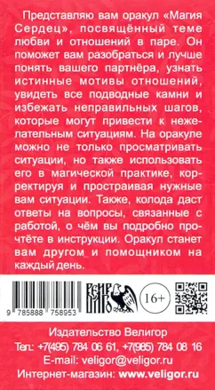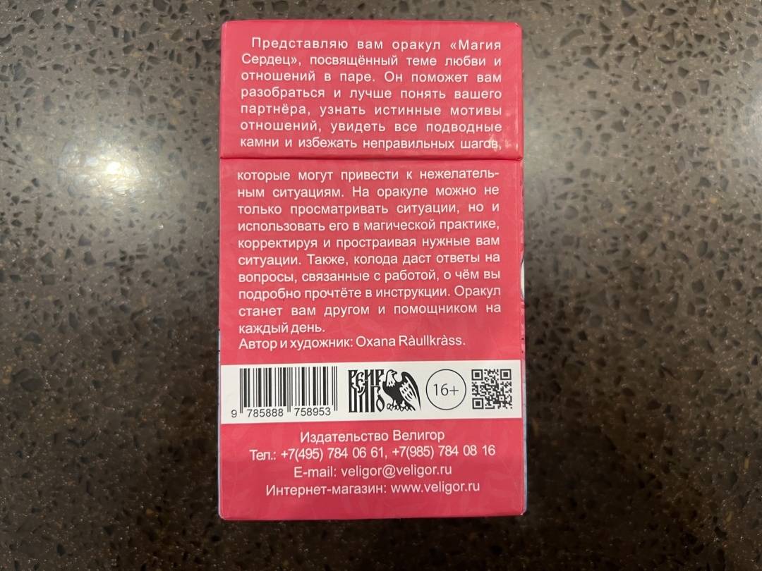 ОписаниеПредставляю вам оракул "Магия Сердец", посвящённый теме любви и отношений в паре.Он поможет вам разобраться и лучше понять вашего партнёра, узнать истинные мотивы отношений, увидеть все подводные камни и избежать неправильных шагов, которые могут привести к нежелательным ситуациям. На оракуле можно не только просматривать ситуации, но также использовать его в магической практике, корректируя и простраивая нужные вам ситуации. Также, колода даст ответы на вопросы, связанные с работой, о чём вы подробно прочтёте в инструкции. Оракул станет вам другом и помощником на каждый день.Размер карт 66х120мм + инструкция для работы с картамиПредставляю вам оракул "Магия Сердец", посвящённый теме любви и отношений в паре.Он поможет вам разобраться и лучше понять вашего партнёра, узнать истинные мотивы отношений, увидеть все подводные камни и избежать неправильных шагов, которые могут привести к нежелательным ситуациям. На оракуле можно не только просматривать ситуации, но также использовать его в магической практике, корректируя и простраивая нужные вам ситуации. Также, колода даст ответы на вопросы, связанные с работой, о чём вы подробно прочтёте в инструкции. Оракул станет вам другом и помощником на каждый день.Размер карт 66х120мм + инструкция для работы с картами