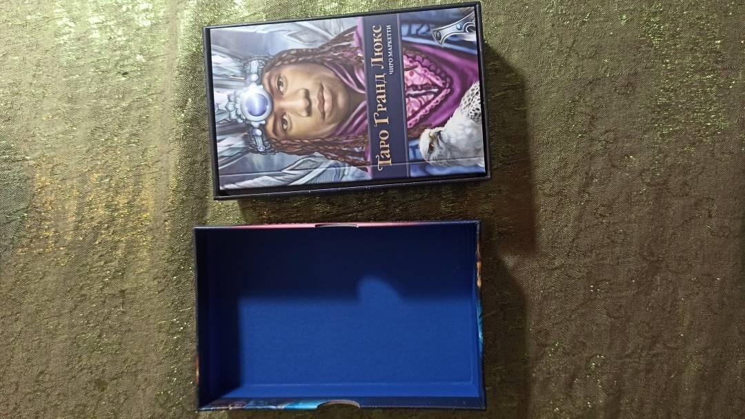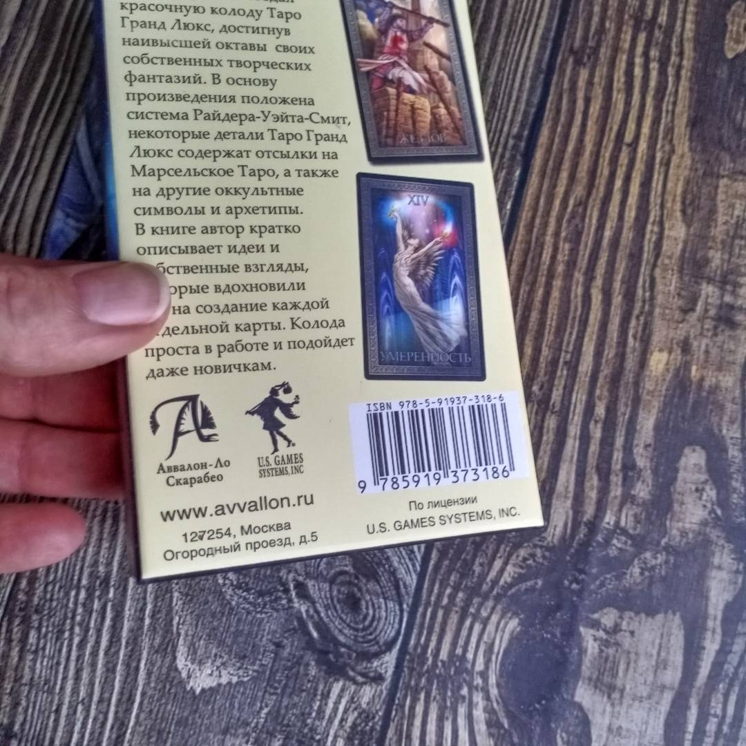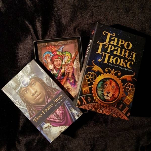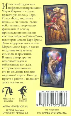 ОписаниеИзвестный художник цифровых импровизаций Чиро Маркетти создал красочную колоду Таро Гранд Люкс, достигнув наивысшей октавы своих собственных творческих фантазий. В основу произведения положена система РайдераУэйта-Смит, некоторые детали Таро Гранд Люкс содержат отсылки на Марсельское Таро, а также на другие оккультные символы и архетипы. В 56-страничном иллюстрированном буклете автор кратко описывает идеи и собственные взгляды, которые вдохновили его на создание каждой отдельной карты. Колода проста в работе и подойдет даже новичкам. Комплектация: 78 карт с инструкцией на русском языкеМатериал: картон, бумагаРазмер: 79х127 мм.Известный художник цифровых импровизаций Чиро Маркетти создал красочную колоду Таро Гранд Люкс, достигнув наивысшей октавы своих собственных творческих фантазий. В основу произведения положена система РайдераУэйта-Смит, некоторые детали Таро Гранд Люкс содержат отсылки на Марсельское Таро, а также на другие оккультные символы и архетипы. В 56-страничном иллюстрированном буклете автор кратко описывает идеи и собственные взгляды, которые вдохновили его на создание каждой отдельной карты. Колода проста в работе и подойдет даже новичкам. Комплектация: 78 карт с инструкцией на русском языкеМатериал: картон, бумагаРазмер: 79х127 мм.