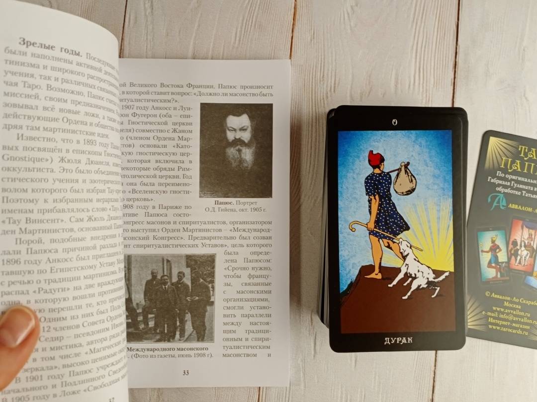 ОписаниеЭти книга и колода Таро – дань уважения к заслугам французского оккультиста Жерара Анаклета Венсана Анкосса, известного под псевдонимом Доктор Папюс, исследователя и создателя Таро, который первым познакомил с ним российскую общественность. Представленное в этом наборе Таро, в котором Папюс свёл воедино египетскую символику с еврейской Каббалой и европейской космогонией, является списком с оригинальной колоды, предложенной Папюсом в его книге «Предсказательное Таро или ключ всякого рода карточных гаданий» (1991 г.).78 карт, размер 66 x120 мм, книга и карты на русском языке по оригиналам др. Папюса.Эти книга и колода Таро – дань уважения к заслугам французского оккультиста Жерара Анаклета Венсана Анкосса, известного под псевдонимом Доктор Папюс, исследователя и создателя Таро, который первым познакомил с ним российскую общественность. Представленное в этом наборе Таро, в котором Папюс свёл воедино египетскую символику с еврейской Каббалой и европейской космогонией, является списком с оригинальной колоды, предложенной Папюсом в его книге «Предсказательное Таро или ключ всякого рода карточных гаданий» (1991 г.).78 карт, размер 66 x120 мм, книга и карты на русском языке по оригиналам др. Папюса.
