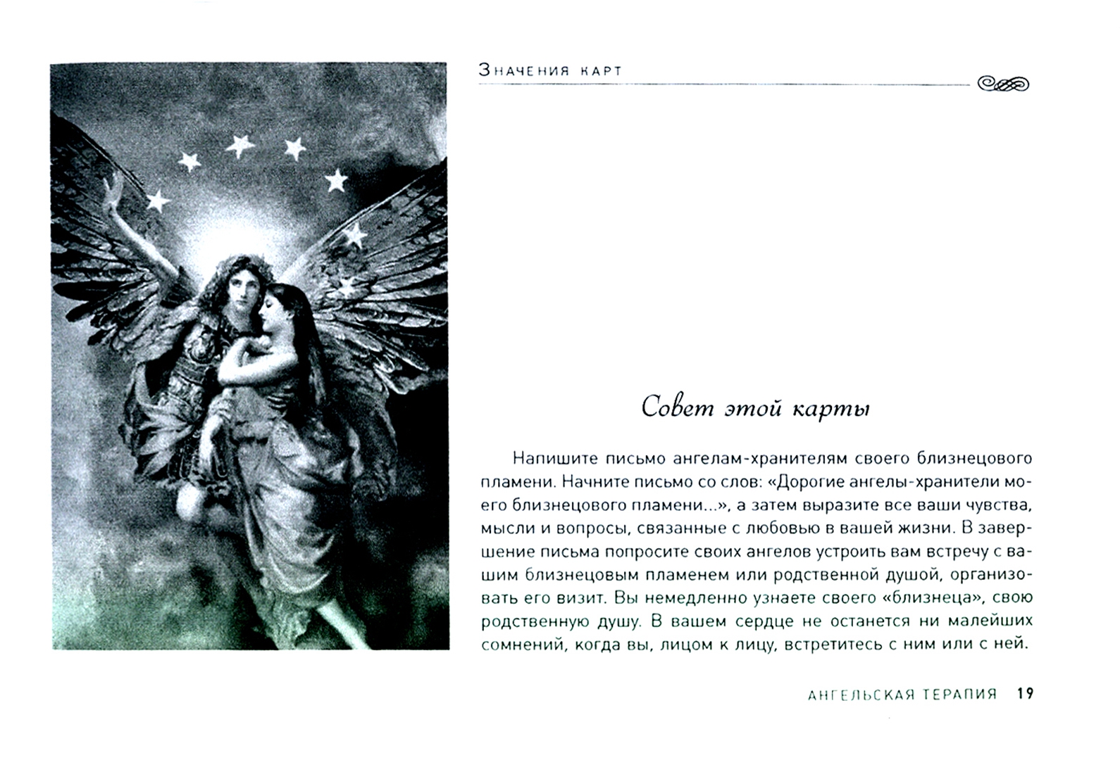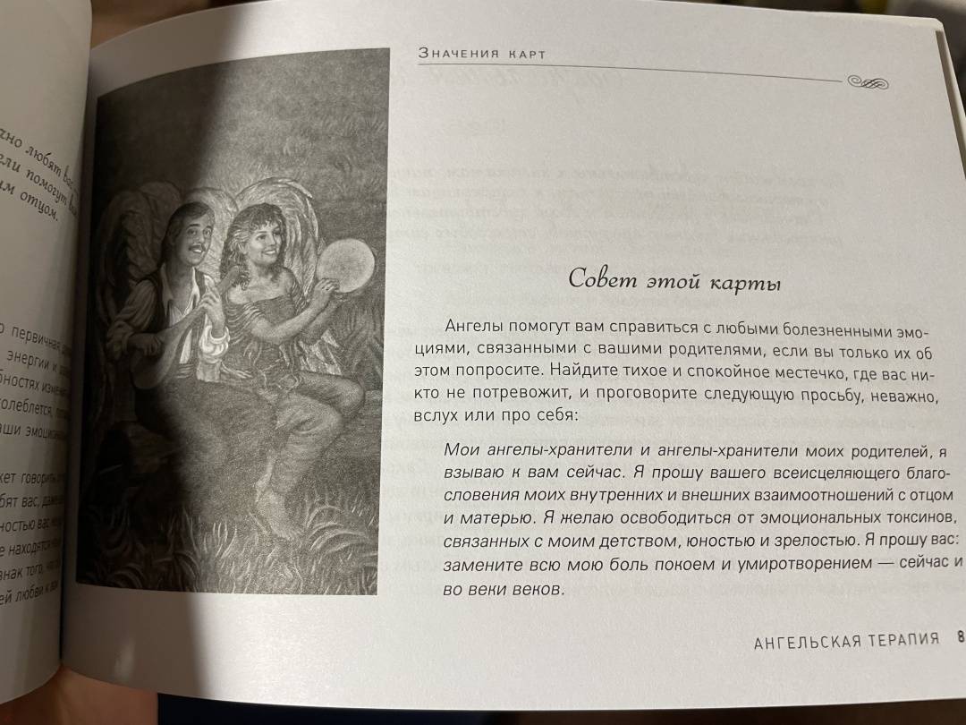 ОписаниеАнгельская терапия - действительно эффективная и безопасная методика исцеления, которая помогает избавиться от страхов и эмоциональных блоков, исцелить тело, получить необходимые указания в решении важных вопросов, информацию о смысле жизни и улучшить все ее аспекты. Ангелы-хранители и Архангелы, которые окружают нас, подчиняются Вселенскому закону свободной воли, а он гласит, что никто не может вмешиваться в нашу жизнь до тех пор, пока мы сами не попросим об этом. Гадальные карты "Ангельская терапия" и руководство по их толкованию помогут вам всегда в нужный момент получать помощь от ангелов-хранителей.Ангельская терапия - действительно эффективная и безопасная методика исцеления, которая помогает избавиться от страхов и эмоциональных блоков, исцелить тело, получить необходимые указания в решении важных вопросов, информацию о смысле жизни и улучшить все ее аспекты. Ангелы-хранители и Архангелы, которые окружают нас, подчиняются Вселенскому закону свободной воли, а он гласит, что никто не может вмешиваться в нашу жизнь до тех пор, пока мы сами не попросим об этом. Гадальные карты "Ангельская терапия" и руководство по их толкованию помогут вам всегда в нужный момент получать помощь от ангелов-хранителей.