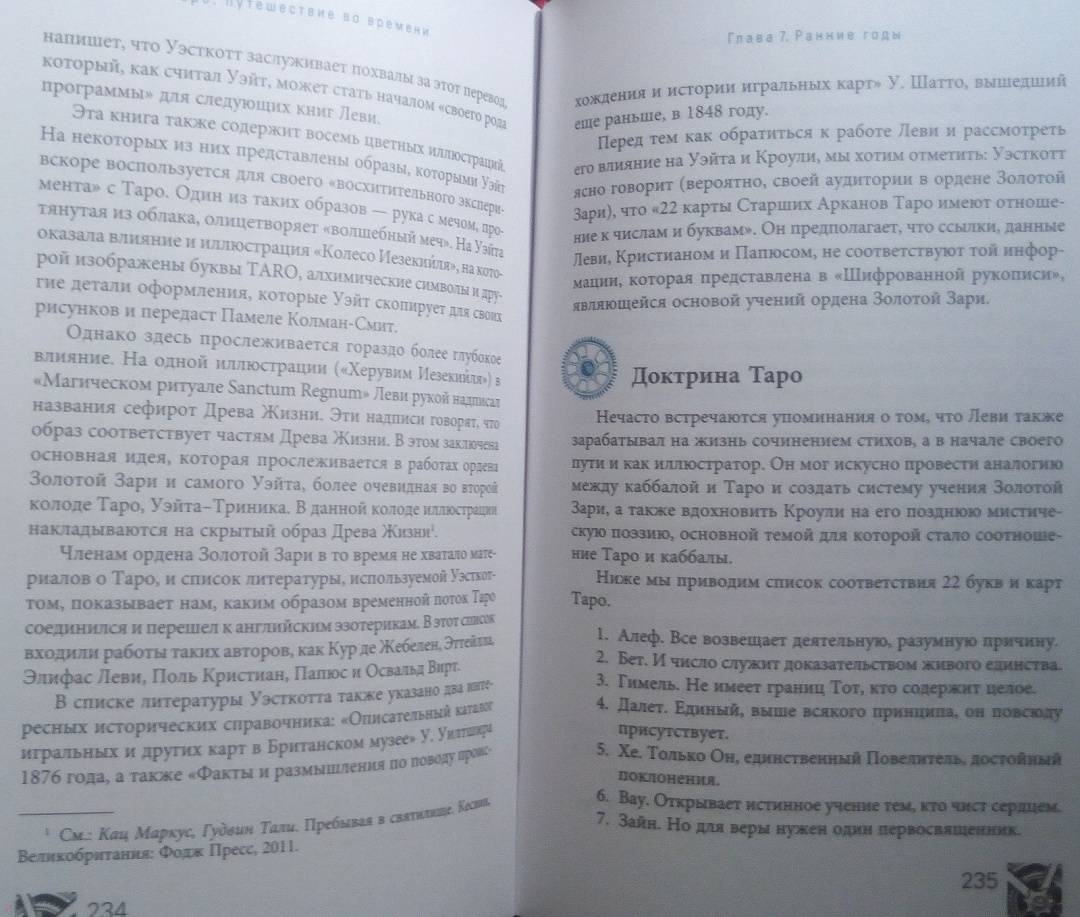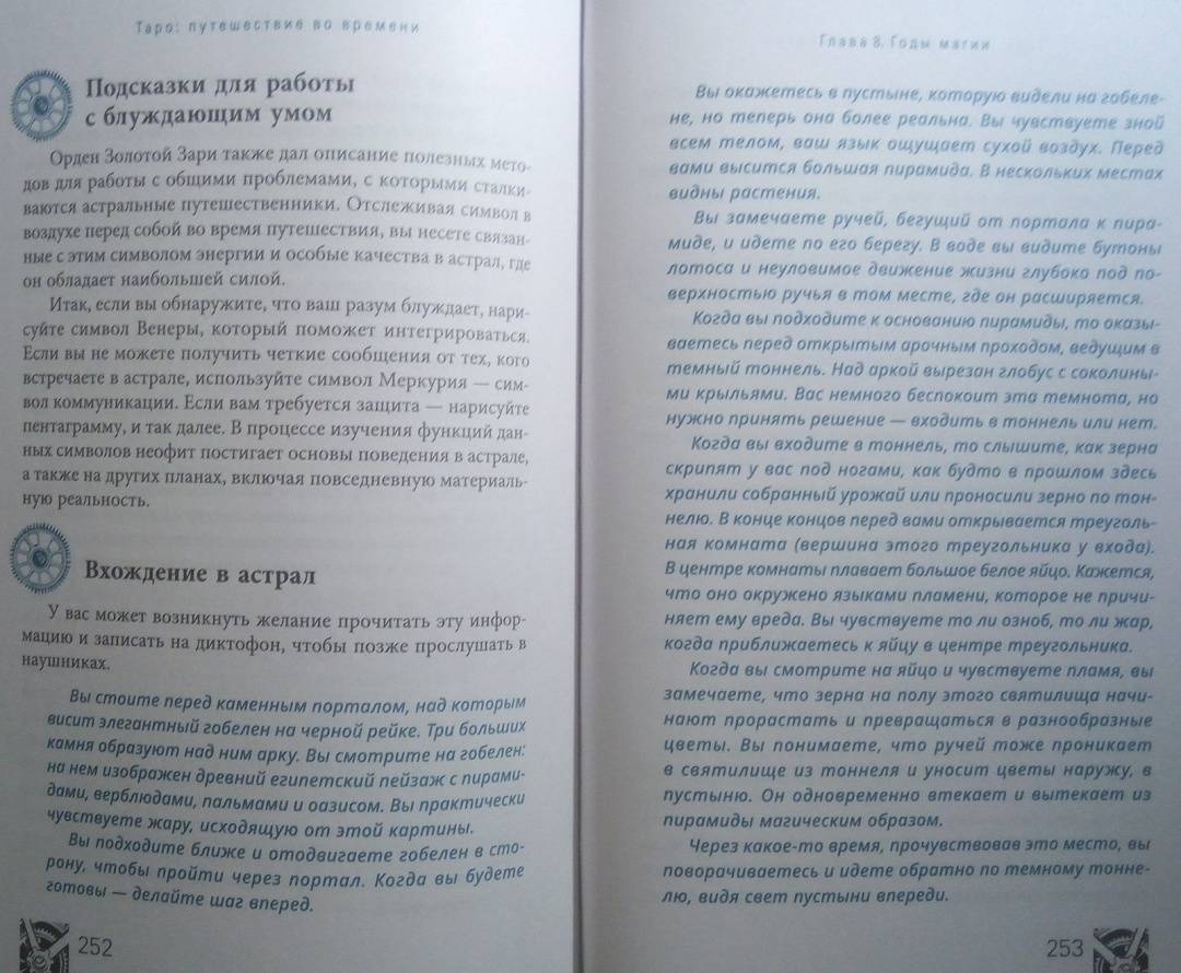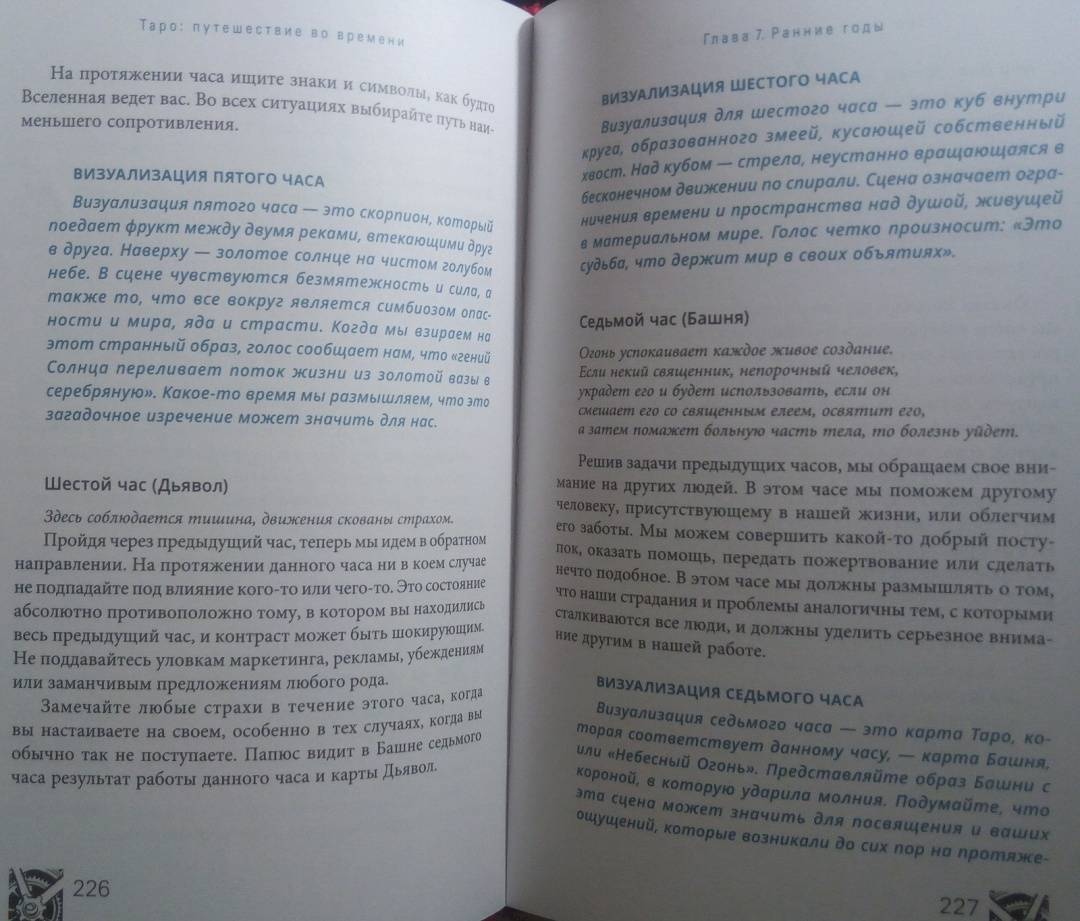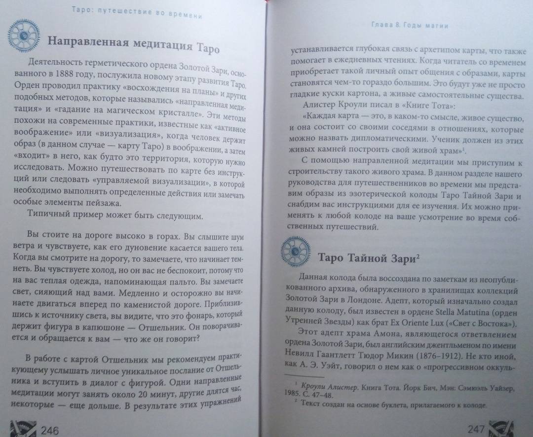 ОписаниеВы когда-нибудь задумывались, откуда пришла самая идея Таро? Как раньше выглядели гадальные колоды? И почему толкование одной и той же карты со временем менялось?Присоединяйтесь к необычному путешествию сквозь время! Авторы этой книги делятся методами чтения карт, а также их значениями и раскладами, основанными на важнейших открытиях в истории Таро. На этих страницах вы станете свидетелями создания легендарных колод, встретитесь с художниками Таро, знаменитыми мистиками и толкователями. Вас ждет:- история современных карт и их значений,- разгадка таинственных колод: Марсельского Таро, Таро Золотой Зари, Тота и Ленорман,- интересная информация о связи Таро с Каббалой, медитативными практиками и нумерологией,- способы использования игральных карт,- история возникновения перевернутых значений Таро,- более 50 старинных раскладов.О чем книгаГотовы открыть вековые тайны Таро?В этой книге их предостаточно.Вы изучите Таро с момента его появления, начав с основ картомании (предсказание будущего с помощью игральных карт). Затем освоите язык Ленорман, используя старинный вариант чтения расклада справа налево. Далее при помощи Таро познакомитесь с более сложным языком соответствий и поймете, как "входить в карты", будто в пейзажи иного мира - что необходимо для понимания этой гадательной системы.Во время странствия вы узнаете, как читать будущее, а складывать "элементы пазла" вас научат величайшие мастера Таро. По пути вы найдете множество исторических исследований и впечатляющее количество раскладов. Мы положим в вашу дорожную сумку разные способы чтения карт и варианты экстренных раскладов (всякое ведь бывает!).Двигаясь по шкале времени Таро, вы будете останавливаться на самых важных пунктах. Пристегнитесь, соблюдайте меры безопасности и наслаждайтесь поездкой в историю Таро.Маркус Кац, Тали ГудвинПочему книгу стоит прочитать"Путешествие во времени" - это организованный тур по истории Таро, который откроет новые возможности для вашей практики толкований и углубит ваши отношения с картами. Погрузившись в захватывающую историю Таро, вы отыщете ответы на многие вопросы, возникавших у каждого таролога в процессе работы, и найдете множество ценных подсказок, которые облегчат вашу дальнейшую практику.Для кого эта книгаКнига станет лучшим подарком для любого таролога. Если вы новичок, то с помощью "Путешествия во времени" пройдете полноценный курс обучения Таро. А если вы эксперт - то сможете восполнить пробелы в знаниях об этой системе гадания и изучить то, что пока недостаточно глубоко освоили. Также книга будет полезна поклонникам разных гадательных практик, ценителям эзотерики и всем, кто любит время от времени заглянуть в прошлое.Почему решили издатьПереоценить эту книгу невозможно, ведь такого подробного путеводителя по истории Таро до сегодняшнего дня не существовало! В процессе работы создания авторы совершали настоящие путешествия во времени - просматривали старинные издания, выискивали секретные документы и рукописи, посещали музеи и архивы по всему миру. Результат этого многолетнего кропотливого труда - перед вами.Информация об авторахМаркус Кац - таролог, директор Ассоциации профессионалов Таро (самой крупной организации Таро), преподаватель Таро и Каббалы в эзотерическом учебном центре Великобритании. 