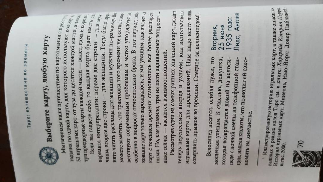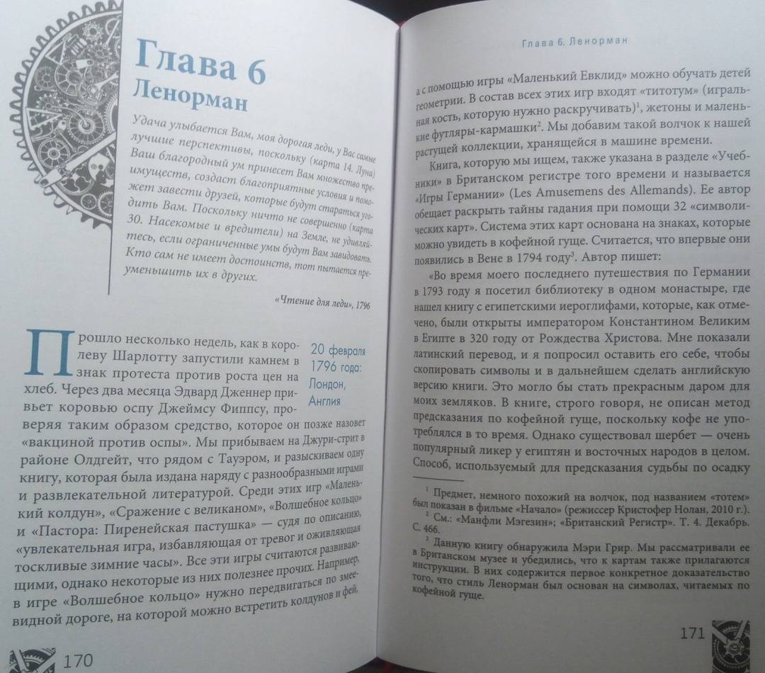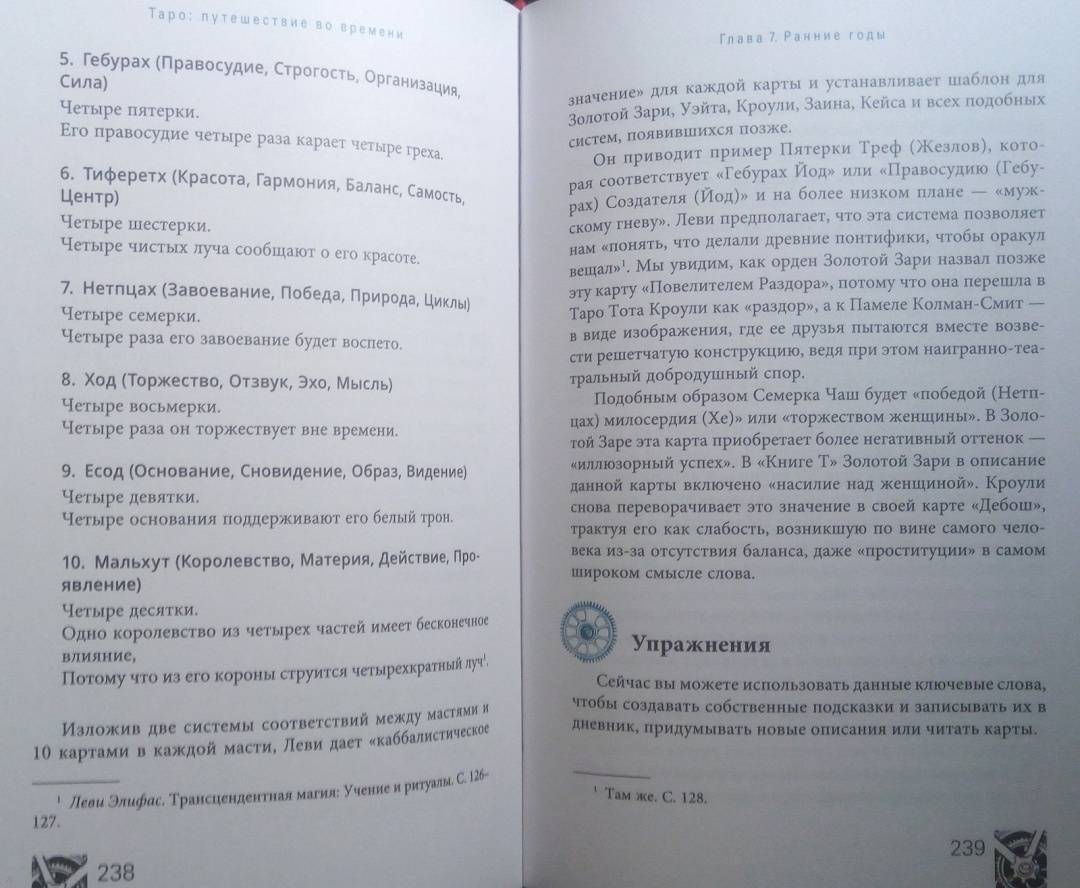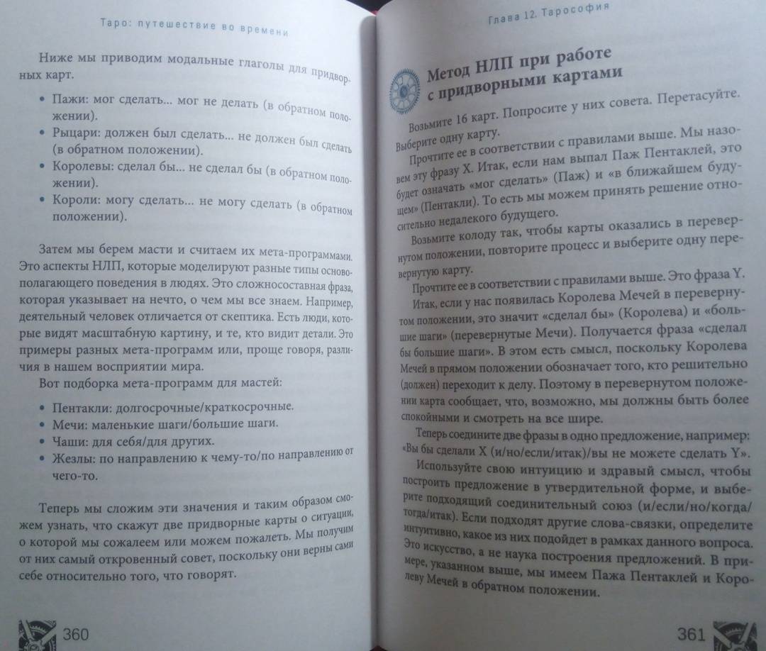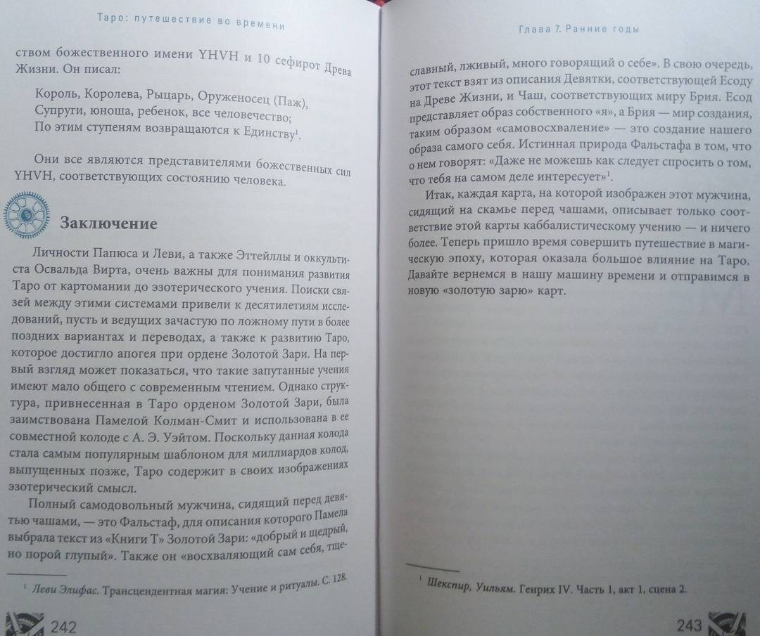 ОписаниеВы когда-нибудь задумывались, откуда пришла самая идея Таро? Как раньше выглядели гадальные колоды? И почему толкование одной и той же карты со временем менялось?Присоединяйтесь к необычному путешествию сквозь время! Авторы этой книги делятся методами чтения карт, а также их значениями и раскладами, основанными на важнейших открытиях в истории Таро. На этих страницах вы станете свидетелями создания легендарных колод, встретитесь с художниками Таро, знаменитыми мистиками и толкователями. Вас ждет:- история современных карт и их значений,- разгадка таинственных колод: Марсельского Таро, Таро Золотой Зари, Тота и Ленорман,- интересная информация о связи Таро с Каббалой, медитативными практиками и нумерологией,- способы использования игральных карт,- история возникновения перевернутых значений Таро,- более 50 старинных раскладов.О чем книгаГотовы открыть вековые тайны Таро?В этой книге их предостаточно.Вы изучите Таро с момента его появления, начав с основ картомании (предсказание будущего с помощью игральных карт). Затем освоите язык Ленорман, используя старинный вариант чтения расклада справа налево. Далее при помощи Таро познакомитесь с более сложным языком соответствий и поймете, как "входить в карты", будто в пейзажи иного мира - что необходимо для понимания этой гадательной системы.Во время странствия вы узнаете, как читать будущее, а складывать "элементы пазла" вас научат величайшие мастера Таро. По пути вы найдете множество исторических исследований и впечатляющее количество раскладов. Мы положим в вашу дорожную сумку разные способы чтения карт и варианты экстренных раскладов (всякое ведь бывает!).Двигаясь по шкале времени Таро, вы будете останавливаться на самых важных пунктах. Пристегнитесь, соблюдайте меры безопасности и наслаждайтесь поездкой в историю Таро.Маркус Кац, Тали ГудвинПочему книгу стоит прочитать"Путешествие во времени" - это организованный тур по истории Таро, который откроет новые возможности для вашей практики толкований и углубит ваши отношения с картами. Погрузившись в захватывающую историю Таро, вы отыщете ответы на многие вопросы, возникавших у каждого таролога в процессе работы, и найдете множество ценных подсказок, которые облегчат вашу дальнейшую практику.Для кого эта книгаКнига станет лучшим подарком для любого таролога. Если вы новичок, то с помощью "Путешествия во времени" пройдете полноценный курс обучения Таро. А если вы эксперт - то сможете восполнить пробелы в знаниях об этой системе гадания и изучить то, что пока недостаточно глубоко освоили. Также книга будет полезна поклонникам разных гадательных практик, ценителям эзотерики и всем, кто любит время от времени заглянуть в прошлое.Почему решили издатьПереоценить эту книгу невозможно, ведь такого подробного путеводителя по истории Таро до сегодняшнего дня не существовало! В процессе работы создания авторы совершали настоящие путешествия во времени - просматривали старинные издания, выискивали секретные документы и рукописи, посещали музеи и архивы по всему миру. Результат этого многолетнего кропотливого труда - перед вами.Информация об авторахМаркус Кац - таролог, директор Ассоциации профессионалов Таро (самой крупной организации Таро), преподаватель Таро и Каббалы в эзотерическом учебном центре Великобритании. 