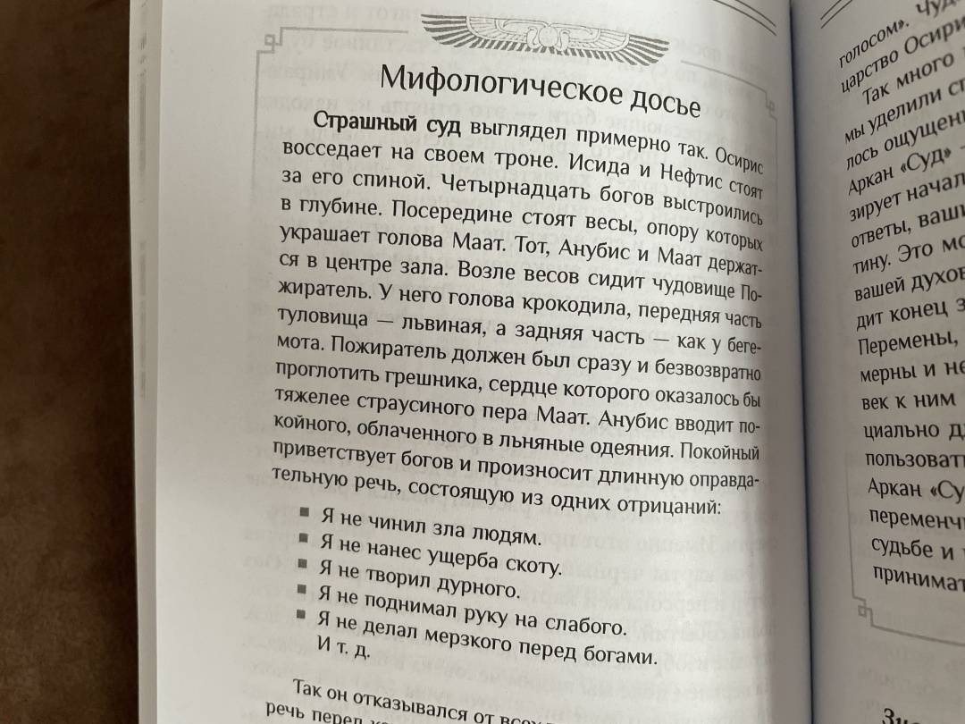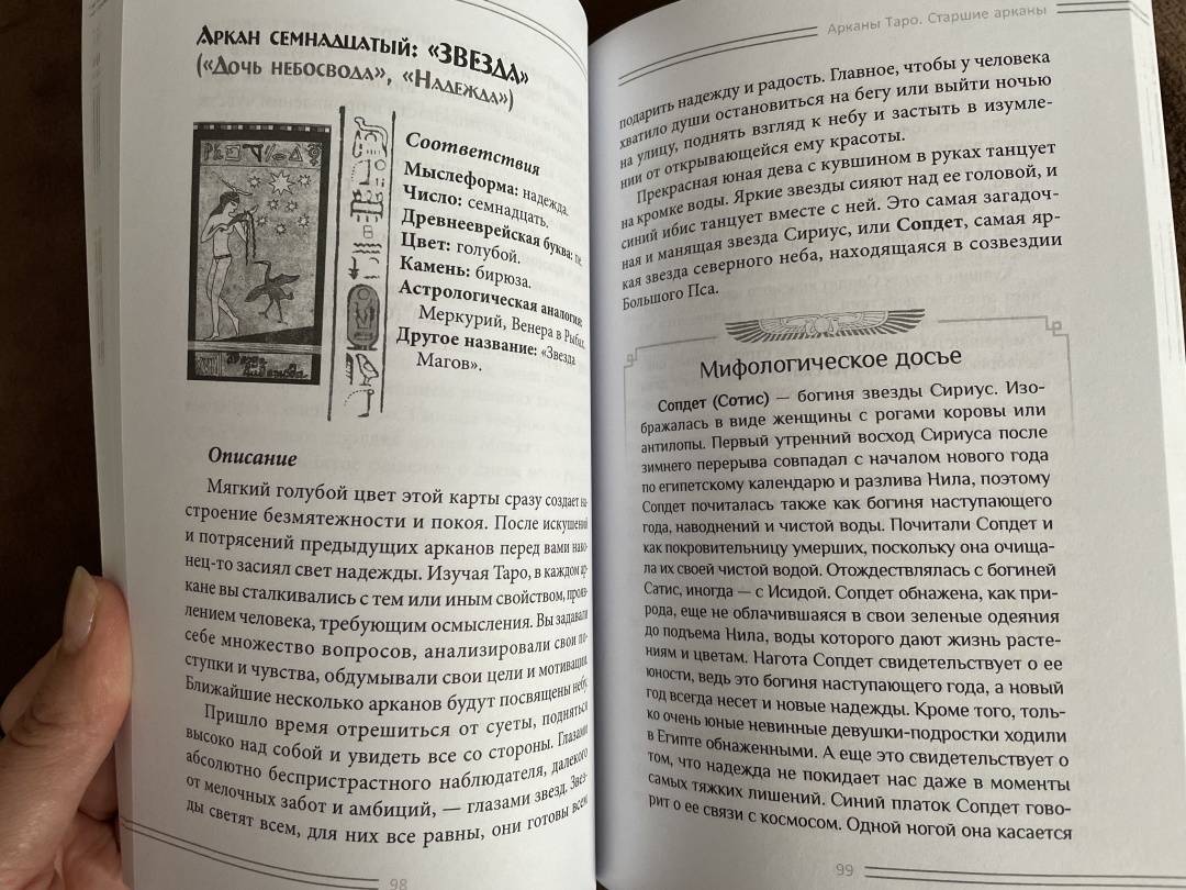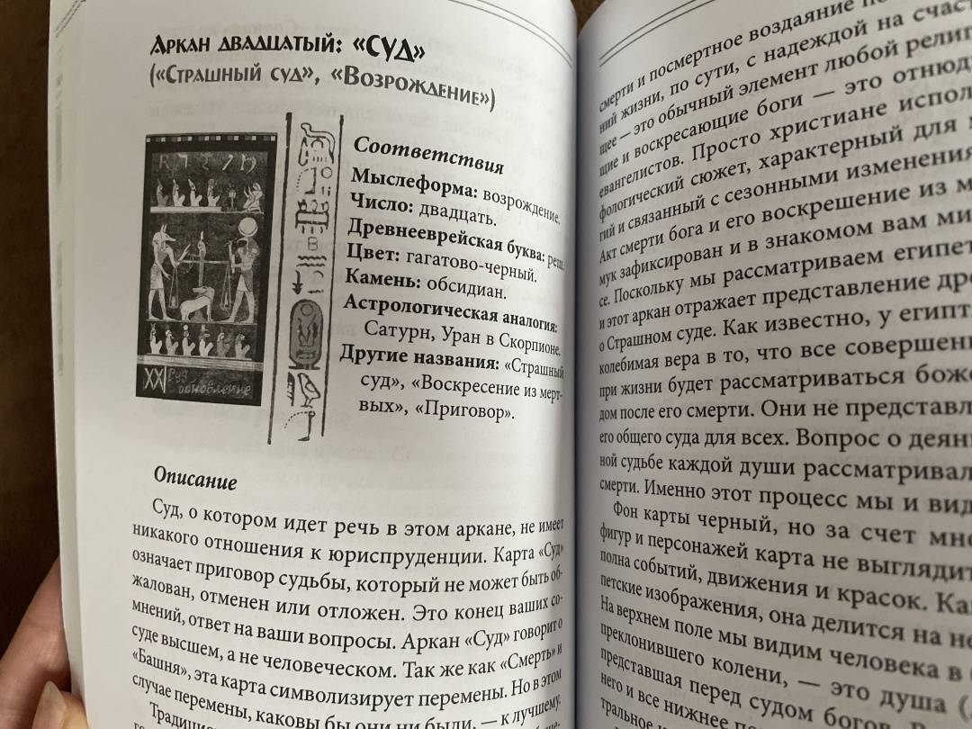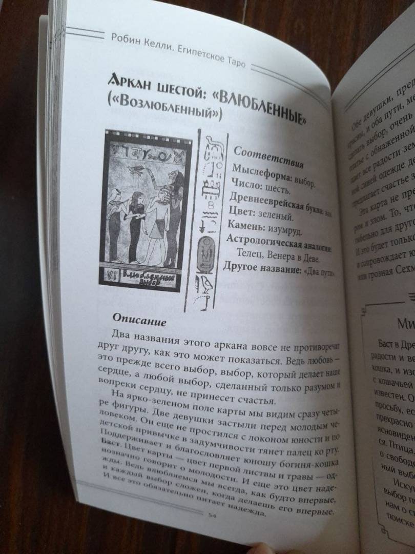 ОписаниеКнига знакомит с одной из самых мистических колод — «Египетское Таро». В основе колоды лежит система традиционного Таро — 22 Старших аркана и 56 Младших. Уникальность карт заключается в их оформлении: атмосферные рисунки, передающие времена царствования фараонов, египетские мотивы, настенную живопись Древнего Египта.Представлена детальная трактовка карт, значение в раскладе. Описаны способы работы с картами, правила проведения сеансов гадания. Вы найдете более10 раскладов, с помощью которых возможно прояснить самые насущные вопросы — в любви, карьере, здоровье, духовных поисках.В конце книги вас ждет приятный сюрприз: цветная вклейка с изображениями Старших арканов. Вырежьте карты — и можно приступать к сеансу предсказания!Для широкого круга читателей.О чем книгаВ первой части книги вы познакомитесь с краткой историей Таро, узнаете о многообразии колод и культуре общения с картами.Вторая часть целиком посвящена колоде «Египетское Таро»: подробно описаны Старшие арканы (даны соответствия по числам, буквам иврита, цветам, камням, а также астрологическая аналогия). Представлено значение карт в раскладе в прямом и перевернутом положении.Третья часть книги о том, как использовать карты для предсказаний. Рассказывается о правилах проведения сеансов гадания:- как подготовить колоду- как правильно задать вопрос,- как часто можно гадать,- как раскладывать карты себе и клиенту.Вашему вниманию предлагается более 10 раскладов на все случаи жизни: личные отношения, здоровье, финансы, духовные поиски, прошлые жизни, определение оптимального выхода из конкретных ситуаций и др.Предусмотрены варианты гадания на полной колоде или только с использованием Старших арканов.Почему книгу стоит прочитатьУзнать будущее – мечта многих, и эту возможность могут подарить карты Таро. Их смысл — в отражении ключевых жизненных ситуаций в образах Старших арканов. Через различные комбинации карт таролог может нарисовать полную психологическую и событийную картину жизни человека, и в том числе предсказать будущее.В этой книге есть всё, чтобы даже новичок в Таро смог провести сеанс предсказания судьбы.Для кого эта книгаДля тех, кто:- увлекается картами Таро — новичков и профессионалов;- хочет внести разнообразие в практику и освоить работу с нестандартными колодами;- познает эзотерические учения и магию;- изучает различные системы предсказаний.Книга прекрасно дополнит библиотеку по Таро у знатоков.Почему решили издатьЛюди, которые практикуют работу с Таро уже давно, наверняка повидали много колод — классических, авторских, фантазийных. Каждая колода обязательно находит своего владельца! Мы надеемся, что «Египетское Таро», описанное в книге, придется по душе любителям карт и внесет разнообразие и добавит особый колорит в работу с великими арканами.СвернутьКнига знакомит с одной из самых мистических колод — «Египетское Таро». В основе колоды лежит система традиционного Таро — 22 Старших аркана и 56 Младших. Уникальность карт заключается в их оформлении: атмосферные рисунки, передающие времена царствования фараонов, египетские мотивы, настенную живопись Древнего Египта.Представлена детальная трактовка карт, значение в раскладе. Описаны способы работы с картами, правила проведения сеансов гадания. Вы найдете более10 раскладов, с помощ