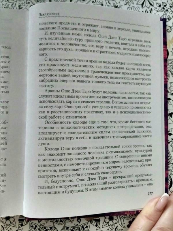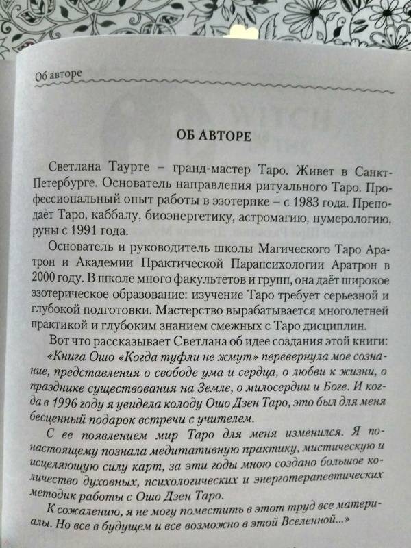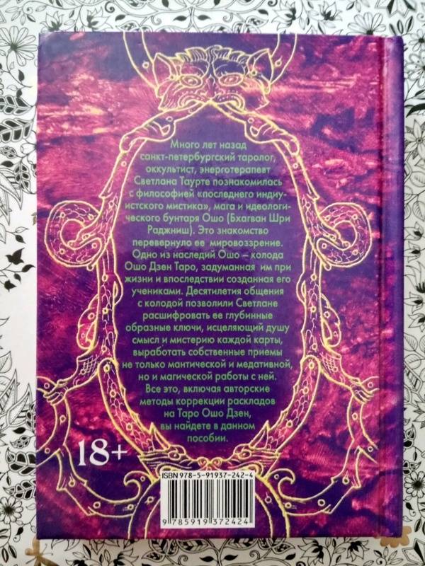 ОписаниеЧасть философского наследия знаменитого Ошо (Бхагван Шри Раджниша) - "последнего индуистского мистика", мага, идеологического бунтаря - колода Таро, задуманная им при жизни и позже воссозданная его учениками. Знакомство с Ошо Дзен Таро стало для российский таролога и энерготерапевта Светланы Таурте судьбоносным. Опытному оккультисту, ей удалось расшифровать глубинные образные ключи колоды, смысл и мистерию каждого Аркана. Выработать собственные приемы не только предсказательной, но и медитативной, и магической, в том числе целительской, работы с колодой. Все это, включая авторские алгоритмы коррекции раскладов на Таро Ошо Дзен, вы найдете в данном пособии, адресованном как тарологампрактикам, так и тем, кого интересует современная восточная философия и наследие Ошо.Часть философского наследия знаменитого Ошо (Бхагван Шри Раджниша) - "последнего индуистского мистика", мага, идеологического бунтаря - колода Таро, задуманная им при жизни и позже воссозданная его учениками. Знакомство с Ошо Дзен Таро стало для российский таролога и энерготерапевта Светланы Таурте судьбоносным. Опытному оккультисту, ей удалось расшифровать глубинные образные ключи колоды, смысл и мистерию каждого Аркана. Выработать собственные приемы не только предсказательной, но и медитативной, и магической, в том числе целительской, работы с колодой. Все это, включая авторские алгоритмы коррекции раскладов на Таро Ошо Дзен, вы найдете в данном пособии, адресованном как тарологампрактикам, так и тем, кого интересует современная восточная философия и наследие Ошо.