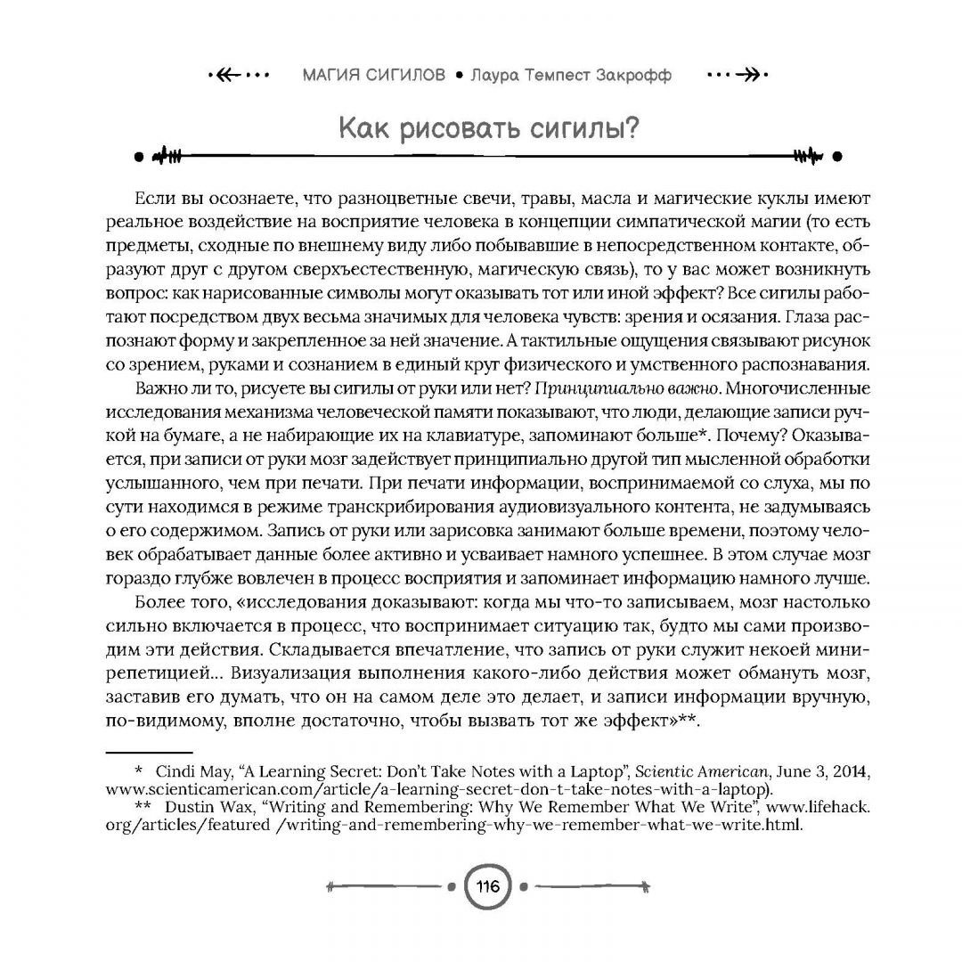ОписаниеМагия сигилов - это создание особых символов для воздействия с их помощью на человека, ситуацию или внешние обстоятельства.Двигаясь от простого к сложному, превращаясь из новичка в специалиста, вы научитесь создавать собственные сигилы. Для этого требуется лишь дать волю воображению и умение рисовать простые символы. Помните, как в школе вы гадали, пригодится ли вам когда-нибудь геометрия в реальной жизни? Похоже, сейчас это время пришло, но теперь никто не будет ставить вам оценок!Так что в сторону страхи и опасения, берите бумагу и ручку, давайте повеселимся! Я с удовольствием познакомлю вас с волшебным миром магии сигилов и помогу научиться извлекать из них пользу.Лаура Темпест ЗакроффМагия сигилов - это создание особых символов для воздействия с их помощью на человека, ситуацию или внешние обстоятельства.Двигаясь от простого к сложному, превращаясь из новичка в специалиста, вы научитесь создавать собственные сигилы. Для этого требуется лишь дать волю воображению и умение рисовать простые символы. Помните, как в школе вы гадали, пригодится ли вам когда-нибудь геометрия в реальной жизни? Похоже, сейчас это время пришло, но теперь никто не будет ставить вам оценок!Так что в сторону страхи и опасения, берите бумагу и ручку, давайте повеселимся! Я с удовольствием познакомлю вас с волшебным миром магии сигилов и помогу научиться извлекать из них пользу.Лаура Темпест Закрофф