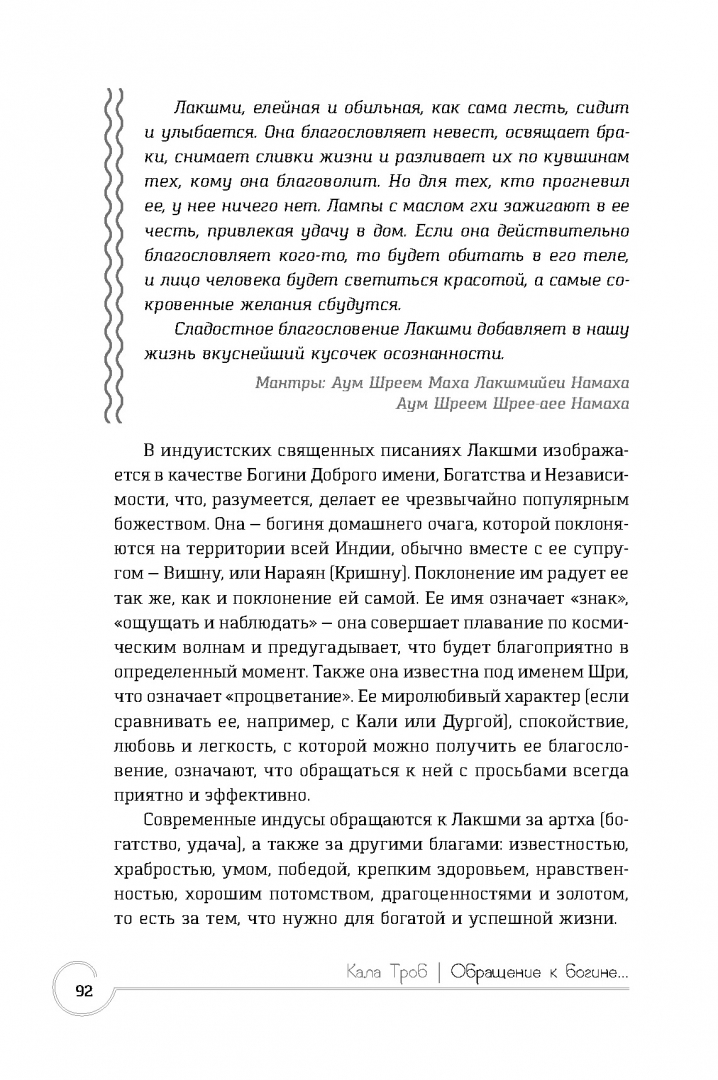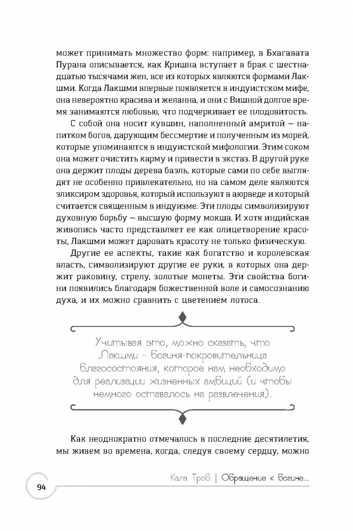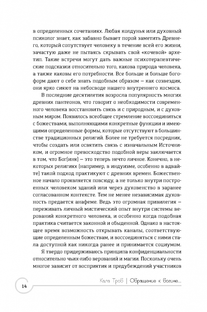 ОписаниеСовременный человек все острее испытывает потребность восстановить связь с природным и духовным миром, чтобы обрести гармонию в душе и ответить на самые важные вопросы: в чем смысл жизни? что я могу сделать для себя и других? как стать сильнее? Древние религии таят в себе мудрость тысячелетий, и потому сегодня люди проявляют к ним повышенный интерес.Благодаря данному изданию вы получите представление о пятнадцати богинях из трех пантеонов (Индии, Древнего Египта и Древней Греции), узнаете о связанных с ними традиционных мифах и легендах. А уникальные авторские медитации подарят возможность открывать каналы к божествам и обращаться к ним напрямую.Вы научитесь через визуализацию переживать мистический опыт и находить ответы на ранее неразрешимые вопросы. Контакт с богинями поможет справиться как с мелкими жизненными неурядицами, так и с серьезными психологическими травмами. Подарит благословение и поддержку, любовь и мудрость.Освоив предлагаемые техники, вы научитесь распознавать присутствие и подсказки божественных сил. Для этого вам понадобятся лишь открытые сердце и разум.Мы желаем вам приятного плавания по течению священных вод!СвернутьСовременный человек все острее испытывает потребность восстановить связь с природным и духовным миром, чтобы обрести гармонию в душе и ответить на самые важные вопросы: в чем смысл жизни? что я могу сделать для себя и других? как стать сильнее? Древние религии таят в себе мудрость тысячелетий, и потому сегодня люди проявляют к ним повышенный интерес.Благодаря данному изданию вы получите представление о пятнадцати богинях из трех пантеонов (Индии, Древнего Египта и Древней Греции), узнаете о связанных с ними традиционных мифах и легендах. А уникальные авторские медитации подарят возможность открывать каналы к божествам и обращаться к ним напрямую.Вы научитесь через визуализацию переживать мистический опыт и находить ответы на ранее неразрешимые вопросы. Контакт с богинями поможет справиться как с мелкими жизненными неурядицами, так и с серьезными психологическими травмами. Подарит благословение и поддержку, любовь и мудрость.Освоив предлагаемые техники, вы научитесь распознавать присутствие и подсказки божественных сил. Для этого вам понадобятся лишь открытые сердце и разум.Мы желаем вам приятного плавания по течению священных вод!СвернутьСвернуть