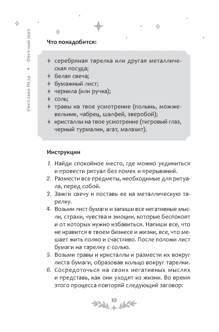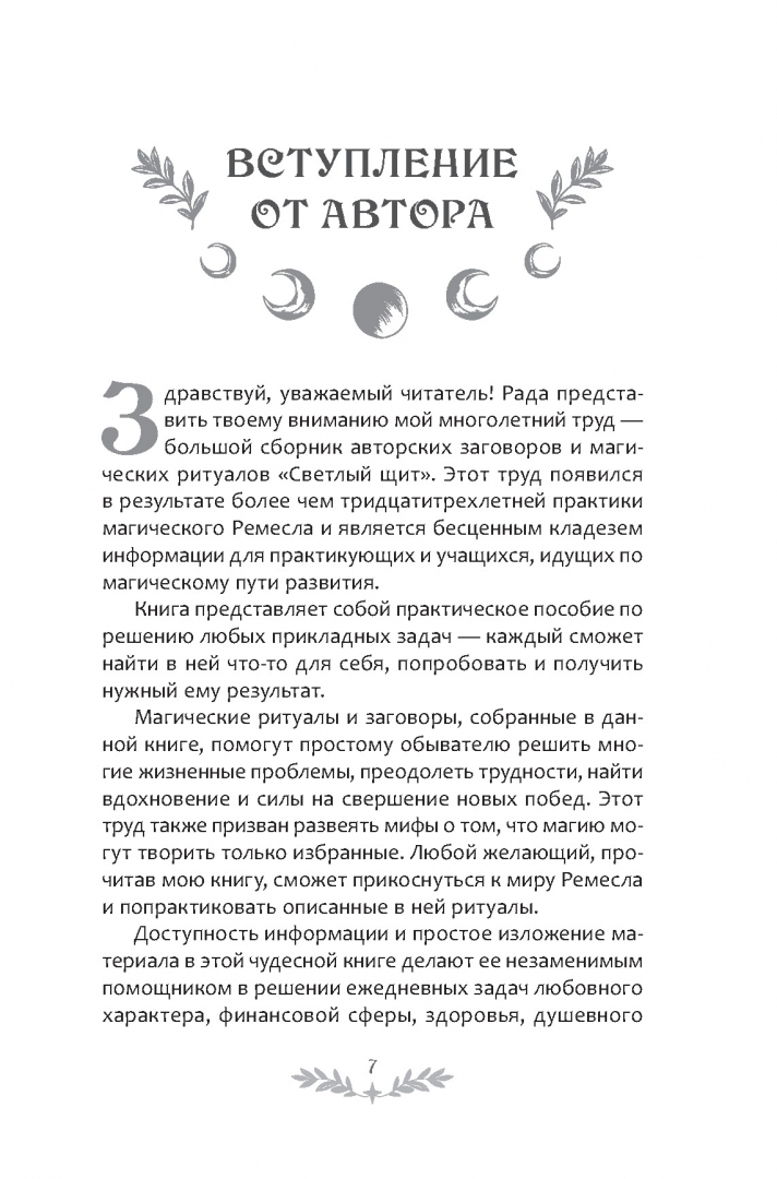 ОписаниеПеред вами большой сборник авторских заговоров и ритуалов, ценный источник знаний для всех, кто хочет изучать магическое искусство.Здесь вы найдете практические решения для самых разных задач (любовь, финансы, красота и молодость, удача и успех), попробуете множество ритуалов, чтобы определить подходящий для себя и достичь желаемого результата.Собранные в данной книге магические практики и заговоры помогут вам преодолеть жизненные трудности, найти вдохновение и силы на новые достижения, получить поддержку высших сил и защититься от негатива.Книга также призвана развеять стереотипы о том, что магию могут творить только избранные. Любой желающий, прочитав ее, сможет прикоснуться к колдовскому ремеслу и провести описанные в ней ритуалы.Приятного чтения, познания и практики!Перед вами большой сборник авторских заговоров и ритуалов, ценный источник знаний для всех, кто хочет изучать магическое искусство.Здесь вы найдете практические решения для самых разных задач (любовь, финансы, красота и молодость, удача и успех), попробуете множество ритуалов, чтобы определить подходящий для себя и достичь желаемого результата.Собранные в данной книге магические практики и заговоры помогут вам преодолеть жизненные трудности, найти вдохновение и силы на новые достижения, получить поддержку высших сил и защититься от негатива.Книга также призвана развеять стереотипы о том, что магию могут творить только избранные. Любой желающий, прочитав ее, сможет прикоснуться к колдовскому ремеслу и провести описанные в ней ритуалы.Приятного чтения, познания и практики!