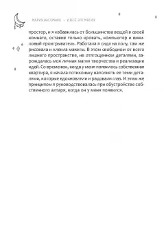 Описание«И все это магия» — проводник в мир Викки, искусства отливания свечей и создания оберегов. Мария Инсомния делится своими знаниями о том, как установить свой алтарь, как использовать силу различных магических атрибутов для привлечения желаемого в свою жизнь. Большое внимание уделяется и работе с намерениями. Мы привыкли считать, что магия — это сложные ритуалы, которые требуют комплексной подготовки — изучения заклинаний, курения благовоний и прочего. Мария Инсомния, в свою очередь, показывает, что запредельное не всегда связано с долгой и усердной подготовкой.Она предлагает рассматривать магию как инструмент, который позволяет создать собственную идеальную реальность при помощи простых шагов — повседневных действий, которые принесут вам удовлетворение и счастье.Такой подход позволит вам стать алхимиком, который может превратить свинец рутины и обыденности в «золото» магии — осознанное управление собственной жизнью.Как говорит сама Мария Инсомния: «Магия — совокупность действий, направленных на изменение своей реальности. И тут можно задуматься, что магия по сути своей не только сложные каноничные ритуалы, но и ритуалы рутинные, настраивающие нас на работу и дающие нам необходимый положительный настрой для изменения жизни к лучшему».Свернуть«И все это магия» — проводник в мир Викки, искусства отливания свечей и создания оберегов. Мария Инсомния делится своими знаниями о том, как установить свой алтарь, как использовать силу различных магических атрибутов для привлечения желаемого в свою жизнь. Большое внимание уделяется и работе с намерениями. Мы привыкли считать, что магия — это сложные ритуалы, которые требуют комплексной подготовки — изучения заклинаний, курения благовоний и прочего. Мария Инсомния, в свою очередь, показывает, что запредельное не всегда связано с долгой и усердной подготовкой.Она предлагает рассматривать магию как инструмент, который позволяет создать собственную идеальную реальность при помощи простых шагов — повседневных действий, которые принесут вам удовлетворение и счастье.Такой подход позволит вам стать алхимиком, который может превратить свинец рутины и обыденности в «золото» магии — осознанное управление собственной жизнью.Как говорит сама Мария Инсомния: «Магия — совокупность действий, направленных на изменение своей реальности. И тут можно задуматься, что магия по сути своей не только сложные каноничные ритуалы, но и ритуалы рутинные, настраивающие нас на работу и дающие нам необходимый положительный настрой для изменения жизни к лучшему».СвернутьСвернуть