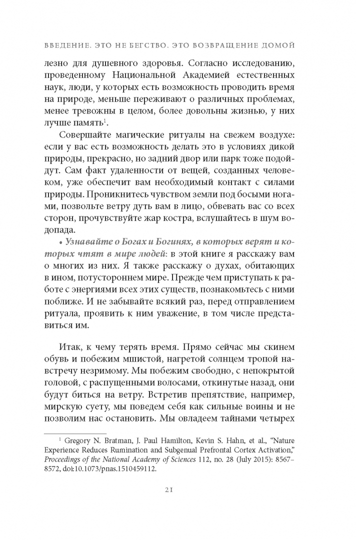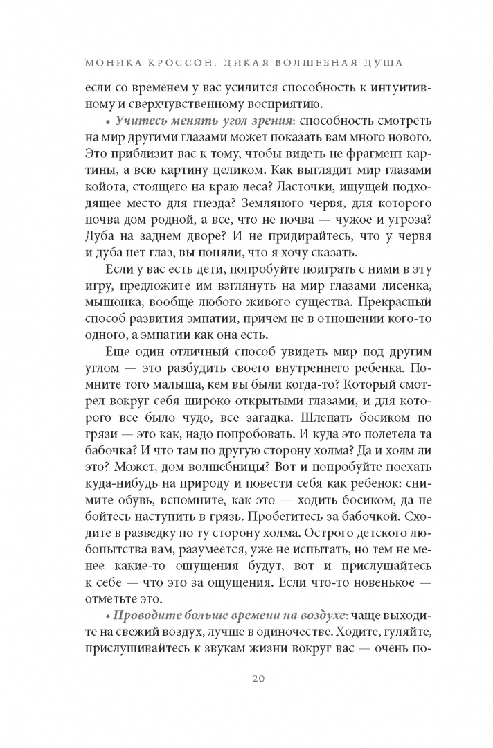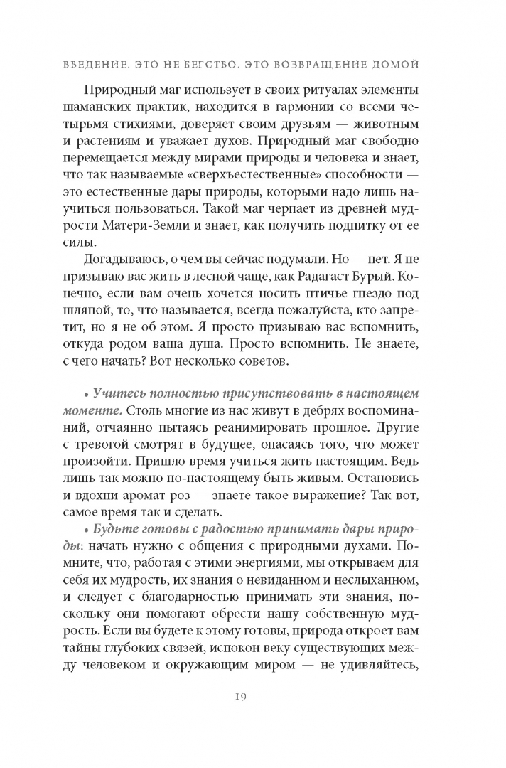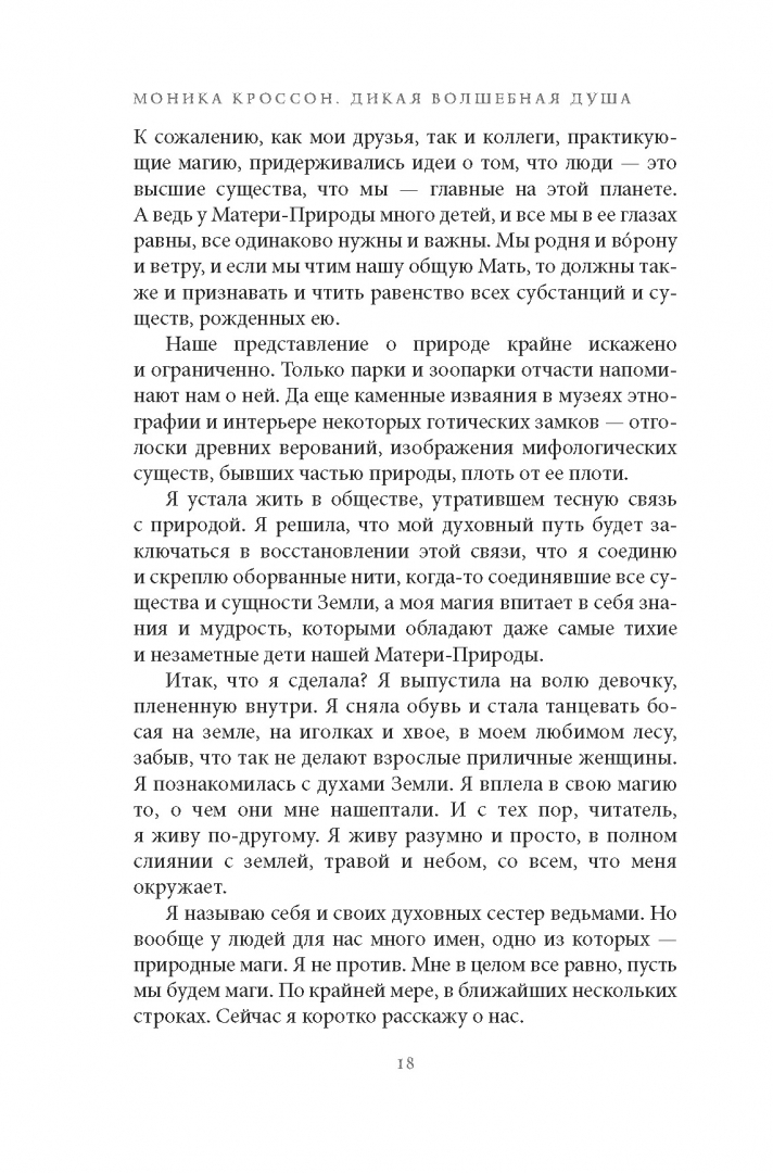 ОписаниеВплетите природную магию в свою жизнь! Пробудите древнюю волшебную силу, что дремлет в каждом из нас, и заряжайтесь ее мощью, чтобы развить магические навыки и углубить ведьмовской опыт. Практики, заклинания и обряды Моники Кроссон, опытной ведьмы, поспособствуют трансформации вашего духа и помогут соединиться с мудростью Природы. Осознанный контакт с миром растений и животных приближает нас к истокам, дарит уникальные переживания и помогает ощутить поддержку целой Вселенной! Прогулки по таинственным чащобам, покорение гор, погружение в пучину вод, бег по лугам или неспешный променад по дорожкам в парке... Наблюдение за птицами и насекомыми, игра с домашними питомцами, уход за растениями… Вы узнаете, как эти занятия можно превратить в магическую практику, доступную всем, кто чувствует радость от общения с природным миром."Итак, к чему терять время. Прямо сейчас мы скинем обувь и побежим мшистой, нагретой солнцем тропой навстречу незримому. Мы побежим свободно, с непокрытой головой, с распущенными волосами, откинутыми назад, они будут развеваться на ветру. Встретив препятствие, например, мирскую суету, мы поведем себя как сильные воины и не позволим нас остановить. Мы овладеем тайнами четырех стихий: Земли, Воздуха, Огня и Воды. Мы сполна насладимся теми дарами, что может дать нам природа. Мы взглянем на привычный мир новыми глазами. Мы будем необузданны и свободны" (Моника Кроссон).СвернутьВплетите природную магию в свою жизнь! Пробудите древнюю волшебную силу, что дремлет в каждом из нас, и заряжайтесь ее мощью, чтобы развить магические навыки и углубить ведьмовской опыт. Практики, заклинания и обряды Моники Кроссон, опытной ведьмы, поспособствуют трансформации вашего духа и помогут соединиться с мудростью Природы. Осознанный контакт с миром растений и животных приближает нас к истокам, дарит уникальные переживания и помогает ощутить поддержку целой Вселенной! Прогулки по таинственным чащобам, покорение гор, погружение в пучину вод, бег по лугам или неспешный променад по дорожкам в парке... Наблюдение за птицами и насекомыми, игра с домашними питомцами, уход за растениями… Вы узнаете, как эти занятия можно превратить в магическую практику, доступную всем, кто чувствует радость от общения с природным миром."Итак, к чему терять время. Прямо сейчас мы скинем обувь и побежим мшистой, нагретой солнцем тропой навстречу незримому. Мы побежим свободно, с непокрытой головой, с распущенными волосами, откинутыми назад, они будут развеваться на ветру. Встретив препятствие, например, мирскую суету, мы поведем себя как сильные воины и не позволим нас остановить. Мы овладеем тайнами четырех стихий: Земли, Воздуха, Огня и Воды. Мы сполна насладимся теми дарами, что может дать нам природа. Мы взглянем на привычный мир новыми глазами. Мы будем необузданны и свободны" (Моника Кроссон).СвернутьСвернуть