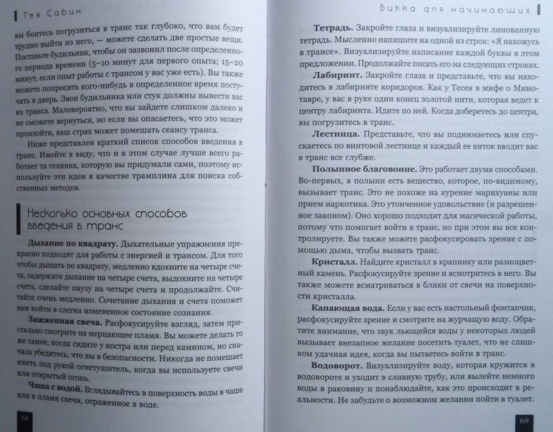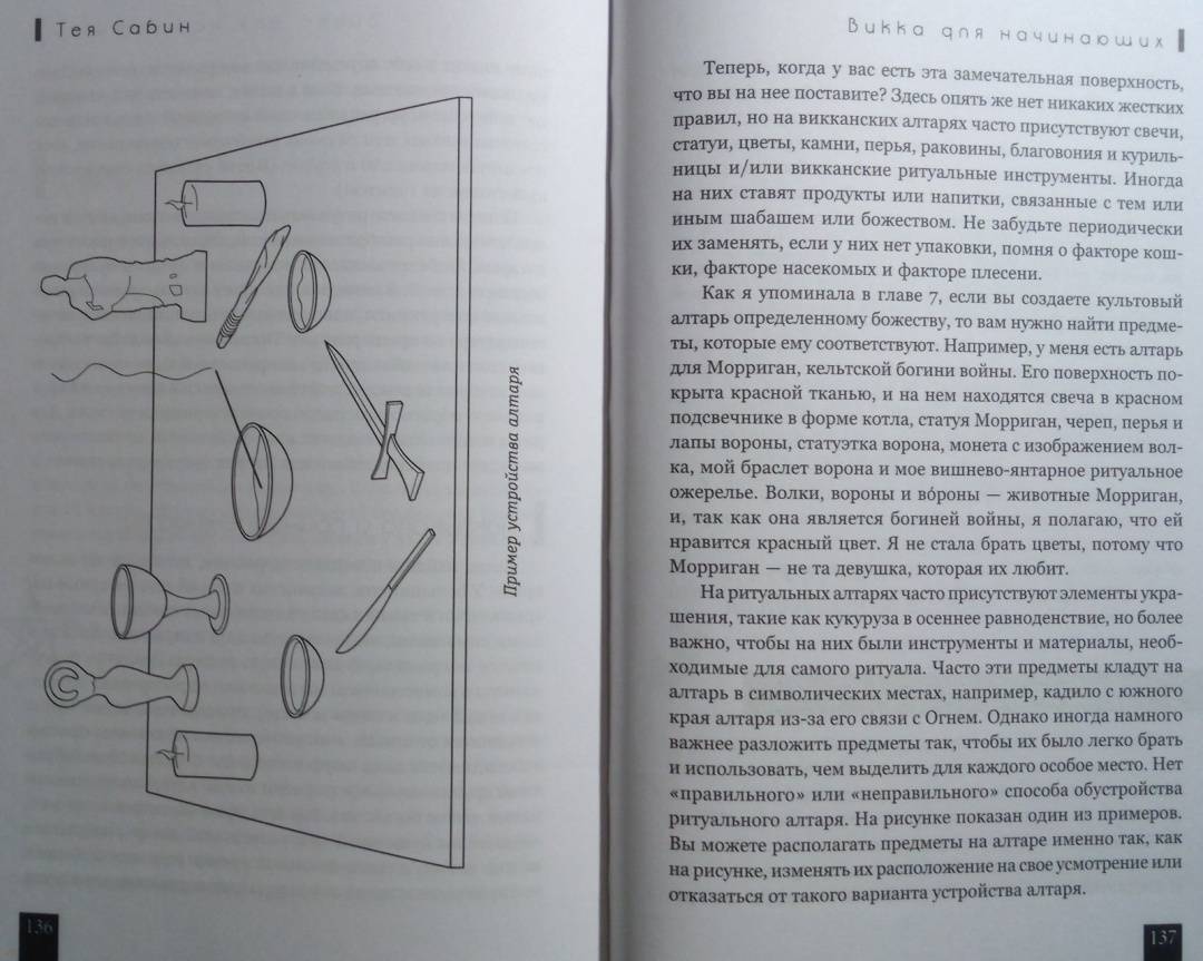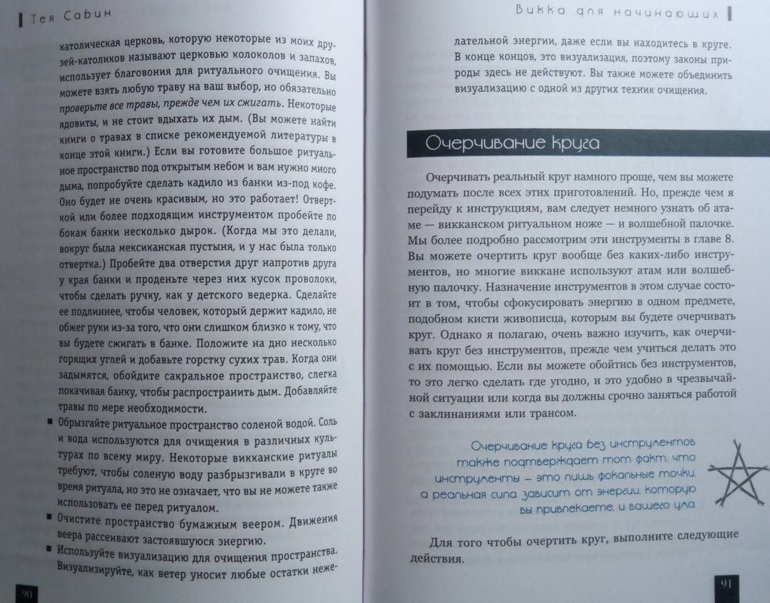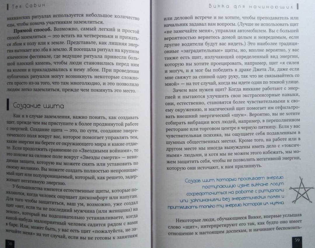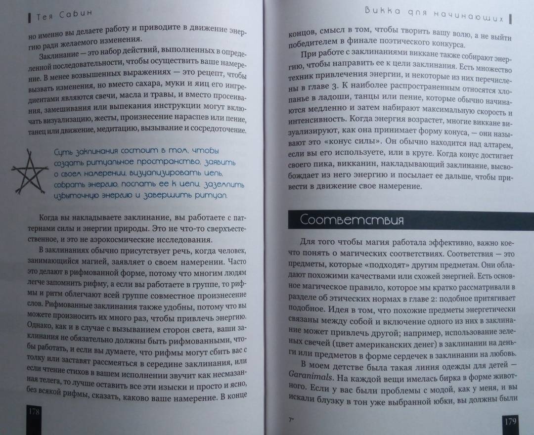ОписаниеТея Сабин познакомит вас с основами природной магии - викки. Даже если вы впервые держите в руках подобную книгу, прочитав ее, вы…- узнаете о назначении и применении магических инструментов и атрибутов - волшебная палочка, чаша, свеча, метла, соль, вода;- получите рекомендации по оформлению собственного алтаря;- научитесь создавать сакральное пространство (очерчивать и размечать круг);- сможете работать с четырьмя природными стихиями и сторонами света;- пройдете двенадцать шагов к созданию идеального заклинания;- освоите такие викканские практики, как визуализация, заземление, магический щит, транс и медитация;- и найдете ориентиры для поиска вашего личного пути в магии.Силы природы готовы помочь в осуществлении ваших целей, осталось лишь призвать их.Удачного вам ведовства!Почему книгу стоит прочитатьКнига построена по такому принципу, что каждую технику можно применять и отдельно, и как часть более сложного ритуала. Если, к примеру, вы освоите заземление, эта практика, с одной стороны, будет помогать вам снимать стресс и избавляться от негативной энергии, а с другой - станет отличной подготовкой к любому магическому обряду.Таким образом вы сможете использовать новые навыки или сами по себе - для улучшения своего самочувствия, исцеления или получения экстрасенсорной информации. Или, освоив их все к концу чтения, перейти на следующую ступень - к созданию индивидуальных заклинаний и ритуалов для решения более масштабных задач. Все необходимые упражнения, рекомендации и примеры есть в книге!Для кого эта книгаКнига будет интересна и тем, кто впервые приступает к изучению викки, и опытным магам - всегда полезно "сверить часы" с тем, кто практикует не один десяток лет.Тея Сабин с юности была организатором различных викканских организаций, так что в основе книги не только личный опыт автора, но и ее единомышленников.Почему решили издатьВ своей книге Тея Сабин уделяет особое внимание вопросам викканской этики и поиска индивидуального пути в магии. Вы получите информацию обо всех ныне существующих направлениях викки - прямо с магической передовой. А также советы, которые помогут вам определиться, практиковать одному или примкнуть к какой-либо существующей организации (например, в Интернете) - и как не ошибиться в своем выборе.Мы думаем, что "гигиена", о которой пишет Тея Сабин, при выборе средств и союзников на пути к своим целям - важная тема в современном мире, в том числе и в мире магии. Мы хотим, чтобы ваша практика была не только эффективной, но и безопасной.Информация об автореТея Сабин - писательница, с юных лет практикующая викку. В настоящее время она и ее муж руководят ковеном британской традиции на туманном тихоокеанском побережье северо-запада США.СвернутьТея Сабин познакомит вас с основами природной магии - викки. Даже если вы впервые держите в руках подобную книгу, прочитав ее, вы…- узнаете о назначении и применении магических инструментов и атрибутов - волшебная палочка, чаша, свеча, метла, соль, вода;- получите рекомендации по оформлению собственного алтаря;- научитесь создавать сакральное пространство (очерчивать и размечать круг);- сможете работать с четырьмя природными стихиями и сторонами света;- пройдете двенадцать шагов к созданию идеального заклинания;- освоите такие викканские практики, как визуализация, 