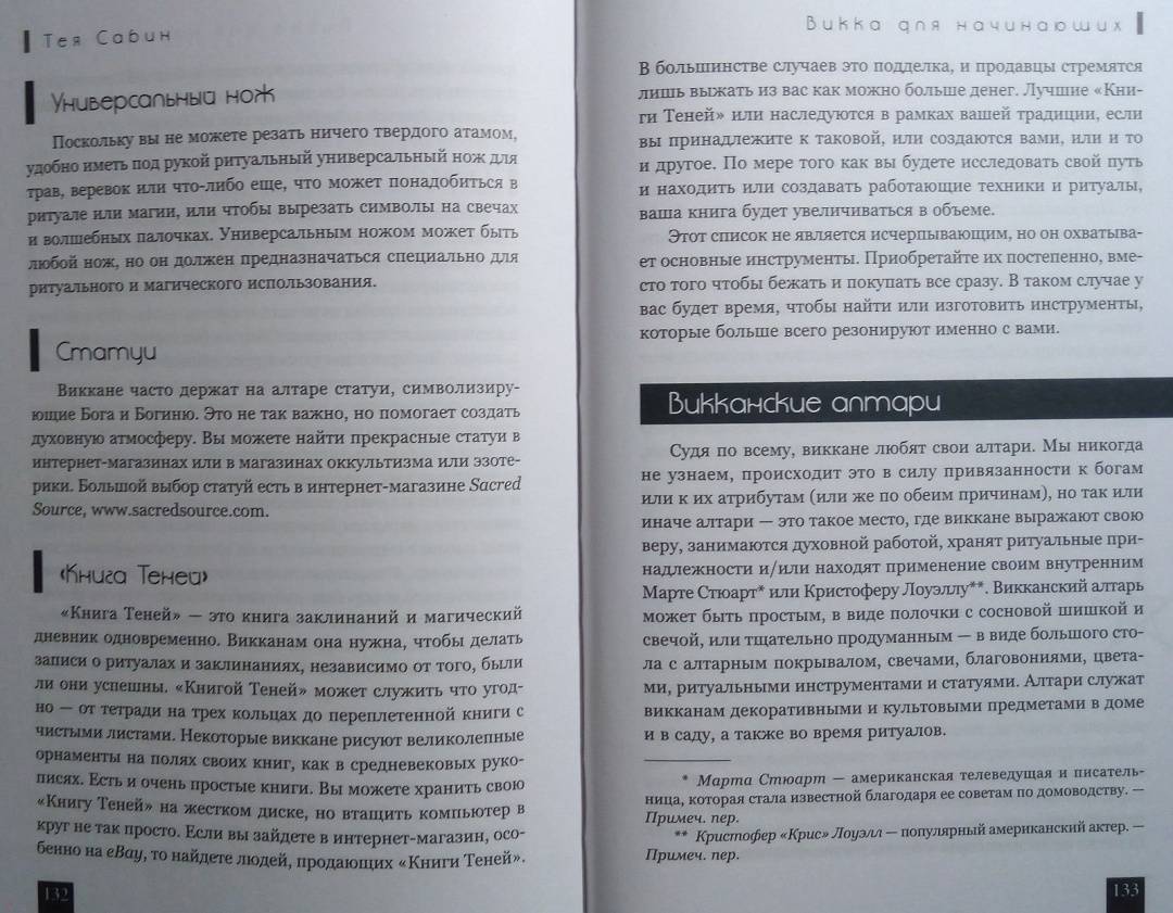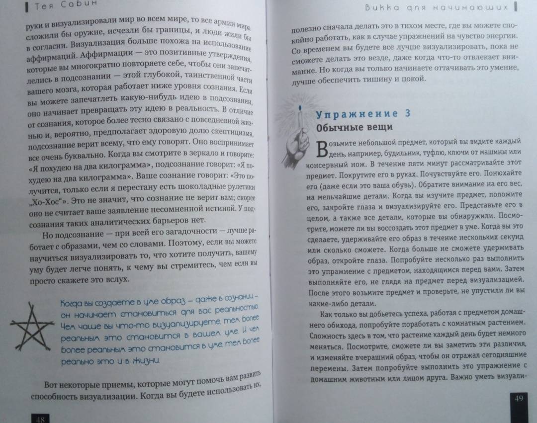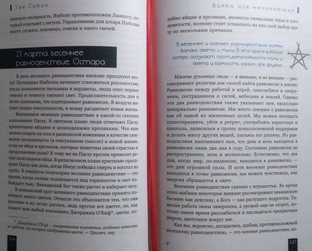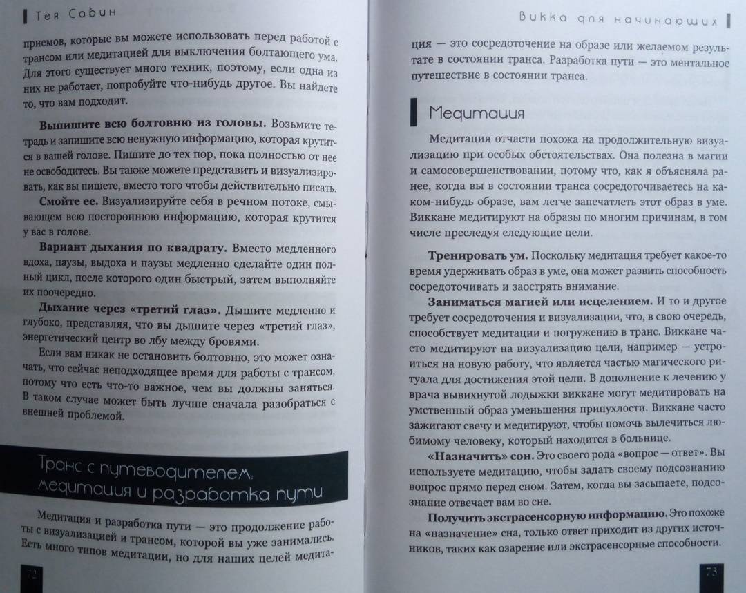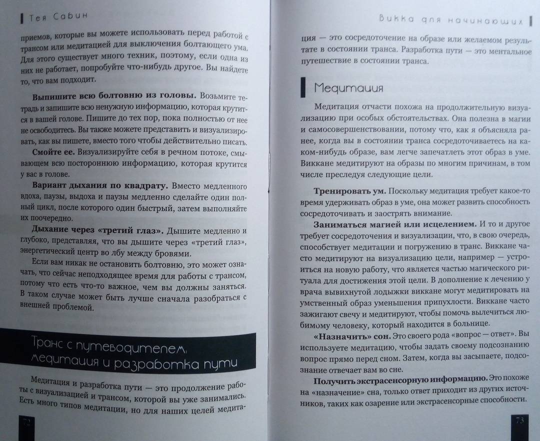 ОписаниеТея Сабин познакомит вас с основами природной магии - викки. Даже если вы впервые держите в руках подобную книгу, прочитав ее, вы…- узнаете о назначении и применении магических инструментов и атрибутов - волшебная палочка, чаша, свеча, метла, соль, вода;- получите рекомендации по оформлению собственного алтаря;- научитесь создавать сакральное пространство (очерчивать и размечать круг);- сможете работать с четырьмя природными стихиями и сторонами света;- пройдете двенадцать шагов к созданию идеального заклинания;- освоите такие викканские практики, как визуализация, заземление, магический щит, транс и медитация;- и найдете ориентиры для поиска вашего личного пути в магии.Силы природы готовы помочь в осуществлении ваших целей, осталось лишь призвать их.Удачного вам ведовства!Почему книгу стоит прочитатьКнига построена по такому принципу, что каждую технику можно применять и отдельно, и как часть более сложного ритуала. Если, к примеру, вы освоите заземление, эта практика, с одной стороны, будет помогать вам снимать стресс и избавляться от негативной энергии, а с другой - станет отличной подготовкой к любому магическому обряду.Таким образом вы сможете использовать новые навыки или сами по себе - для улучшения своего самочувствия, исцеления или получения экстрасенсорной информации. Или, освоив их все к концу чтения, перейти на следующую ступень - к созданию индивидуальных заклинаний и ритуалов для решения более масштабных задач. Все необходимые упражнения, рекомендации и примеры есть в книге!Для кого эта книгаКнига будет интересна и тем, кто впервые приступает к изучению викки, и опытным магам - всегда полезно "сверить часы" с тем, кто практикует не один десяток лет.Тея Сабин с юности была организатором различных викканских организаций, так что в основе книги не только личный опыт автора, но и ее единомышленников.Почему решили издатьВ своей книге Тея Сабин уделяет особое внимание вопросам викканской этики и поиска индивидуального пути в магии. Вы получите информацию обо всех ныне существующих направлениях викки - прямо с магической передовой. А также советы, которые помогут вам определиться, практиковать одному или примкнуть к какой-либо существующей организации (например, в Интернете) - и как не ошибиться в своем выборе.Мы думаем, что "гигиена", о которой пишет Тея Сабин, при выборе средств и союзников на пути к своим целям - важная тема в современном мире, в том числе и в мире магии. Мы хотим, чтобы ваша практика была не только эффективной, но и безопасной.Информация об автореТея Сабин - писательница, с юных лет практикующая викку. В настоящее время она и ее муж руководят ковеном британской традиции на туманном тихоокеанском побережье северо-запада США.СвернутьТея Сабин познакомит вас с основами природной магии - викки. Даже если вы впервые держите в руках подобную книгу, прочитав ее, вы…- узнаете о назначении и применении магических инструментов и атрибутов - волшебная палочка, чаша, свеча, метла, соль, вода;- получите рекомендации по оформлению собственного алтаря;- научитесь создавать сакральное пространство (очерчивать и размечать круг);- сможете работать с четырьмя природными стихиями и сторонами света;- пройдете двенадцать шагов к созданию идеального заклинания;- освоите такие викканские практики, как визуализация, 