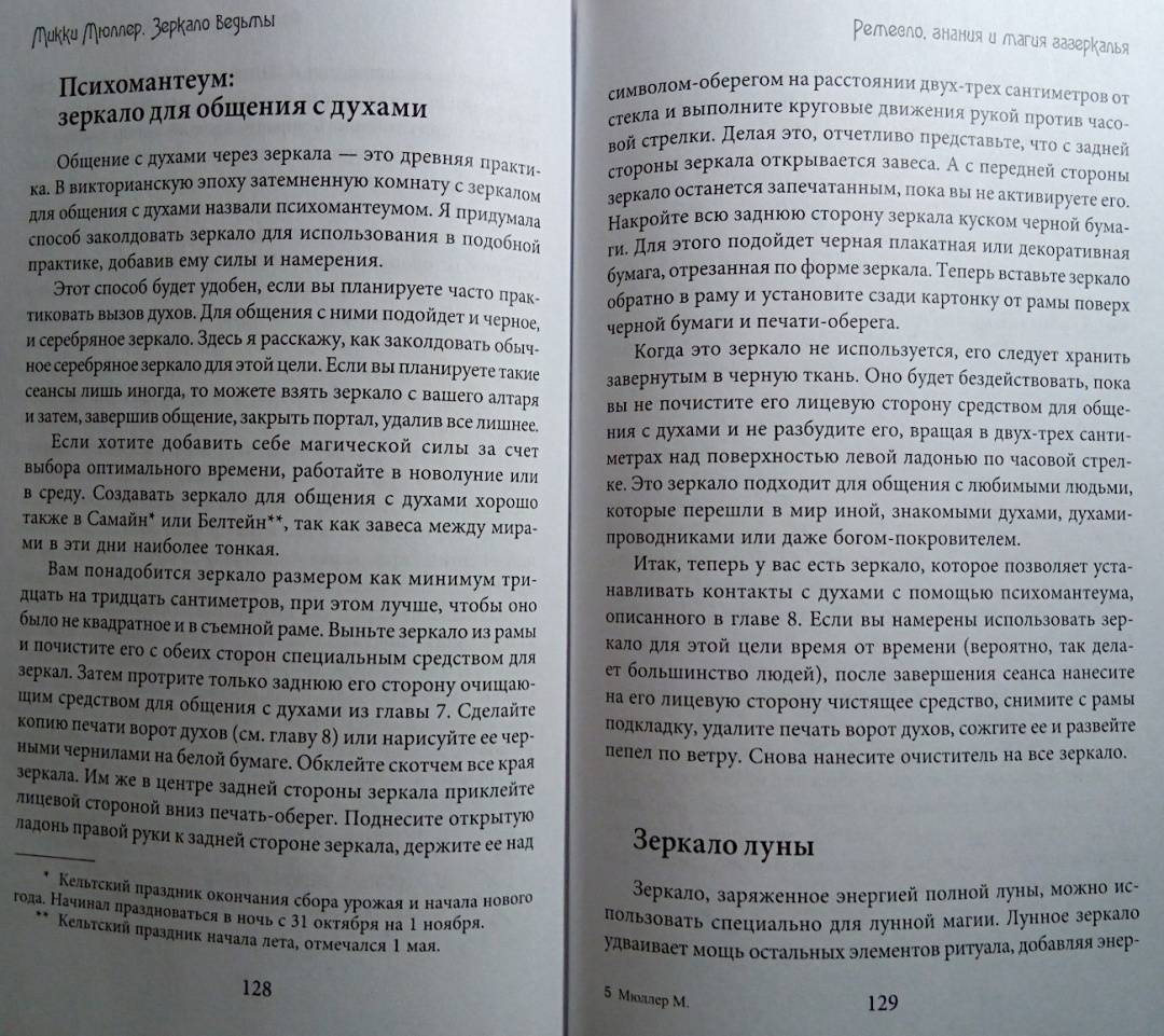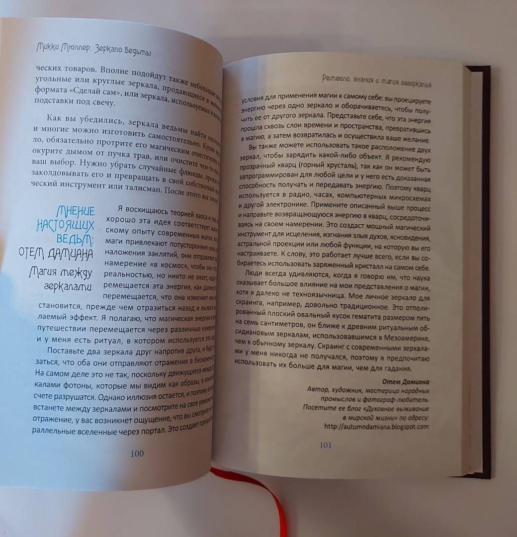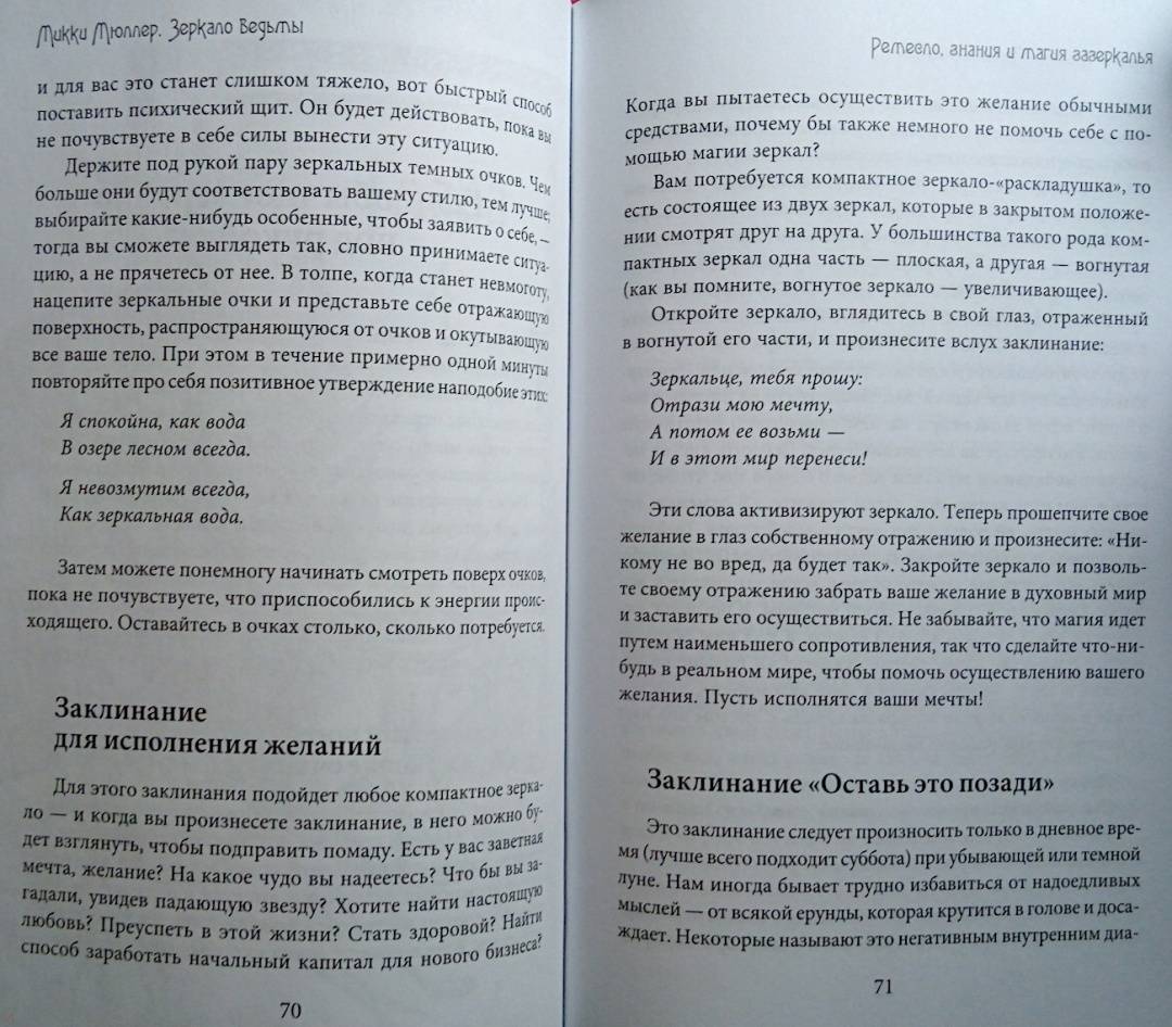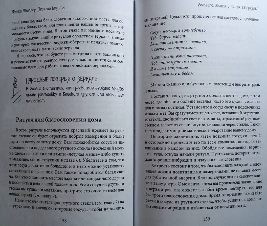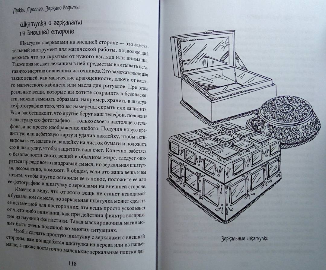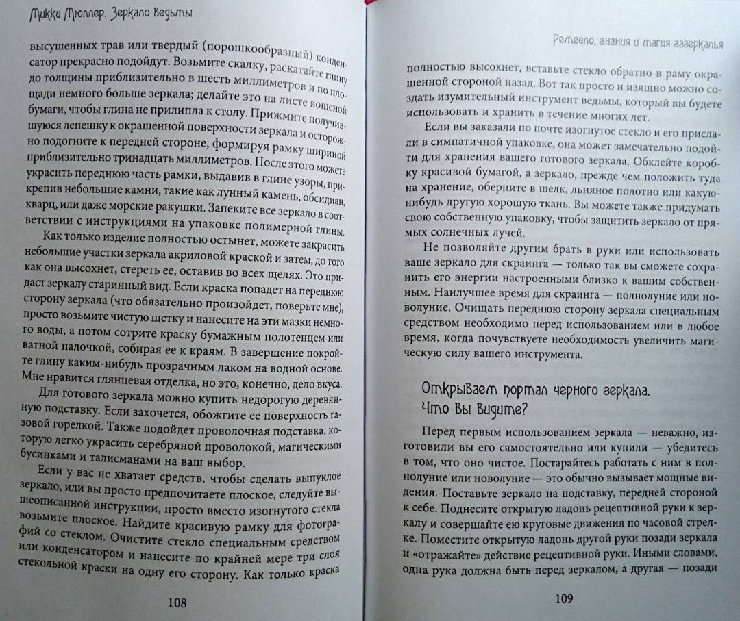 ОписаниеНи один повседневный предмет не окутан такой тайной, как зеркало. Наверное, каждый, разбив его, хоть раз задумывался - не ждет ли его теперь семь лет несчастий. А девушки, принадлежащие к самым разным культурам, знают: при соблюдении определенных условий в зеркале можно увидеть своего суженного. Правда это или вымысел?Из книги Микки Мюллер вы узнаете о магии зеркал абсолютно все - историю, традиции и современные способы использования. Автор рассказывает, как:- изготовить или выбрать идеальное зеркало (а также украшения с кусочками зеркала или зеркальную шкатулку) для достижения магических целей;- использовать травяные отвары для очищения зеркал, чтобы придавать им волшебные свойства - защита, рост уверенности в себе, помощь в любви и так далее;- накладывать заклинания - на исцеление, богатство, красоту и многое другое;- медитировать с помощью зеркал для установления связи с другими мирами.И конечно же, вы освоите скраинг - один из самых древних методов ясновидения и предсказания будущего - получение ответов на любые вопросы с помощью особой фокусировки взгляда на отражающей поверхности.О чем книгаИз первых двух глав вы узнаете историю магического использования зеркал в разных культурах, мифы и легенды, которые их окружали. А также какую роль волшебные зеркала сыграли в популярной культуре - от сказок братьев Гримм до сериала "Герои".В главах 3-6 автор подробно рассказывает о различных видах зеркал и о том, какие из них наиболее пригодны для тех или иных магических целей. Следуя советам, вы сможете найти или изготовить "зеркало ведьмы", соответствующие вашим индивидуальным запросам.А прочитав главы 7-9, вы сможете наделить его необходимыми магическими свойствами, чтобы оно начало работать, оберегая вас или ваш дом, усиливая вашу привлекательность или помогая общаться с духами.Почему книгу стоит прочитатьВы извлечете пользу из этой книги в любом случае.И если захотите освоить магию зеркал всерьез, научившись создавать различные магические зеркала своими руками - от черного зеркала и имитации ртутного стекла до психомантеума (зеркала для общения с духами).И если решите использовать полученные знания в повседневной жизни - в книге вы найдете заклинания и ритуалы, которые наделят магией и зеркальце в пудренице, и трюмо, и даже витрину магазина, в которой вы увидели свое отражение.Для кого эта книгаДля всех, кто хочет улучшить те или иные аспекты своей жизни с помощью магии зеркал - оставить тревожащие события прошлого позади, привлечь счастливую любовь или защититься от завистников.И тех, кто интересуется предсказательными практиками. Даже если вы дока в спиритической работе с зеркалами, Микки Мюллер откроет перед вами новые горизонты.Почему решили издатьКнигу "Зеркало ведьмы" высоко оценили не только читатели, но и специалисты, много лет работающие в области природной магии и предсказательных практик.Перед вами самое полное руководство по магии зазеркалья, которые поможет вам любое зеркало сделать волшебным. Даже автомобильное зеркало заднего вида. И это не шутка. Хотя автор и рассказывает о секретах своей магической работы с большим юмором.Информация об автореМикки Мюллер - писательница, художница и рукоположенный языческий священник. На протяжении многих лет она занимается природной магией, изучает языческие кельт