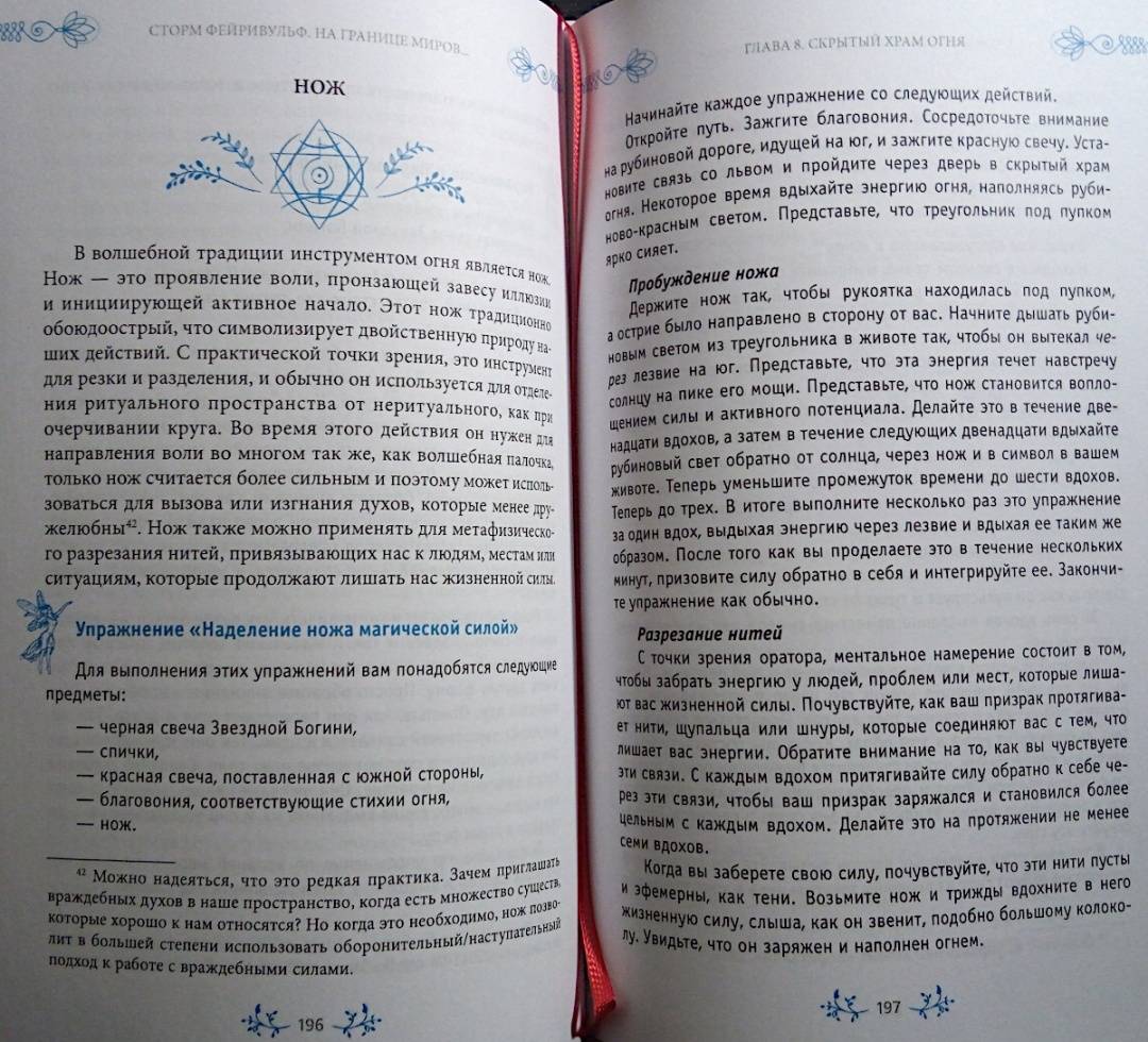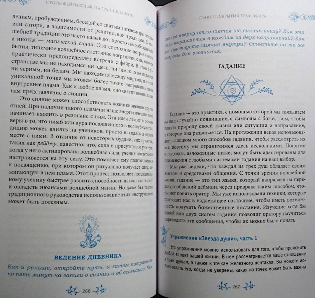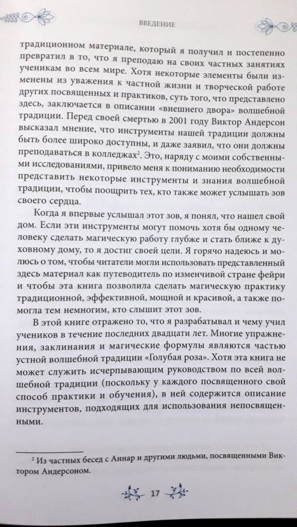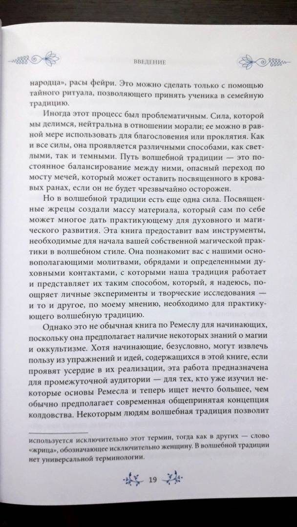 ОписаниеВолшебная традиция - уникальное направление природной магии, которое обладает огромной силой и красотой. Прочитав книгу Сторма Фейривульфа, мага с более чем тридцатилетним стажем, вы получите все инструменты, необходимые для начала вашей собственной практики магии фейри. Узнаете, как устроена Вселенная и откроете для себя ритуалы и разнообразные техники для проецирования сознания в иные миры. Научитесь вызывать волшебный огонь, использовать тень, работать с пентаклем, управлять своей жизненной силой, заключать духовные союзы и путешествовать на другие уровни бытия.Личные эксперименты и творческие исследования - это суть волшебной традиции. Помните о невероятной мощи, заключенной в этих уникальных ритуалах. Возьмите знания, упражнения и рецепты, приведенные в книге, - и используйте их во благо.Книга предназначена для магов среднего и продвинутого уровня.О чем эта книгаИз первой части - "Подготовка к путешествию" - вы узнаете об истоках волшебной традиции и современной истории фейри - могущественной бесплотной расы существ, неразрывно связанных со скрытыми природными процессами и самими истоками колдовства. Познакомитесь с этическим кодексом этого направления в магии и представлениями об устройстве мира и человека. Уже на этом этапе вы начнете практиковать - знакомиться с частями своей души, укреплять силу, погружаться в транс.Читая вторую часть - "Скрытые силы", вы научитесь работать с моделью пяти стихий - Воздух, Огонь, Вода, Земля и Эфир - так, как это принято в волшебной традиции. Большинство ритуалов этой части уникально. При их выполнении будьте осторожны и не торопитесь, осваивайте практики постепенно.В третьей части - "Путешествия между мирами" - рассказывается о Нижнем, Среднем и Верхнем мирах. Вы научитесь безопасно проходить на разные планы бытия, взаимодействовать с их обитателями и благополучно возвращаться в свое тело.Для кого эта книгаДля всех, интересующихся волшебной традицией.Книга адресована в первую очередь колдунам, уже имеющим серьезный опыт практики. Если же вы не знакомы с азами колдовства, то можете восполнять знания по мере чтения, обращаясь к другим доступным источникам.Почему решили издатьКниги по магии - одно из ведущих направлений работы нашего издательства. Много лет мы отбираем для вас все самое лучшее и интересное, и на этой теме, что называется, уже "собаку съели". И хотя книг по колдовству каждый год выходит очень много, ощущается острая нехватка литературы для практикующих с опытом. Книги Сторма Фейривульфа - как раз из этой категории. Если вы уже прочли не одно пособие для начинающих, пора двинуться дальше - на границу с волшебным миром, где и происходят самые впечатляющие чудеса.Информация об автореСторм Фейривульф - писатель, художник и маг с более чем тридцатилетним стажем. Он посвящен в традицию фейри и является обладателем черной волшебной палочки мастера и основателем школы "Голубая роза".Сторм - автор многочисленных статей и книг по эзотерике. Уже два десятка лет он обучает практикам ведовства и народной магии.Еще одна известная книга Сторма для продвинутого уровня - "Запретные тайны волшебного колдовства" - также недавно была выпущена нашим издательством.СвернутьВолшебная традиция - уникальное направление природной магии, которое обладает огромной силой и красотой. П
