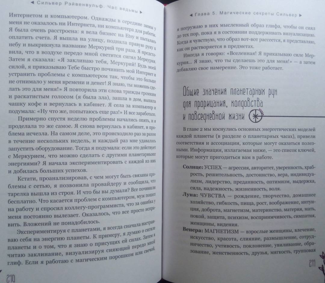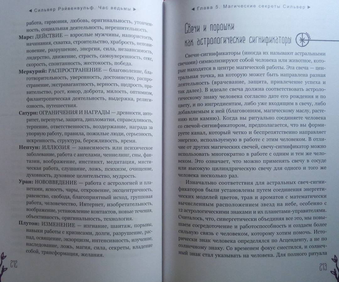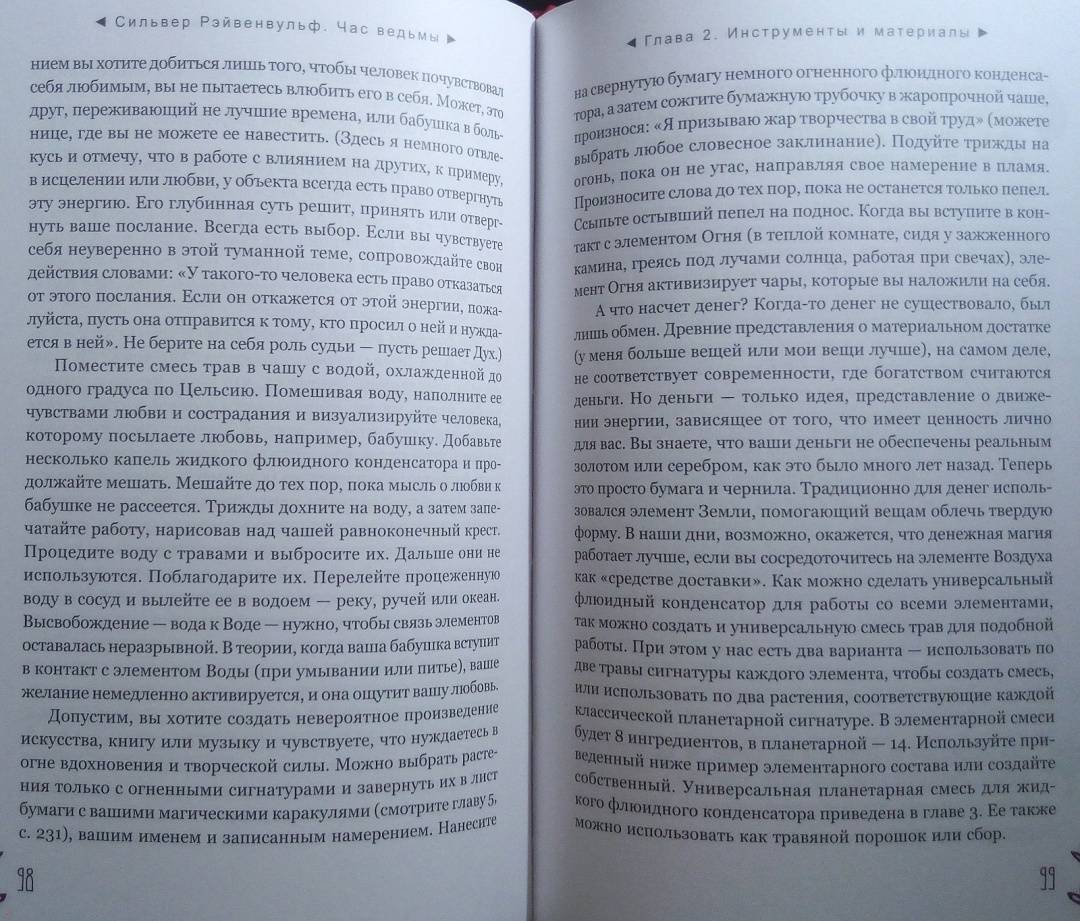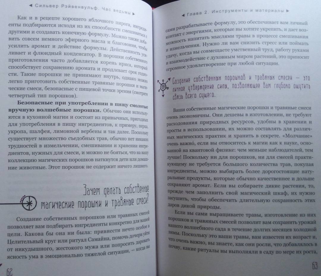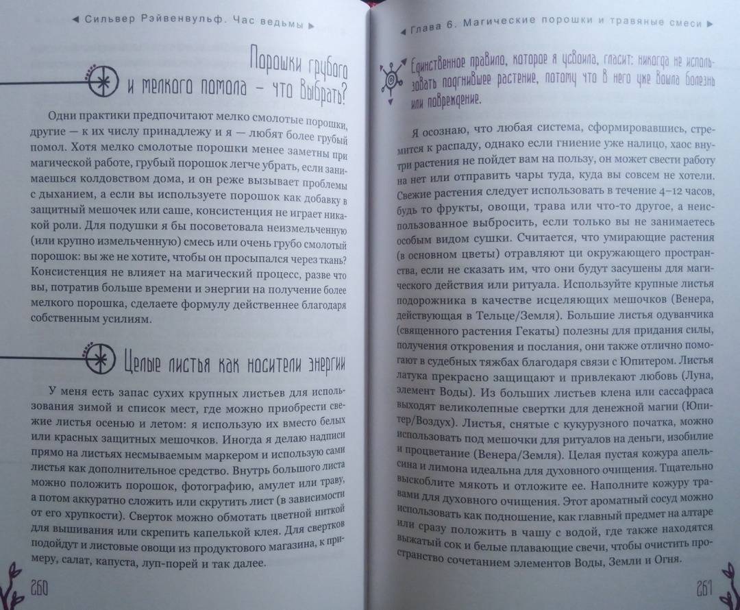 ОписаниеЧас ведьмы - это когда вы чувствуете: "Настало время для магии!" Вас переполняет уверенность, что вы с легкостью решите стоящую перед вами задачу и добьетесь желанного успеха. Для этого вам пригодятся советы известной ведьмы и составительницы растительных сборов со стажем - Сильвер Рэйвенвульф.Особенность книги Сильвер - уникальные авторские формулы травяных смесей и порошков и техники работы с ними. Вы узнаете, как:- изгнать из своей жизни то, чем вы недовольны, - с помощью "молота успеха";- открыть "врата справедливости" - если вы участвуете в судебной тяжбе;- использовать мудрость "белой совы" для принятия важных решений и силу "синей птицы" - для достижения семейного счастья;- избавиться от болезней, долгов, неблагоприятных обстоятельств и влияния чужой злой воли - благодаря "девяти плачущим сестрам".И конечно же, вас ждут различные рецепты защитных и любовных зелий и смесей для привлечения материального благополучия и удачи.Всего - более 100 травяных формул для любой, даже самой сложной, жизненной ситуации.О чем книгаВначале Сильвер Рэйвенвульф рассказывает, как подготовить свои ум и сознание к работе с энергиями и дарами Природы. Затем вы узнаете, какие инструменты и материалы вам понадобятся для составления травяных смесей: что, где и как - вырастить, собрать, купить, засушить, измельчить. И получите важные рекомендации, касающиеся выбора времени для составления формул и порошков и произнесения заклинаний - с учетом фаз Луны, дней недели и планетарных часов.Вы освоите общие принципы создания растительных сборов и техники работы с ними при проведении ритуалов.И сможете заняться магическим творчеством или воспользоваться одной из множества готовых авторских формул Сильвер Рэйвенвульф, приведенных в книге.Почему книгу стоит прочитать"Час ведьмы" - уникальное и наиболее полное руководство по самим основам ведовства, работе с травами. Автор дает практические советы, которые обычно, являясь плодами многолетней личной практики, не попадают в книги. Как усилить магические свойства свечи с помощью вощины. Какой наполнитель лучше выбрать, если вы хотите немного увеличить объем получившейся травяной смеси. Как найти подходящую кастрюлю для магических отваров в самом обычном хозяйственном магазине.Прочитав книгу, вы будете на сто процентов готовы к самостоятельной магической работе.Для кого эта книгаДля тех, кто интересуется виккой и хочет научиться составлять травяные сборы - для достижения своих магических целей.Почему решили издатьСильвер Рэйвенвульф - один из ведущих специалистов в области природной магии в мире, ее книги сыграли важнейшую роль в формировании современной викки. Однако с большинством из них российские читатели до недавнего времени могли ознакомиться лишь на языке оригинала. Мы рады восполнить этот пробел."Час ведьмы" - золотой стандарт книг по ведовству. Книга написана практично, легко и занимательно, в ней много личных наблюдений, которые будут полезны любому магу - и начинающему, и опытному.Информация об автореСильвер Рейвенвульф - писательница, художник, кукольный и свечной мастер, фотограф и предприниматель. Она руководитель Клана Чернолесья, викканской организации, состоящей более чем из шестидесяти ковенов в тридцати штатах и трех международных групп. Сильвер в счастливом браке тридцать пя