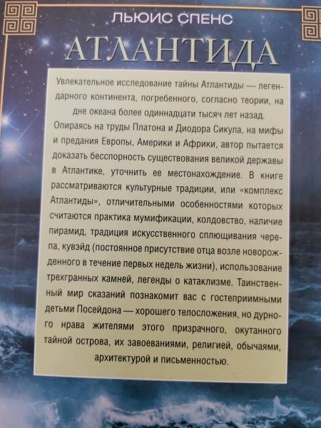 ОписаниеКнига Льюиса Спенса - это исследование тайн цивилизации, которая, как полагают, погрузилась в пучину океана более 11 тысяч лет назад. Ученый выдвигает основные версии и гипотезы существования Атлантиды как высокоразвитого государства с самобытной религией, традициями и культурой, простиравшего господство на все Средиземноморье.Книга Льюиса Спенса - это исследование тайн цивилизации, которая, как полагают, погрузилась в пучину океана более 11 тысяч лет назад. Ученый выдвигает основные версии и гипотезы существования Атлантиды как высокоразвитого государства с самобытной религией, традициями и культурой, простиравшего господство на все Средиземноморье.