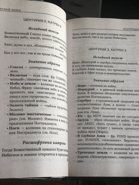 ОписаниеНострадамус широко известен как величайший предсказатель, который когда-либо жил. За всю издательскую историю только Библия обогнала пророчества Нострадамуса по количеству проданных экземпляров.Используя революционный новый анализ, Дмитрий Зима дает новые интерпретации предсказаний, события которых нужно предотвратить.Неужели война между Америкой и Россией неизбежна? Будет ли революция в России? И если будет, чем она закончится? Как избежать покушения на российского президента? И когда наступит золотой век во всем мире?Многие предсказания Нострадамуса уже сбылись, такие как теракт 11 сентября в США, война в Ираке и многое другое. Благодаря новаторским переводам Дмитрия Зимы, читатели теперь могут узнать будущую историю XXI века - до того, как это произойдет.Нострадамус широко известен как величайший предсказатель, который когда-либо жил. За всю издательскую историю только Библия обогнала пророчества Нострадамуса по количеству проданных экземпляров.Используя революционный новый анализ, Дмитрий Зима дает новые интерпретации предсказаний, события которых нужно предотвратить.Неужели война между Америкой и Россией неизбежна? Будет ли революция в России? И если будет, чем она закончится? Как избежать покушения на российского президента? И когда наступит золотой век во всем мире?Многие предсказания Нострадамуса уже сбылись, такие как теракт 11 сентября в США, война в Ираке и многое другое. Благодаря новаторским переводам Дмитрия Зимы, читатели теперь могут узнать будущую историю XXI века - до того, как это произойдет.