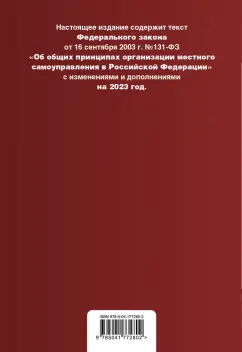 ОписаниеНастоящее издание содержит текст Федерального закона от 16 сентября 2003 года № 131-ФЗ "Об общих принципах организации местного самоуправления в Российской Федерации" с изменениями и дополнениями на 2023 год. Если есть изменения, вступающие в силу позднее, то вместе с редакцией нормы, действующей на эту дату, приводится норма в новой редакции и указывается дата, с которой она вступает в силу.Настоящее издание содержит текст Федерального закона от 16 сентября 2003 года № 131-ФЗ "Об общих принципах организации местного самоуправления в Российской Федерации" с изменениями и дополнениями на 2023 год. Если есть изменения, вступающие в силу позднее, то вместе с редакцией нормы, действующей на эту дату, приводится норма в новой редакции и указывается дата, с которой она вступает в силу.