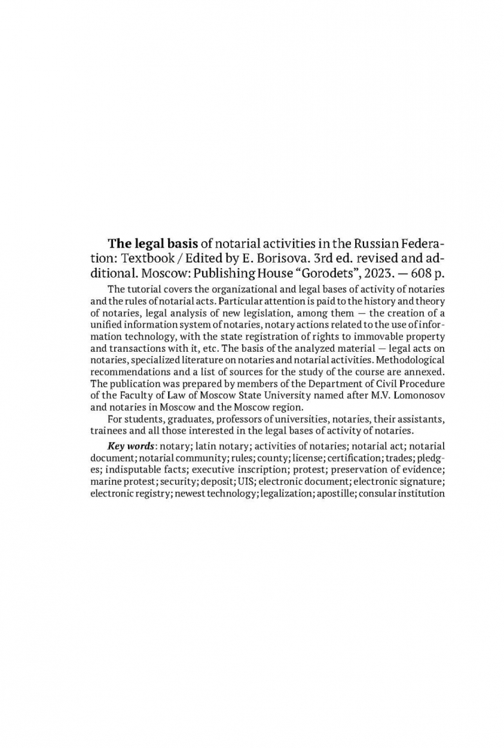 ОписаниеВ учебнике "Правовые основы нотариальной деятельности в Российской Федерации" освещаются организационно-правовые основы деятельности нотариата и правила совершения нотариальных действий. Особое внимание уделено вопросам истории и теории нотариата, анализу законодательных новелл, среди которых - создание единой информационной системы нотариата, нотариальные действия, связанные с использованием информационных технологий, с государственной регистрацией прав на недвижимое имущество и сделок с ним.В основе анализируемого материала - нормативные правовые акты о нотариате, специальная литература по проблемам нотариата и нотариальной деятельности. Представлены методические рекомендации, перечень источников для изучения тем курса.Издание подготовлено сотрудниками кафедры гражданского процесса юридического факультета МГУ имени М.В. Ломоносова и нотариусами г. Москвы и Московской области под редакцией профессора Е.А. Борисовой.Для студентов, аспирантов, преподавателей юридических вузов, нотариусов, их помощников, стажеров и всех тех, кто интересуется правовыми основами нотариальной деятельности.3-е издание, переработанное и дополненное.СвернутьВ учебнике "Правовые основы нотариальной деятельности в Российской Федерации" освещаются организационно-правовые основы деятельности нотариата и правила совершения нотариальных действий. Особое внимание уделено вопросам истории и теории нотариата, анализу законодательных новелл, среди которых - создание единой информационной системы нотариата, нотариальные действия, связанные с использованием информационных технологий, с государственной регистрацией прав на недвижимое имущество и сделок с ним.В основе анализируемого материала - нормативные правовые акты о нотариате, специальная литература по проблемам нотариата и нотариальной деятельности. Представлены методические рекомендации, перечень источников для изучения тем курса.Издание подготовлено сотрудниками кафедры гражданского процесса юридического факультета МГУ имени М.В. Ломоносова и нотариусами г. Москвы и Московской области под редакцией профессора Е.А. Борисовой.Для студентов, аспирантов, преподавателей юридических вузов, нотариусов, их помощников, стажеров и всех тех, кто интересуется правовыми основами нотариальной деятельности.3-е издание, переработанное и дополненное.СвернутьСвернуть