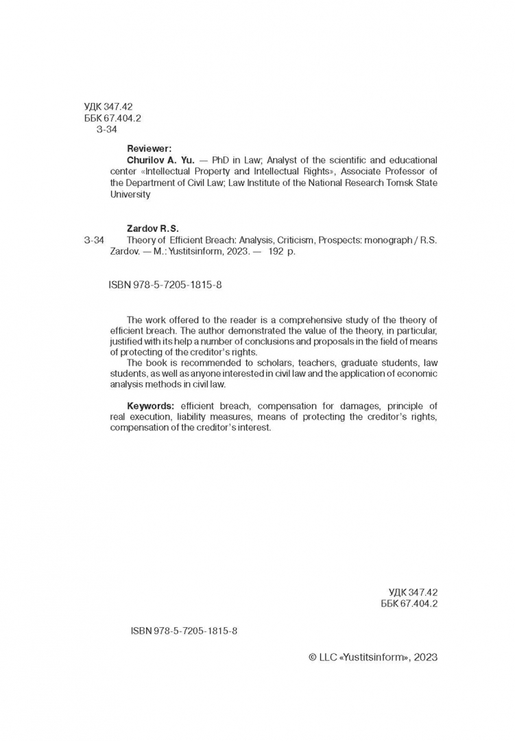 ОписаниеПредлагаемая читателю работа представляет собой комплексное исследование теории эффективного нарушения. Автор продемонстрировал ценность теории, в частности, обосновал с ее помощью ряд выводов и предложений в области средств защиты прав кредитора.Книга рекомендована ученым, преподавателям, аспирантам, студентам юридических вузов, а также всем интересующимся вопросами гражданского права и применения методов экономического анализа в гражданском праве.Предлагаемая читателю работа представляет собой комплексное исследование теории эффективного нарушения. Автор продемонстрировал ценность теории, в частности, обосновал с ее помощью ряд выводов и предложений в области средств защиты прав кредитора.Книга рекомендована ученым, преподавателям, аспирантам, студентам юридических вузов, а также всем интересующимся вопросами гражданского права и применения методов экономического анализа в гражданском праве.