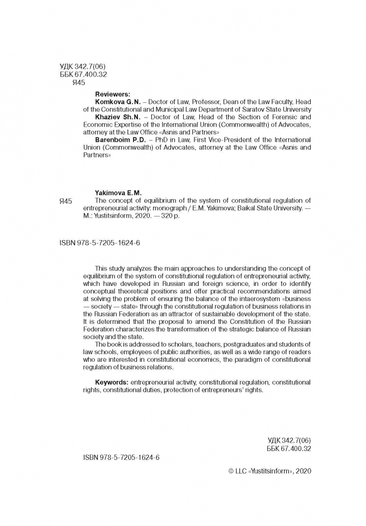 -Е. Якимова: Концепция равновесия системы конст регули пред деяСудебная системаАдвокатура. НотариатЮриспруденцияПравоохранительные органы. КриминалистикаКонституционное правоОхрана трудаГосударственное правоТрудовое право. Право социального обеспеченияЭкологическое, лесное, водное, горное правоИнтеллектуальное правоГосударственное и муниципальное управлениеЗемельное правоЖилищное, семейное правоАдминистративное правоТеория и история государства и праваУголовное правоМеждународное правоЮридическая консультацияЗаконы, кодексы и комментарииГражданское право