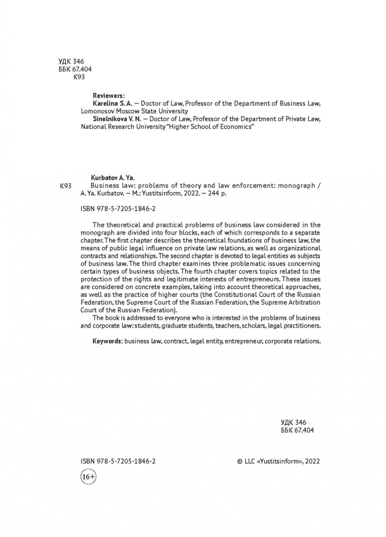 ОписаниеТеоретические и практические проблемы предпринимательского права, рассматриваемые в монографии, разбиты на четыре блока, каждому из которых соответствует отдельная глава. В первой главе дается характеристика теоретическим основам предпринимательского права, средствам публично-правового воздействия на частноправовые отношения, а также организационным договорам и отношениям. Вторая глава посвящена юридическим лицам как субъектам предпринимательского права. В третьей главе исследуются три проблемных вопроса, касающиеся отдельных видов объектов предпринимательской деятельности. В четвертой главе раскрываются темы, связанные с защитой прав и законных интересов предпринимателей. Указанные вопросы рассматриваются на конкретных примерах с учетом теоретических подходов, а также практики высших судов (Конституционного Суда РФ, Верховного Суда РФ, Высшего Арбитражного Суда РФ).Книга адресована всем, кто интересуется проблемами предпринимательского и корпоративного права: студентам, аспирантам, преподавателям, ученым, юристам-практикам.СвернутьТеоретические и практические проблемы предпринимательского права, рассматриваемые в монографии, разбиты на четыре блока, каждому из которых соответствует отдельная глава. В первой главе дается характеристика теоретическим основам предпринимательского права, средствам публично-правового воздействия на частноправовые отношения, а также организационным договорам и отношениям. Вторая глава посвящена юридическим лицам как субъектам предпринимательского права. В третьей главе исследуются три проблемных вопроса, касающиеся отдельных видов объектов предпринимательской деятельности. В четвертой главе раскрываются темы, связанные с защитой прав и законных интересов предпринимателей. Указанные вопросы рассматриваются на конкретных примерах с учетом теоретических подходов, а также практики высших судов (Конституционного Суда РФ, Верховного Суда РФ, Высшего Арбитражного Суда РФ).Книга адресована всем, кто интересуется проблемами предпринимательского и корпоративного права: студентам, аспирантам, преподавателям, ученым, юристам-практикам.СвернутьСвернуть