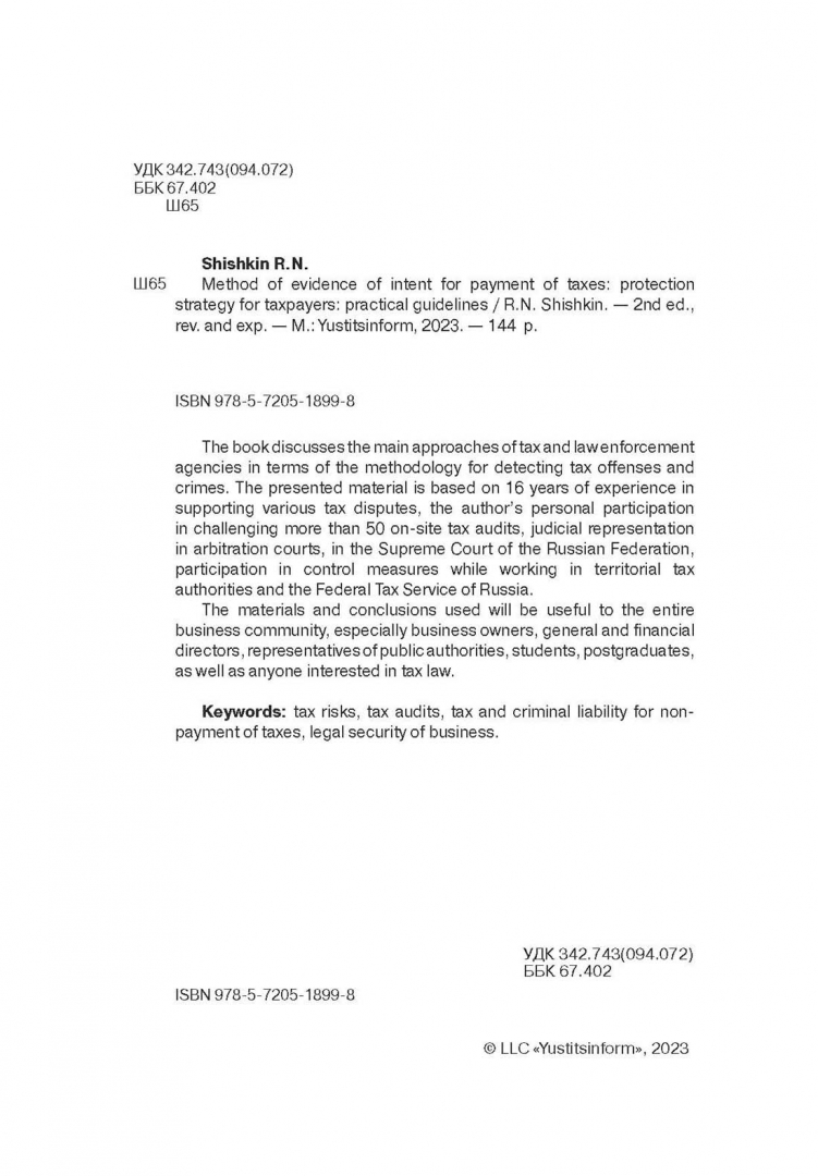 ОписаниеВ книге рассматриваются основные подходы налоговых и правоохранительных органов в части методики выявления налоговых правонарушений и преступлений. Представленный материал основан на 16-летнем опыте сопровождения различных налоговых споров, личном участии автора в оспаривании более 50 выездных налоговых проверок, судебном представительстве в арбитражных судах, в Верховном суде РФ, участии в проведении контрольных мероприятий в период работы в территориальных налоговых органах и ФНС России.Использованные материалы и выводы будут полезны всему бизнес-сообществу, в особенности собственникам бизнеса, генеральным и финансовым директорам, представителям органов государственной власти, студентам, аспирантам, а также всем интересующимся налоговым правом.2-е издание, переработанное и дополненное.В книге рассматриваются основные подходы налоговых и правоохранительных органов в части методики выявления налоговых правонарушений и преступлений. Представленный материал основан на 16-летнем опыте сопровождения различных налоговых споров, личном участии автора в оспаривании более 50 выездных налоговых проверок, судебном представительстве в арбитражных судах, в Верховном суде РФ, участии в проведении контрольных мероприятий в период работы в территориальных налоговых органах и ФНС России.Использованные материалы и выводы будут полезны всему бизнес-сообществу, в особенности собственникам бизнеса, генеральным и финансовым директорам, представителям органов государственной власти, студентам, аспирантам, а также всем интересующимся налоговым правом.2-е издание, переработанное и дополненное.