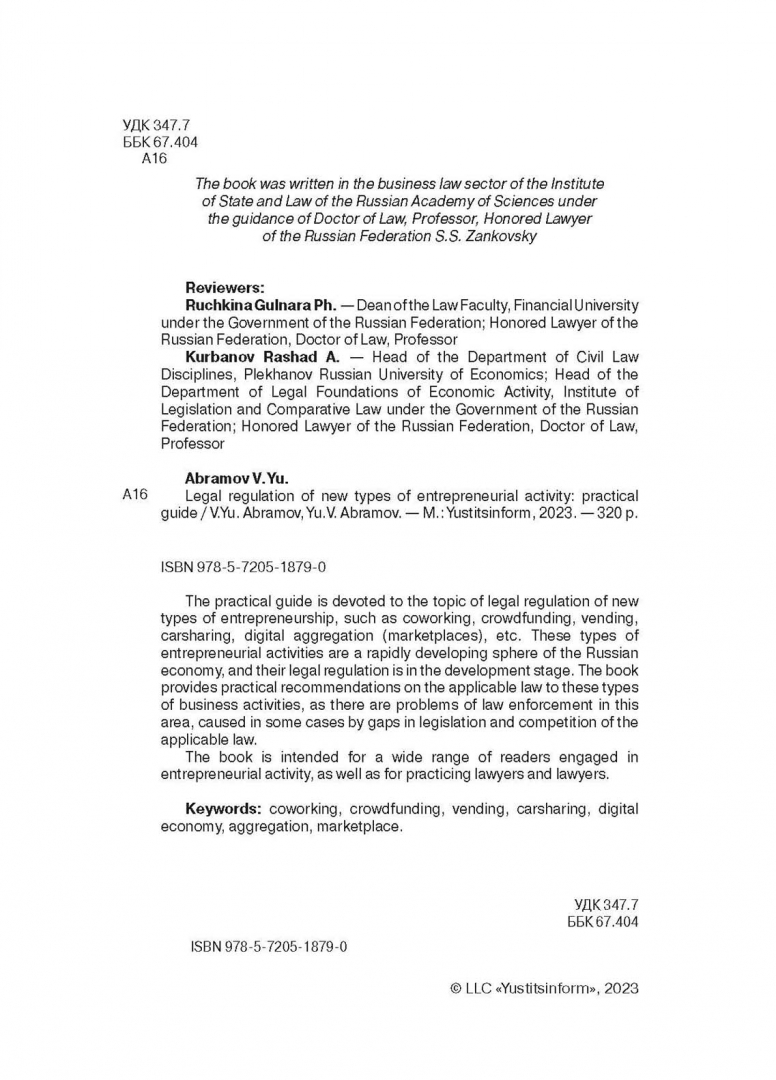 ОписаниеПрактическое пособие посвящено теме правового регулирования новых видов предпринимательства, таких как коворкинг, краудфандинг, вендинг, каршеринг, цифровое агрегирование (мар-кетплейсы) и т.п. Эти виды предпринимательской деятельности являются быстроразвивающейся сферой экономики России, а их правовое регулирование находится в стадии развития. В книге даны практические рекомендации по применимому праву к данным видам предпринимательской деятельности, так как в этой области существуют проблемы правоприменения, обусловленные в ряде случаев пробелами в законодательстве и конкуренцией норм применимого права.Книга предназначена для широкого круга читателей, занятых в предпринимательской деятельности, а также для практикующих юристов и адвокатов.Практическое пособие посвящено теме правового регулирования новых видов предпринимательства, таких как коворкинг, краудфандинг, вендинг, каршеринг, цифровое агрегирование (мар-кетплейсы) и т.п. Эти виды предпринимательской деятельности являются быстроразвивающейся сферой экономики России, а их правовое регулирование находится в стадии развития. В книге даны практические рекомендации по применимому праву к данным видам предпринимательской деятельности, так как в этой области существуют проблемы правоприменения, обусловленные в ряде случаев пробелами в законодательстве и конкуренцией норм применимого права.Книга предназначена для широкого круга читателей, занятых в предпринимательской деятельности, а также для практикующих юристов и адвокатов.