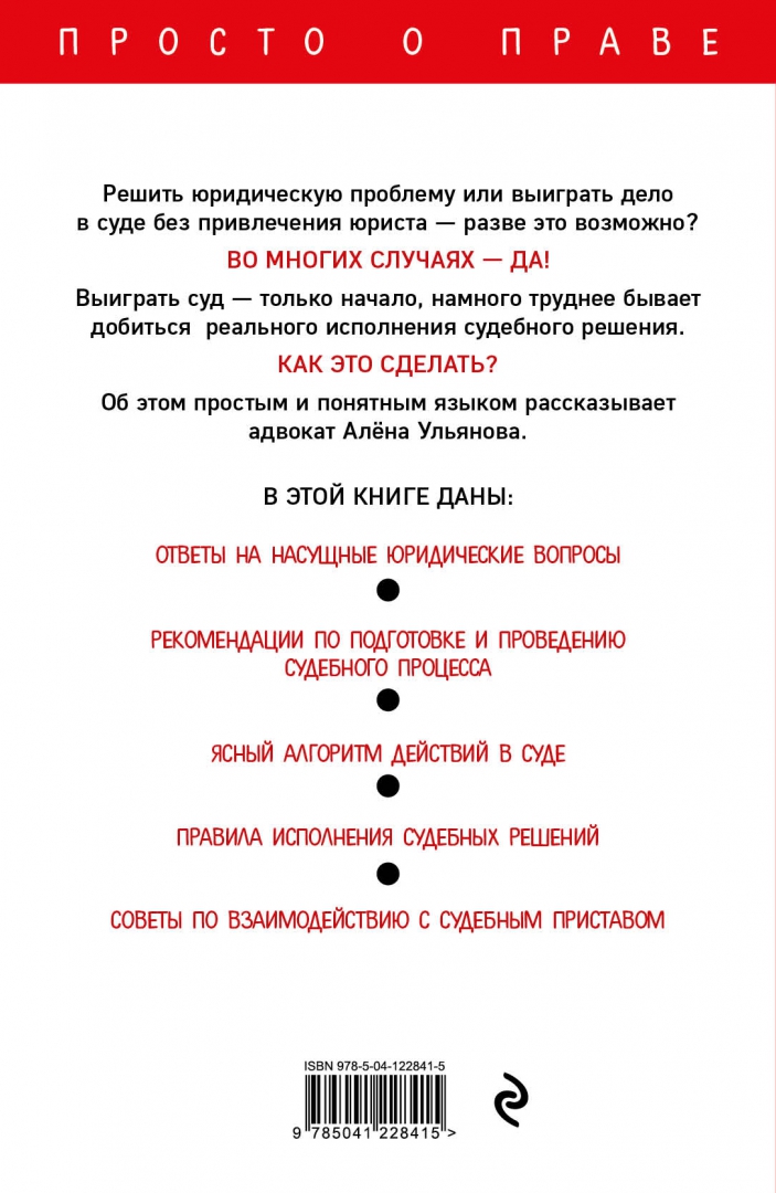 -Алена Ульянова: Как самому выиграть суд и добиться исполнения судебного решенияСудебная системаАдвокатура. НотариатЮриспруденцияПравоохранительные органы. КриминалистикаКонституционное правоОхрана трудаГосударственное правоТрудовое право. Право социального обеспеченияЭкологическое, лесное, водное, горное правоИнтеллектуальное правоГосударственное и муниципальное управлениеЗемельное правоЖилищное, семейное правоАдминистративное правоТеория и история государства и праваУголовное правоМеждународное правоОсобые виды праваЗаконы, кодексы и комментарииГражданское право