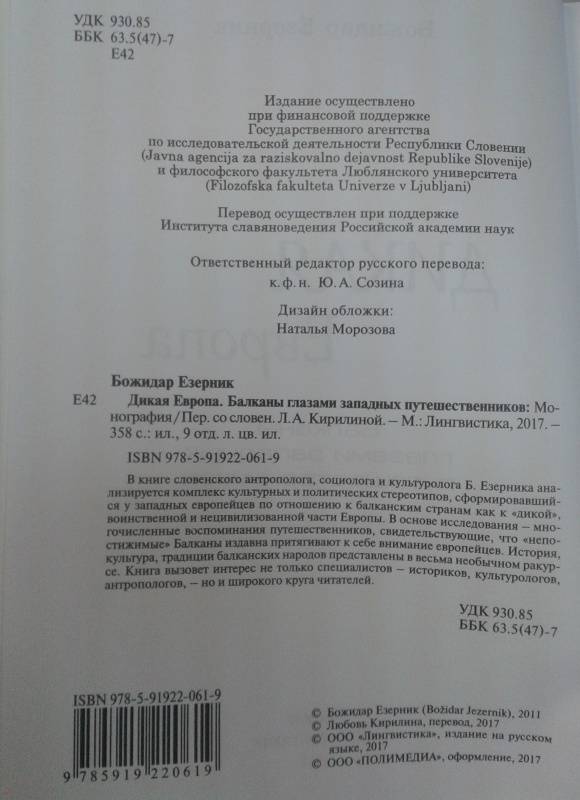 ОписаниеВ книге словенского антрополога, социолога и культуролога Б. Езерника анализируется комплекс культурных и политических стереотипов, сформировавшийся у западных европейцев по отношению к балканским странам как к "дикой", воинственной и нецивилизованной части Европы. В основе исследования - многочисленные воспоминания путешественников, свидетельствующие, что "непостижимые" Балканы издавна притягивают к себе внимание европейцев. История, культура, традиции балканских народов представлены в весьма необычном ракурсе. Книга вызовет интерес не только специалистов - историков, культурологов, антропологов, - но и широкого круга читателей.В книге словенского антрополога, социолога и культуролога Б. Езерника анализируется комплекс культурных и политических стереотипов, сформировавшийся у западных европейцев по отношению к балканским странам как к "дикой", воинственной и нецивилизованной части Европы. В основе исследования - многочисленные воспоминания путешественников, свидетельствующие, что "непостижимые" Балканы издавна притягивают к себе внимание европейцев. История, культура, традиции балканских народов представлены в весьма необычном ракурсе. Книга вызовет интерес не только специалистов - историков, культурологов, антропологов, - но и широкого круга читателей.