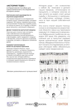 Описание"История тебя" - интерактивное пособие для самостоятельного исследования истории семьи.Настольная книга-руководство по изучению родословнойЭто первое издание по исследованию истории семьи. Семейное древо человека содержит 126 прямых предшественников в 6 поколениях! Теперь вы сможете узнать не только их имена, но и судьбы, и связать ваше прошлое с настоящим и будущим.Делает генеалогию доступной каждомуПростые шаги помогут вам составить план собственного исследования: проанализировать личные документы и фотографии, найти сведения о предках в Интернете, получить данные из архивов и фондов, составить и оформить семейное древо.Содержит рекомендации более 40 экспертов-практиковКоманда "Проекта Жизнь", наши друзья и коллеги - историки, генеалоги, архивисты, дизайнеры, журналисты, геральдисты - провели многие месяцы в совместной работе над этой книгой. Мы научим вас методам работы с историческими документами и архивами и поможем ориентироваться в процессе генеалогического поиска.История рода - это знакомство с собой. За именами и датами наших предков, отголосками их прошлого, о котором многие из нас ничего не знают, стоят целые судьбы с большими и маленькими событиями, которые сложились в пазл нашей собственной жизни.Эта книга станет вашим помощником в исследовании родословной. Вместе с вами мы проложим маршрут от старенького документа в бабушкиной тумбочке до находок XVII века. Мы уверены, что смелый шаг в прошлое подарит яркие впечатления всей вашей семье, объединит близких и положит начало исследованию, в котором "История тебя" обязательно найдет свое продолжение.Желаем увлекательного путешествия!Свернуть"История тебя" - интерактивное пособие для самостоятельного исследования истории семьи.Настольная книга-руководство по изучению родословнойЭто первое издание по исследованию истории семьи. Семейное древо человека содержит 126 прямых предшественников в 6 поколениях! Теперь вы сможете узнать не только их имена, но и судьбы, и связать ваше прошлое с настоящим и будущим.Делает генеалогию доступной каждомуПростые шаги помогут вам составить план собственного исследования: проанализировать личные документы и фотографии, найти сведения о предках в Интернете, получить данные из архивов и фондов, составить и оформить семейное древо.Содержит рекомендации более 40 экспертов-практиковКоманда "Проекта Жизнь", наши друзья и коллеги - историки, генеалоги, архивисты, дизайнеры, журналисты, геральдисты - провели многие месяцы в совместной работе над этой книгой. Мы научим вас методам работы с историческими документами и архивами и поможем ориентироваться в процессе генеалогического поиска.История рода - это знакомство с собой. За именами и датами наших предков, отголосками их прошлого, о котором многие из нас ничего не знают, стоят целые судьбы с большими и маленькими событиями, которые сложились в пазл нашей собственной жизни.Эта книга станет вашим помощником в исследовании родословной. Вместе с вами мы проложим маршрут от старенького документа в бабушкиной тумбочке до находок XVII века. Мы уверены, что смелый шаг в прошлое подарит яркие впечатления всей вашей семье, объединит близких и положит начало исследованию, в котором "История тебя" обязательно найдет свое продолжение.Желаем увлекательного путешествия!СвернутьСверну
