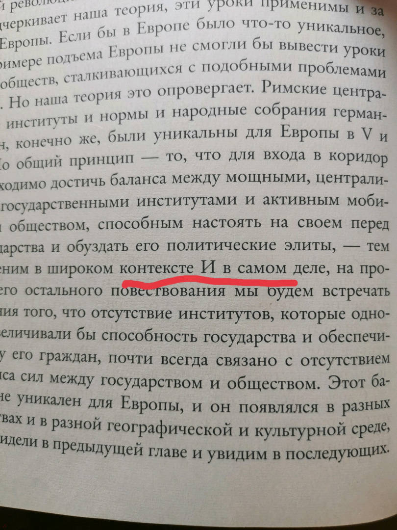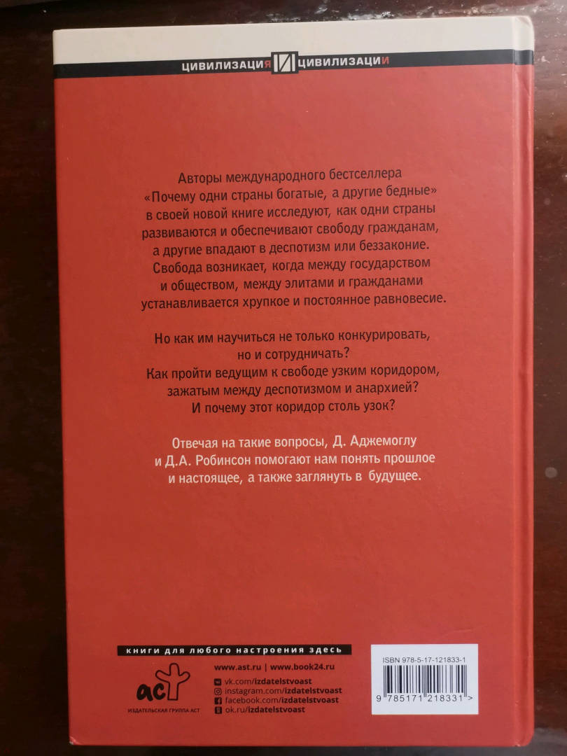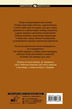 ОписаниеАвторы международного бестселлера "Почему одни страны богатые, а другие бедные" в своей новой книге исследуют, как одни страны развиваются и обеспечивают свободу гражданам, а другие впадают в деспотизм или беззаконие. Свобода возникает, когда между государством и обществом, между элитами и гражданами устанавливается хрупкое и постоянное равновесие. Но как им научиться не только конкурировать, но и сотрудничать?Как пройти ведущим к свободе узким коридором, зажатым между деспотизмом и анархией?И почему этот коридор столь узок?Отвечая на такие вопросы, Д. Аджемоглу и Д.А. Робинсон помогают нам понять прошлое и настоящее, а также заглянуть в будущее.Авторы международного бестселлера "Почему одни страны богатые, а другие бедные" в своей новой книге исследуют, как одни страны развиваются и обеспечивают свободу гражданам, а другие впадают в деспотизм или беззаконие. Свобода возникает, когда между государством и обществом, между элитами и гражданами устанавливается хрупкое и постоянное равновесие. Но как им научиться не только конкурировать, но и сотрудничать?Как пройти ведущим к свободе узким коридором, зажатым между деспотизмом и анархией?И почему этот коридор столь узок?Отвечая на такие вопросы, Д. Аджемоглу и Д.А. Робинсон помогают нам понять прошлое и настоящее, а также заглянуть в будущее.