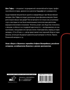 ОписаниеШон Тафер - специалист позднеримской и византийской истории, профессор в Школе истории, археологии и религии Кардиффского университета. Существование евнухов было одной из определяющих черт Византийской империи. Шон Тафер исследует различные грани феномена евнухов. Какие роли играли евнухи при дворе? Они встречаются не только как услужливые слуги; некоторые из них были влиятельными политическими деятелями, видными епископами и монахами. Читатель узнает, как общество относилось к евнухам, особенно к их гендерной идентичности - воспринимались ли они мужчинами, женщинами или третьим полом. Охватывая весь период истории империи, с IV по XV век н. э., автор представляет всесторонний обзор истории евнухов, используя обширный сравнительный материал из Китая, Персии, Османской империи и т. д. Книга "Евнухи в Византии" переведена Андреем Виноградовым, российским историком, исследователем Византии и раннего христианства.Шон Тафер - специалист позднеримской и византийской истории, профессор в Школе истории, археологии и религии Кардиффского университета. Существование евнухов было одной из определяющих черт Византийской империи. Шон Тафер исследует различные грани феномена евнухов. Какие роли играли евнухи при дворе? Они встречаются не только как услужливые слуги; некоторые из них были влиятельными политическими деятелями, видными епископами и монахами. Читатель узнает, как общество относилось к евнухам, особенно к их гендерной идентичности - воспринимались ли они мужчинами, женщинами или третьим полом. Охватывая весь период истории империи, с IV по XV век н. э., автор представляет всесторонний обзор истории евнухов, используя обширный сравнительный материал из Китая, Персии, Османской империи и т. д. Книга "Евнухи в Византии" переведена Андреем Виноградовым, российским историком, исследователем Византии и раннего христианства.