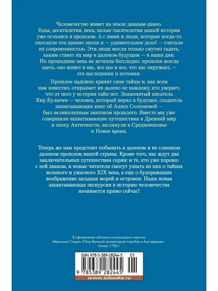 ОписаниеЧеловечество живет на земле давным-давно. Годы, десятилетия, века, целые тысячелетия нашей истории уже остались в прошлом. А с ними и люди, которые когда-то населяли эти давние эпохи и — удивительное дело! — считали их современностью. Эти люди могли только смутно гадать, каким станет их мир в далеком будущем — в наши дни. Но прошедшие века не исчезли бесследно: прошлое всегда здесь, оно живет в нас, все мы и все, что нас окружает, — его наследники и потомки.Прошлое надежно хранит свои тайны и, как всем нам известно, открывает их далеко не каждому, кто уверяет, что от него у истории тайн нет. Знаменитый писатель Кир Булычев — человек, который верил в будущее, создатель захватывающих книг об Алисе Селезневой — был великолепным знатоком прошлого. Вместе мы уже совершили захватывающие путешествия в Древний мир и эпоху Античности, заглянули в Средневековье и Новое время.Теперь же нам предстоит побывать в далеком и не слишком далеком прошлом нашей страны. Кроме того, нас ждут два заключительных путешествия серии: и те, кто уже хорошо с ней знаком, и новые читатели смогут узнать из них о тайнах великого и ужасного XIX века, а еще о будоражащих воображение загадках морей и островов. Наша новая захватывающая экскурсия в историю человечества начинается прямо сейчас!